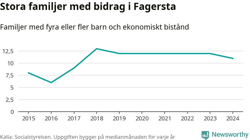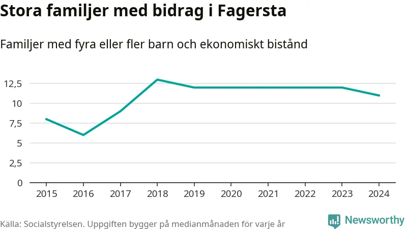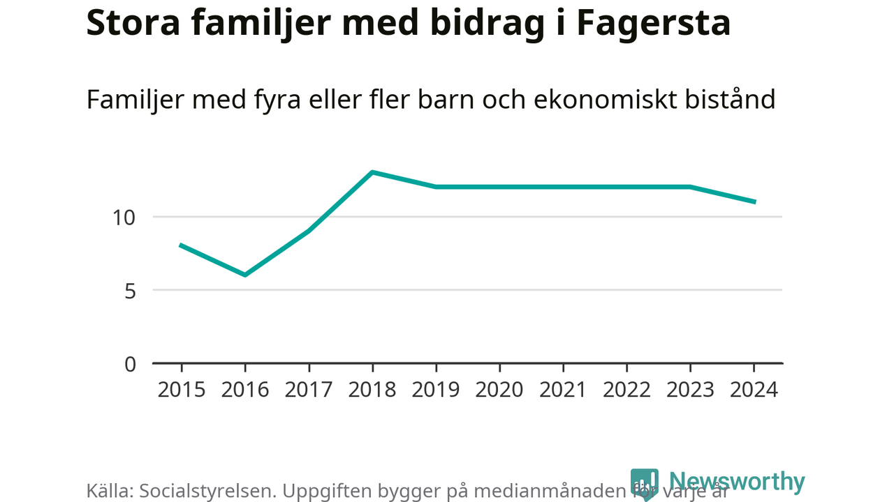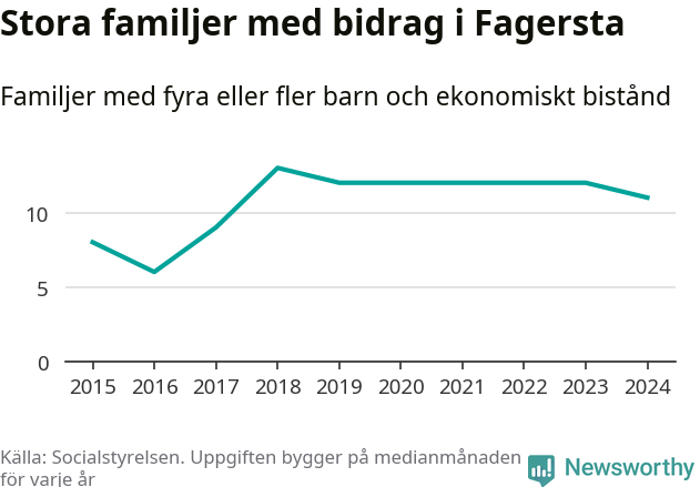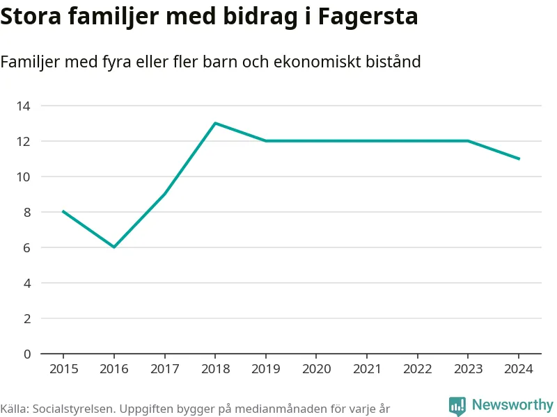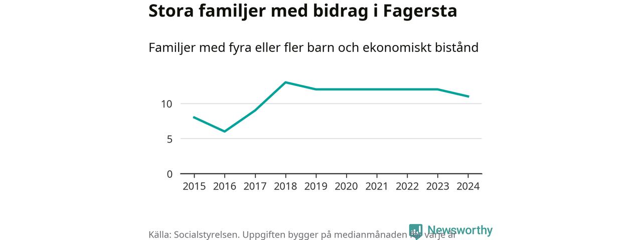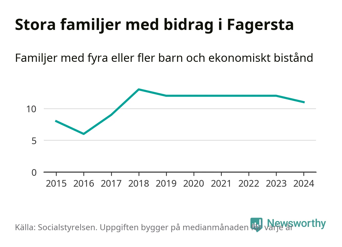 Fagersta kommun tillhör de kommuner i landet som har har högst andel av befolkningen som fick ekonomiskt bistånd 2024. Sammanlagt 325 hushåll fick någon gång under året ekonomiskt bistånd, enligt Socialstyrelsens statistik. Av dem var 112 barnfamiljer. Vi har inte siffror på hur många unika familjer med fyra barn eller fler det handlar om, men enligt Socialstyrelsens preliminära månadsstatistik betalades ekonomiskt bistånd ut till mellan åtta och tolv familjer per månad under fjolåret – i snitt elva familjer.