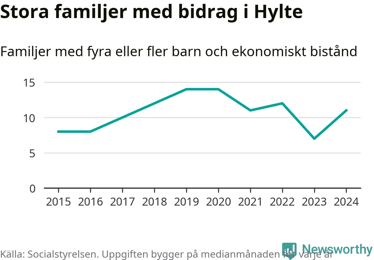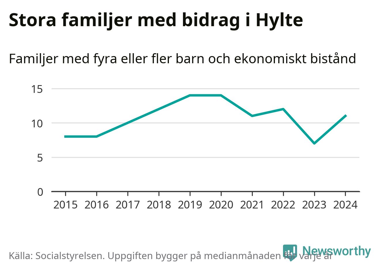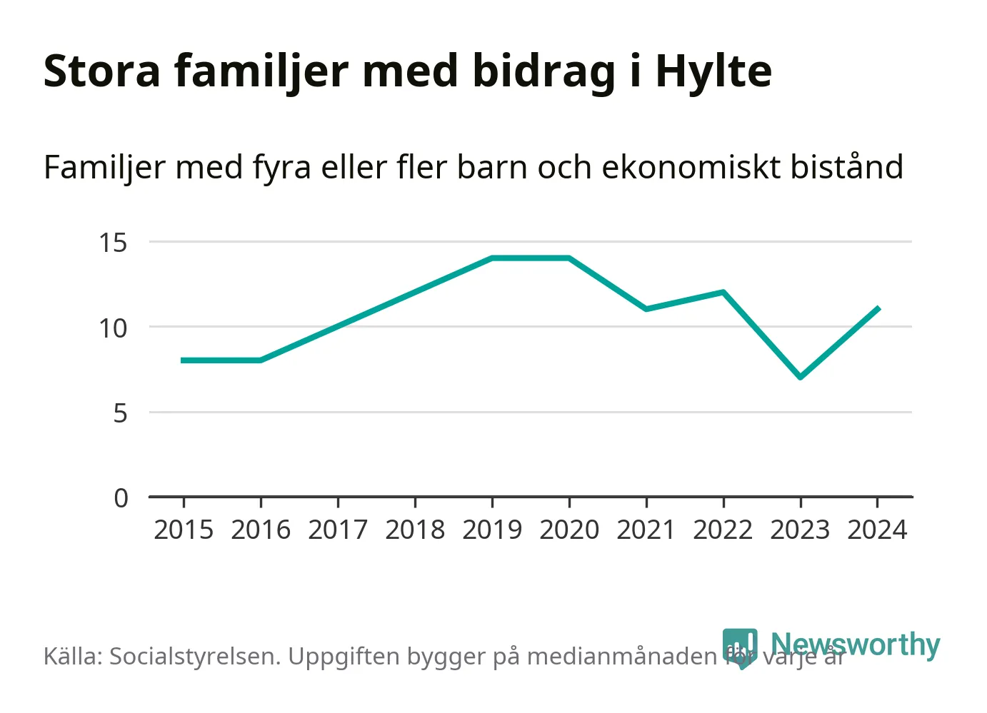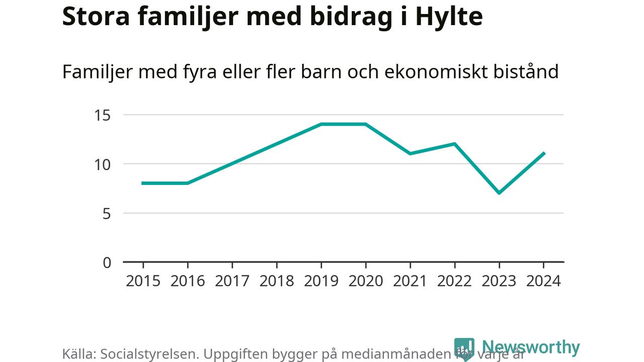 Hylte kommun tillhör de kommuner i landet som har har högst andel av befolkningen som fick ekonomiskt bistånd 2024. Sammanlagt 184 hushåll fick någon gång under året ekonomiskt bistånd, enligt Socialstyrelsens statistik. Av dem var 81 barnfamiljer. Vi har inte siffror på hur många unika familjer med fyra barn eller fler det handlar om, men enligt Socialstyrelsens preliminära månadsstatistik betalades ekonomiskt bistånd ut till mellan någon eller några enstaka och 13 familjer per månad under fjolåret – i snitt elva familjer.