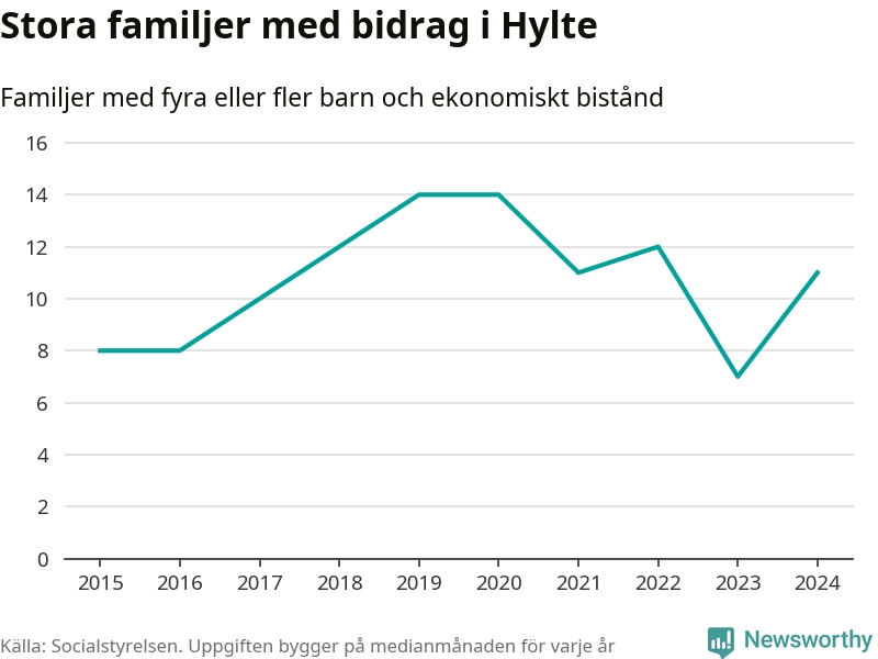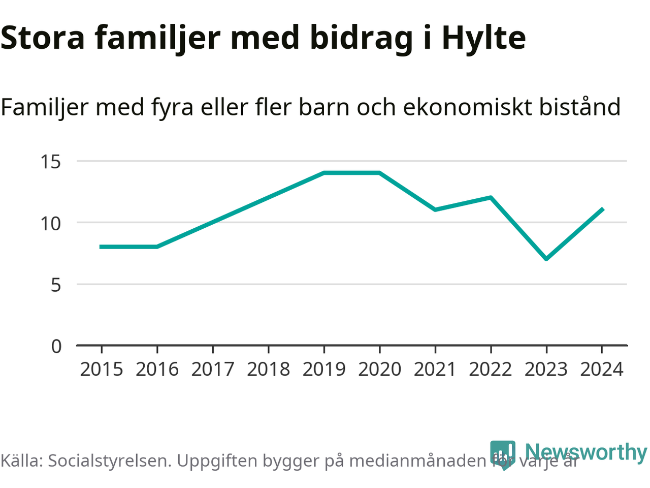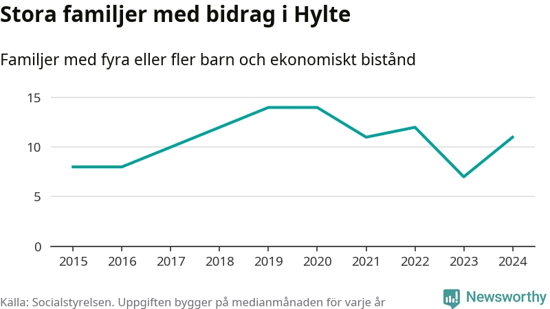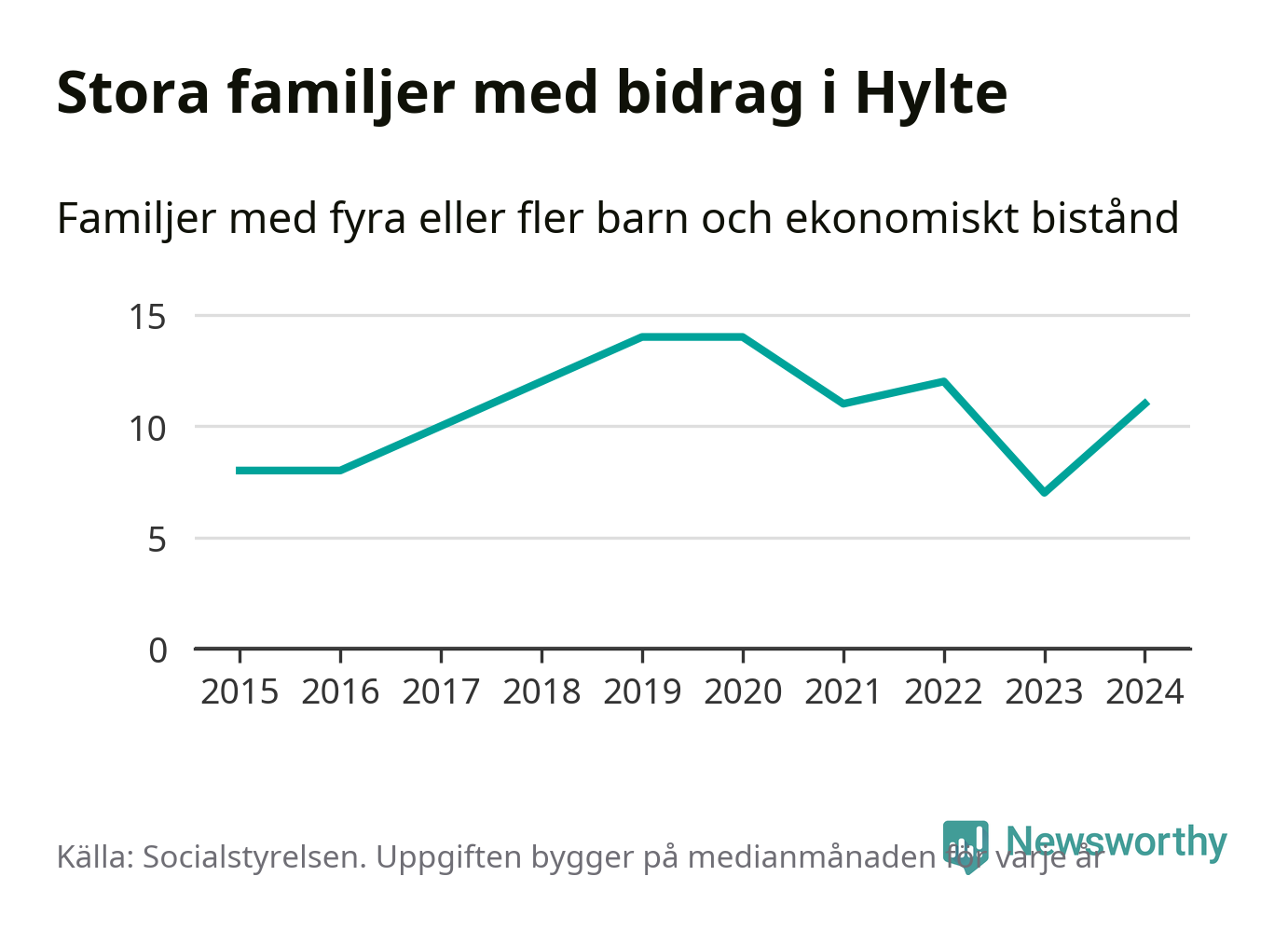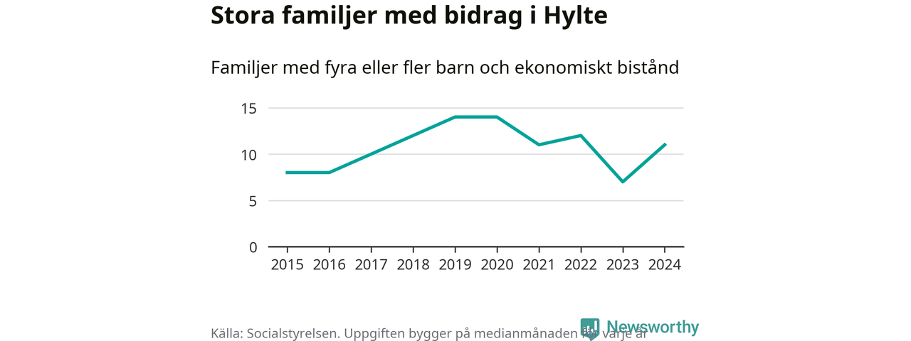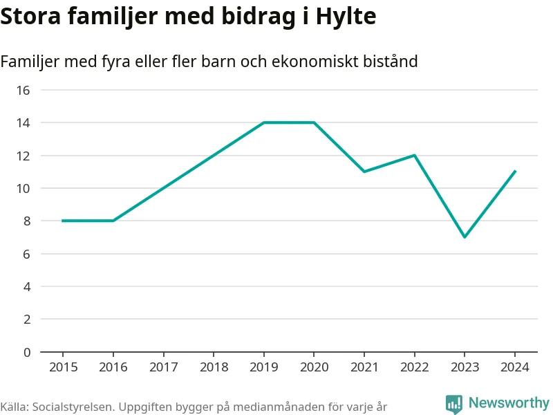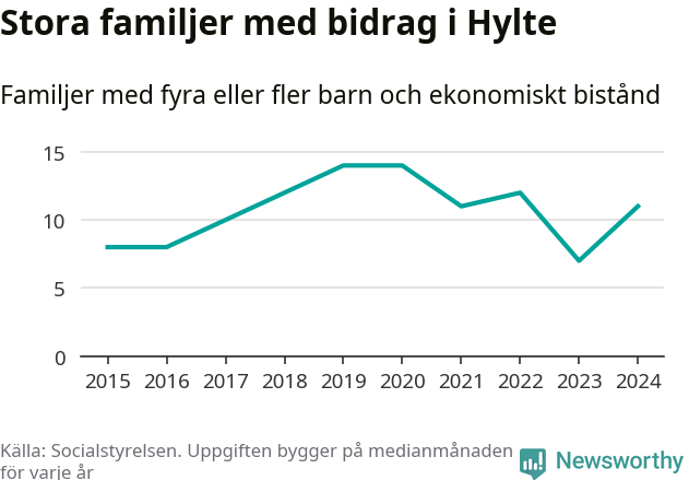 Hylte kommun tillhör de kommuner i landet som har har högst andel av befolkningen som fick ekonomiskt bistånd 2024. Sammanlagt 184 hushåll fick någon gång under året ekonomiskt bistånd, enligt Socialstyrelsens statistik. Av dem var 81 barnfamiljer. Vi har inte siffror på hur många unika familjer med fyra barn eller fler det handlar om, men enligt Socialstyrelsens preliminära månadsstatistik betalades ekonomiskt bistånd ut till mellan någon eller några enstaka och 13 familjer per månad under fjolåret – i snitt elva familjer.