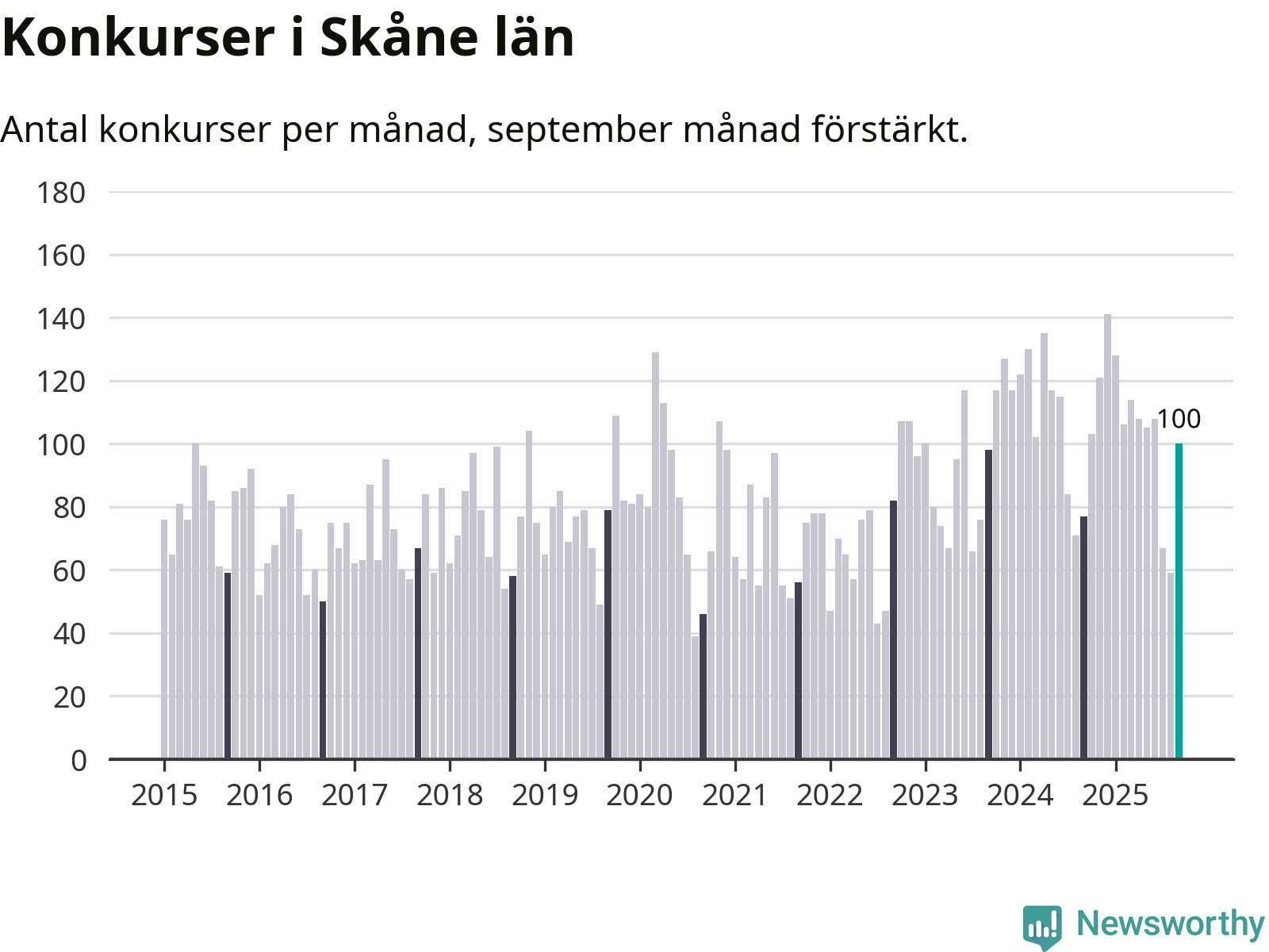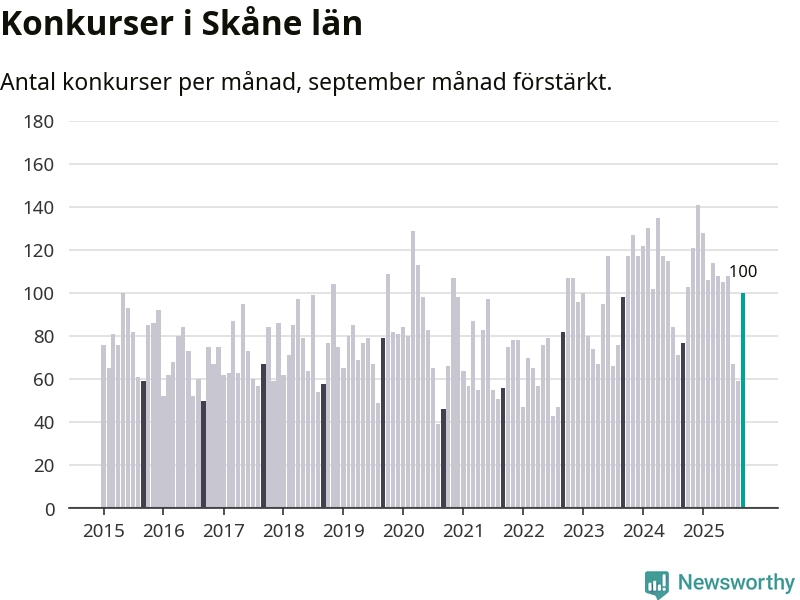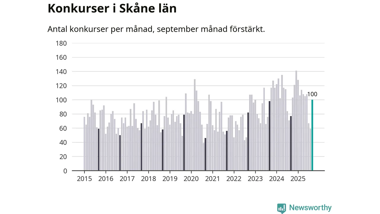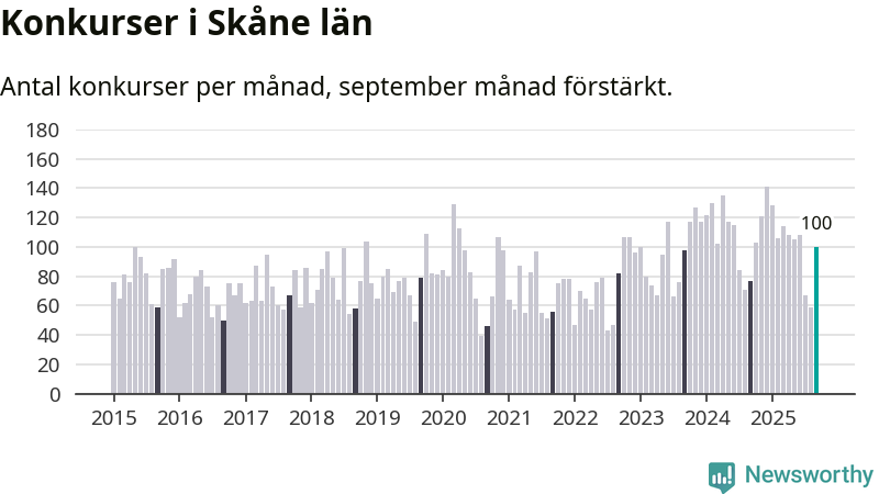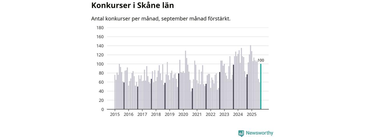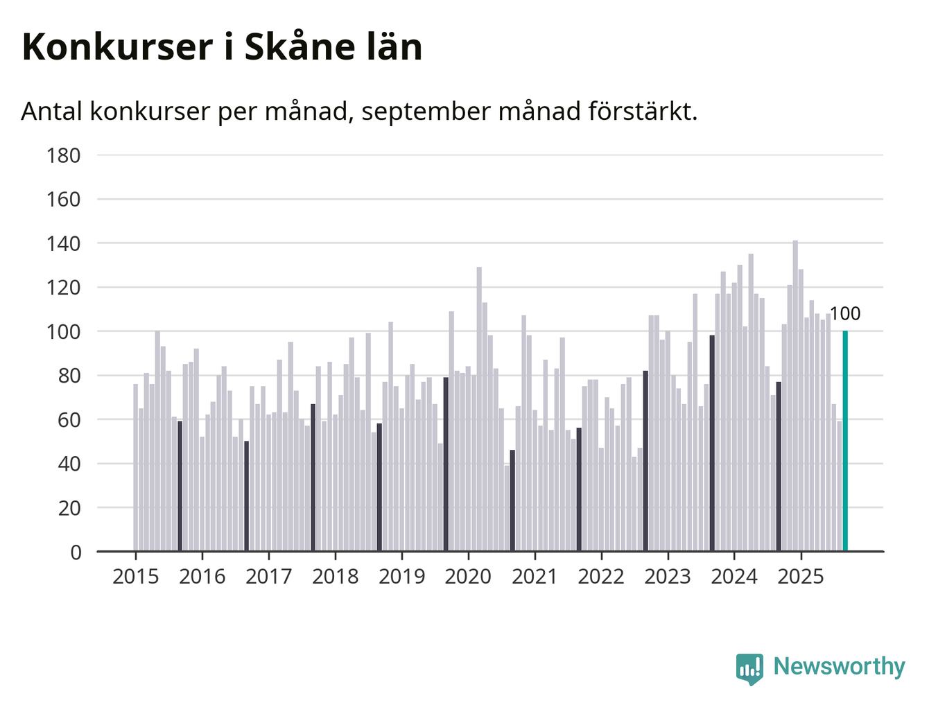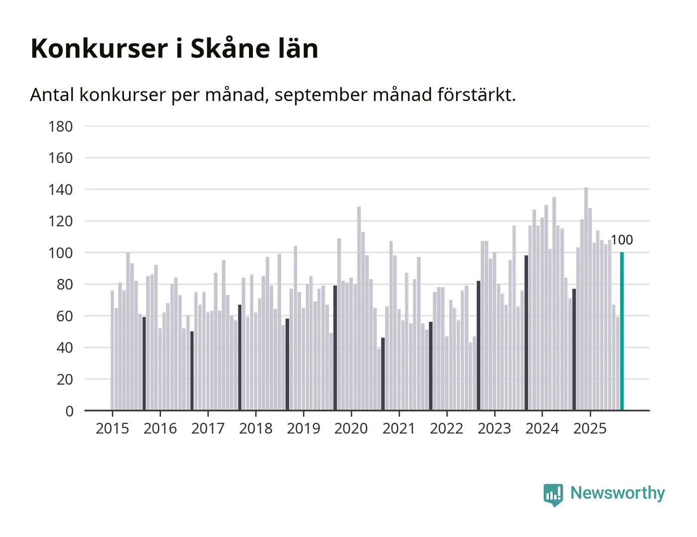 Under september månad gick 100 bolag i konkurs i Skåne. Det är fler än normalt för den här tiden på året sett till de senaste tio åren. I fjol noterades 77 konkurser under september.