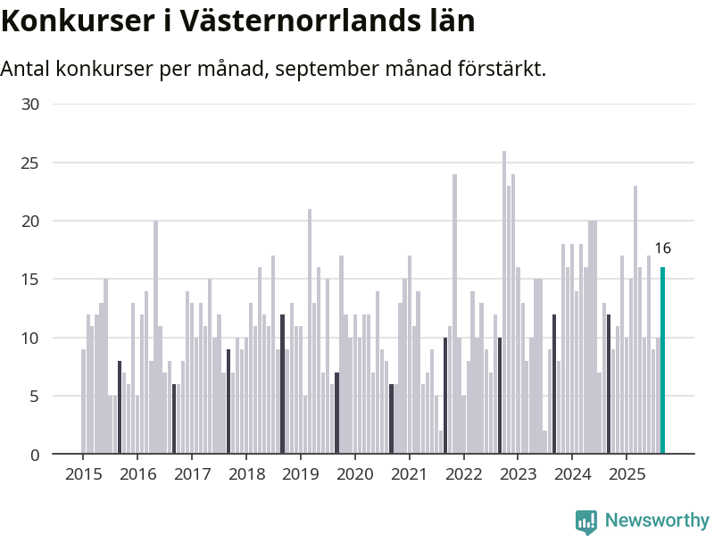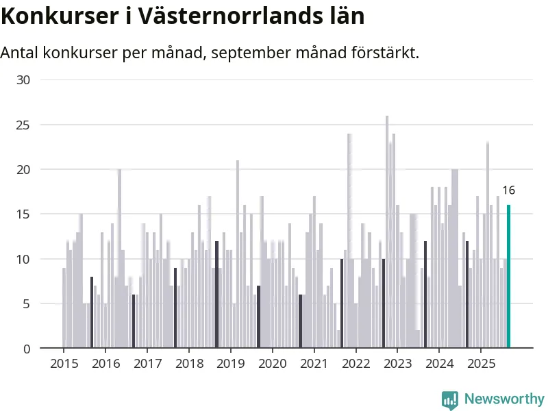 Under september månad gick 16 bolag i konkurs i Västernorrland. Det är en tämligen normal nivå för den här tiden på året. I fjol noterades tolv konkurser under september.