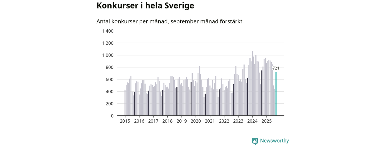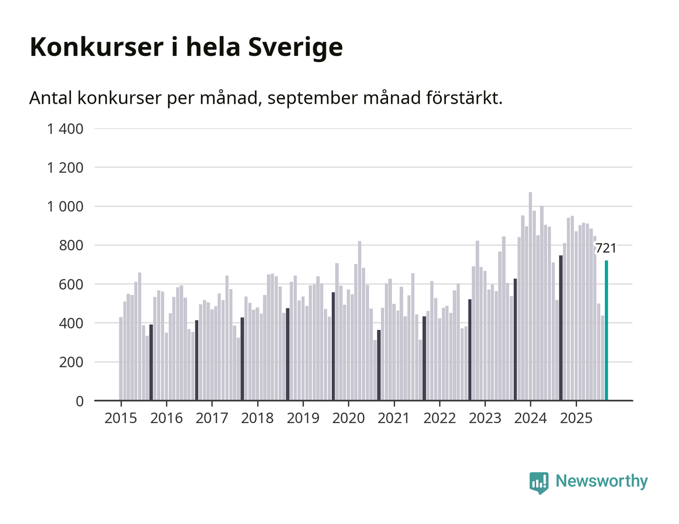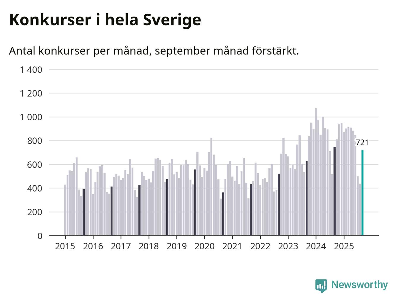 I hela Sverige gick 721 företag i konkurs i september. Det är 25 färre än vid motsvarande tid i fjol (−3 procent). Jämför vi 2025 års samlade konkurser ser vi en nedgång med −4 procent.