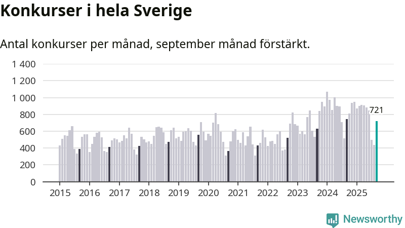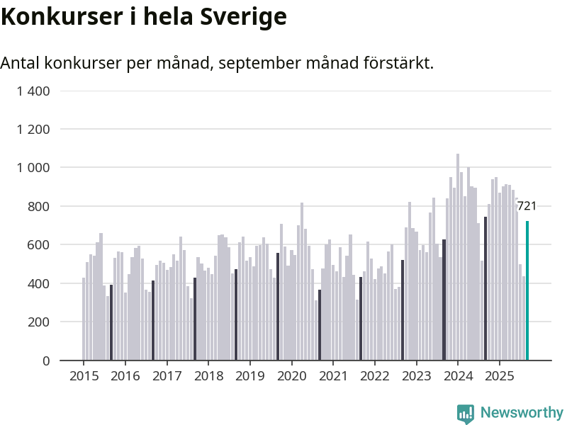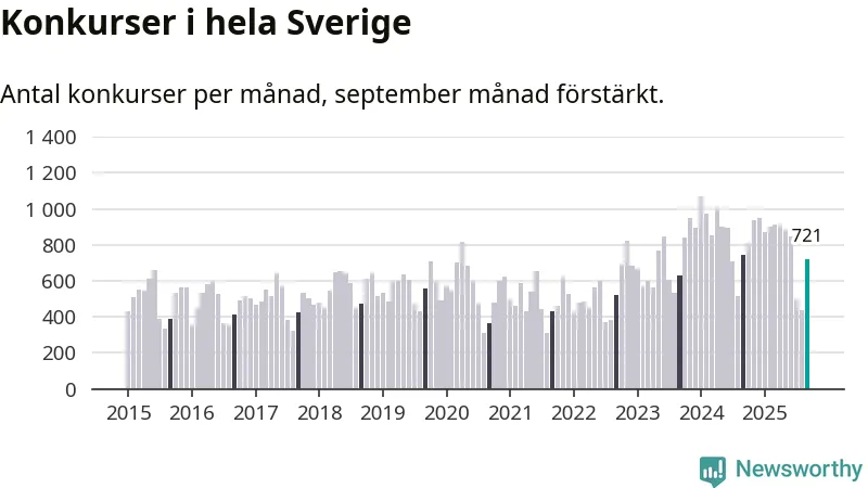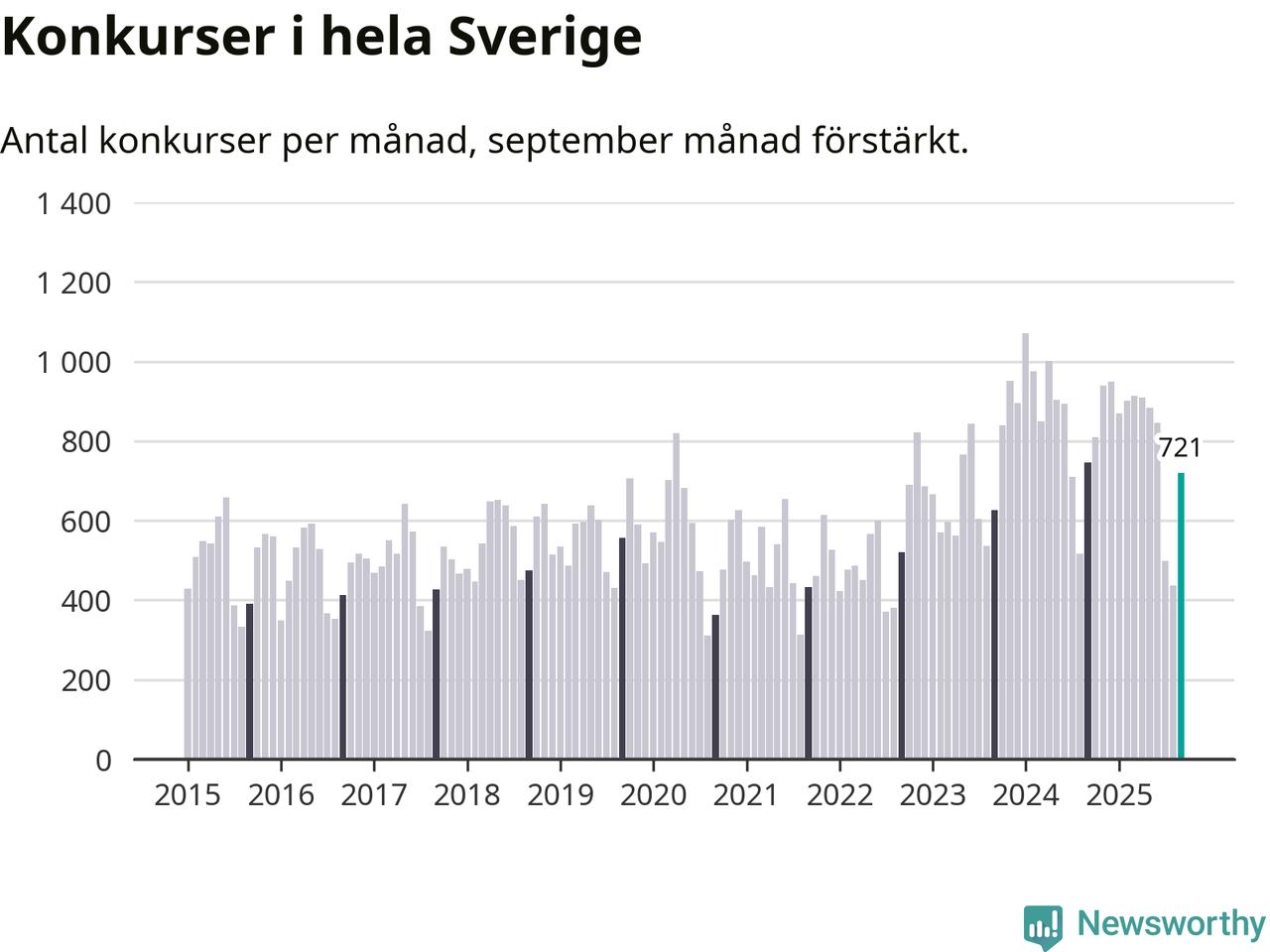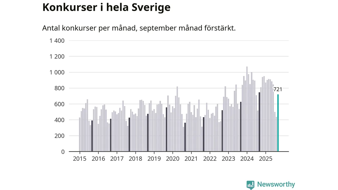 I hela Sverige gick 721 företag i konkurs i september. Det är 25 färre än vid motsvarande tid i fjol (−3 procent). Jämför vi 2025 års samlade konkurser ser vi en nedgång med −4 procent.