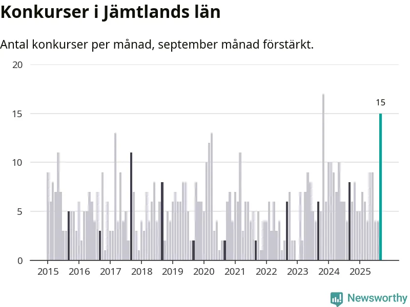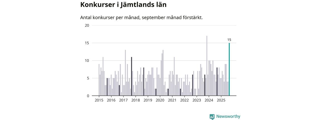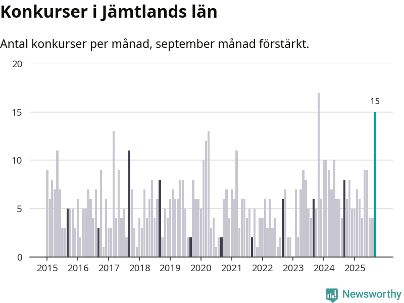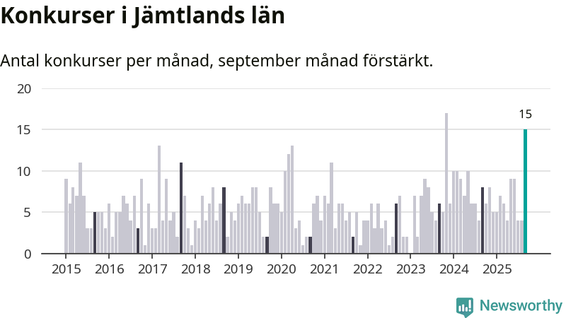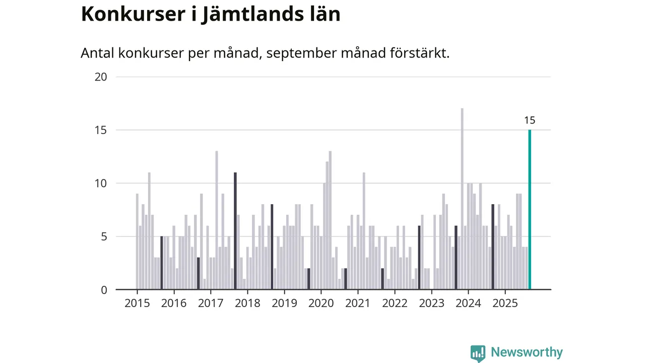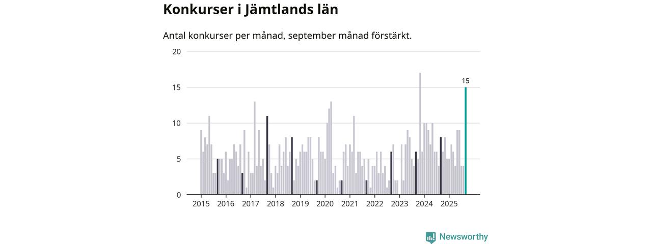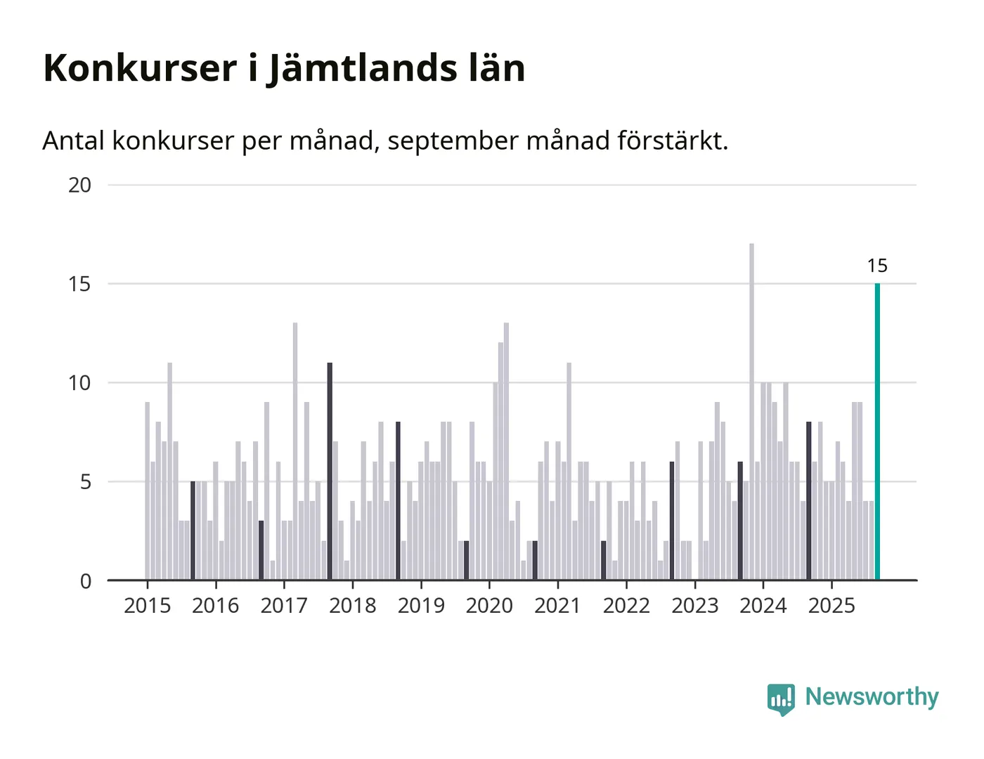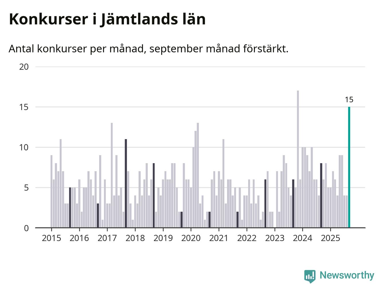 Under september månad gick 15 bolag i konkurs i Jämtland. Det är fler än normalt för den här tiden på året sett till de senaste tio åren. I fjol noterades åtta konkurser under september.