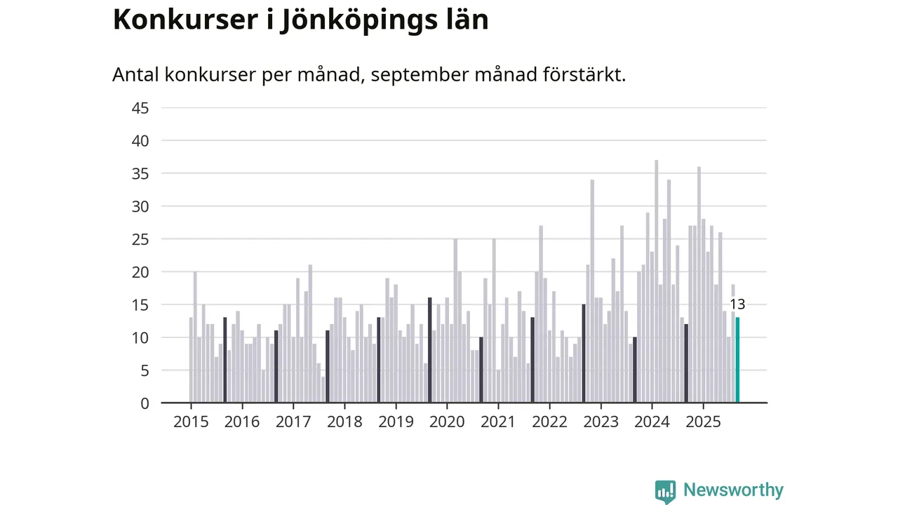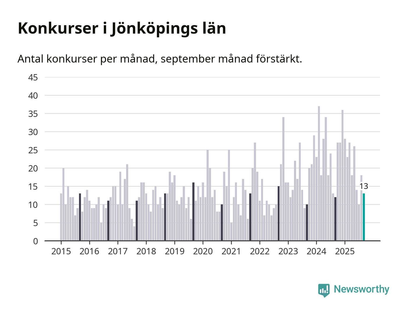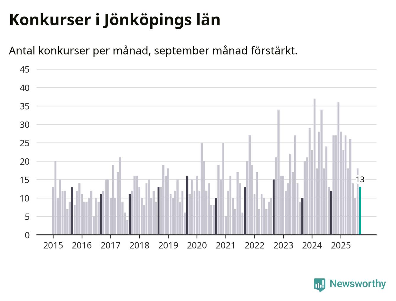 Under september månad gick 13 bolag i konkurs i Jönköpings län. Det är en tämligen normal nivå för den här tiden på året. I fjol noterades tolv konkurser under september.