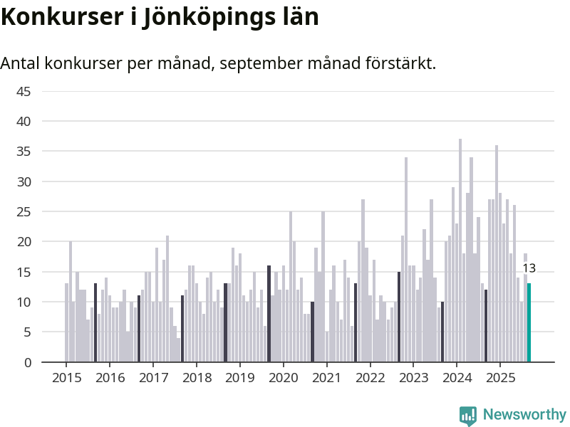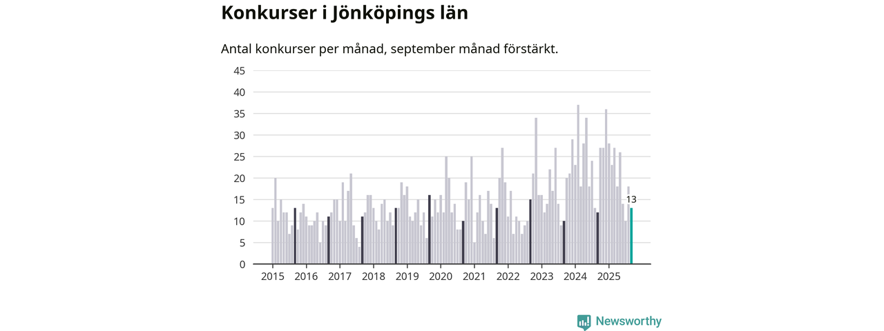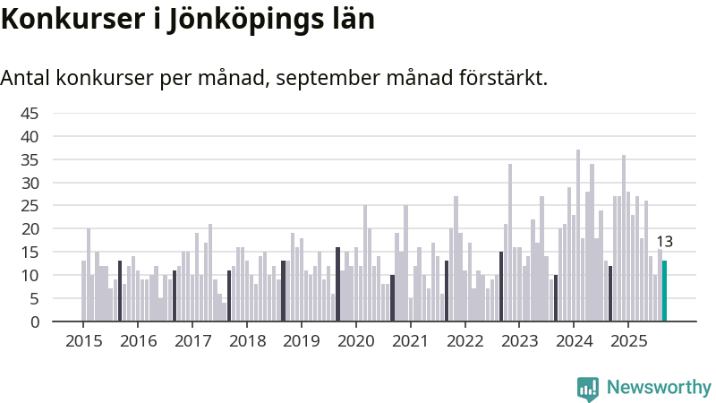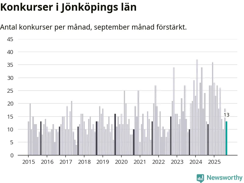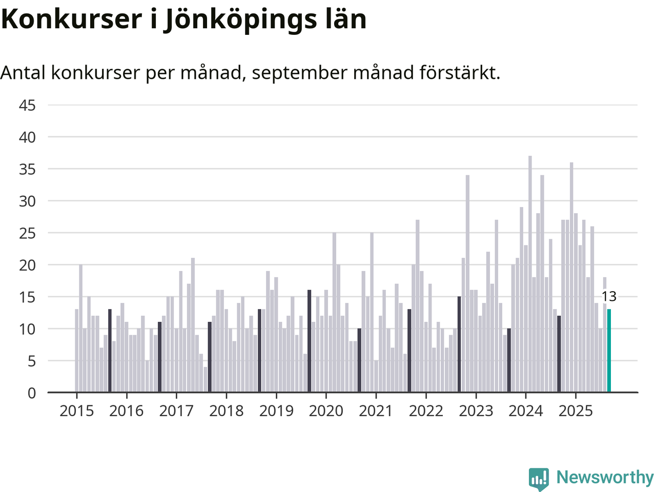 Under september månad gick 13 bolag i konkurs i Jönköpings län. Det är en tämligen normal nivå för den här tiden på året. I fjol noterades tolv konkurser under september.