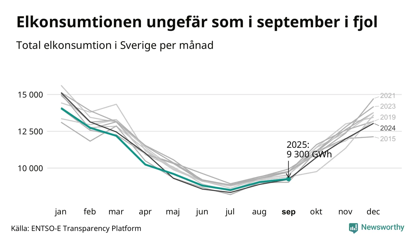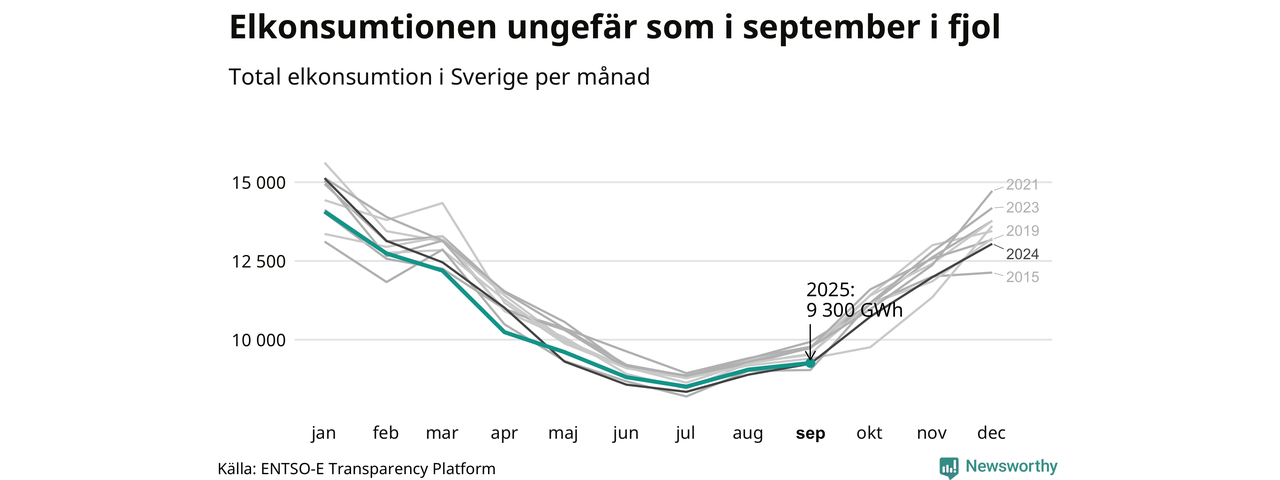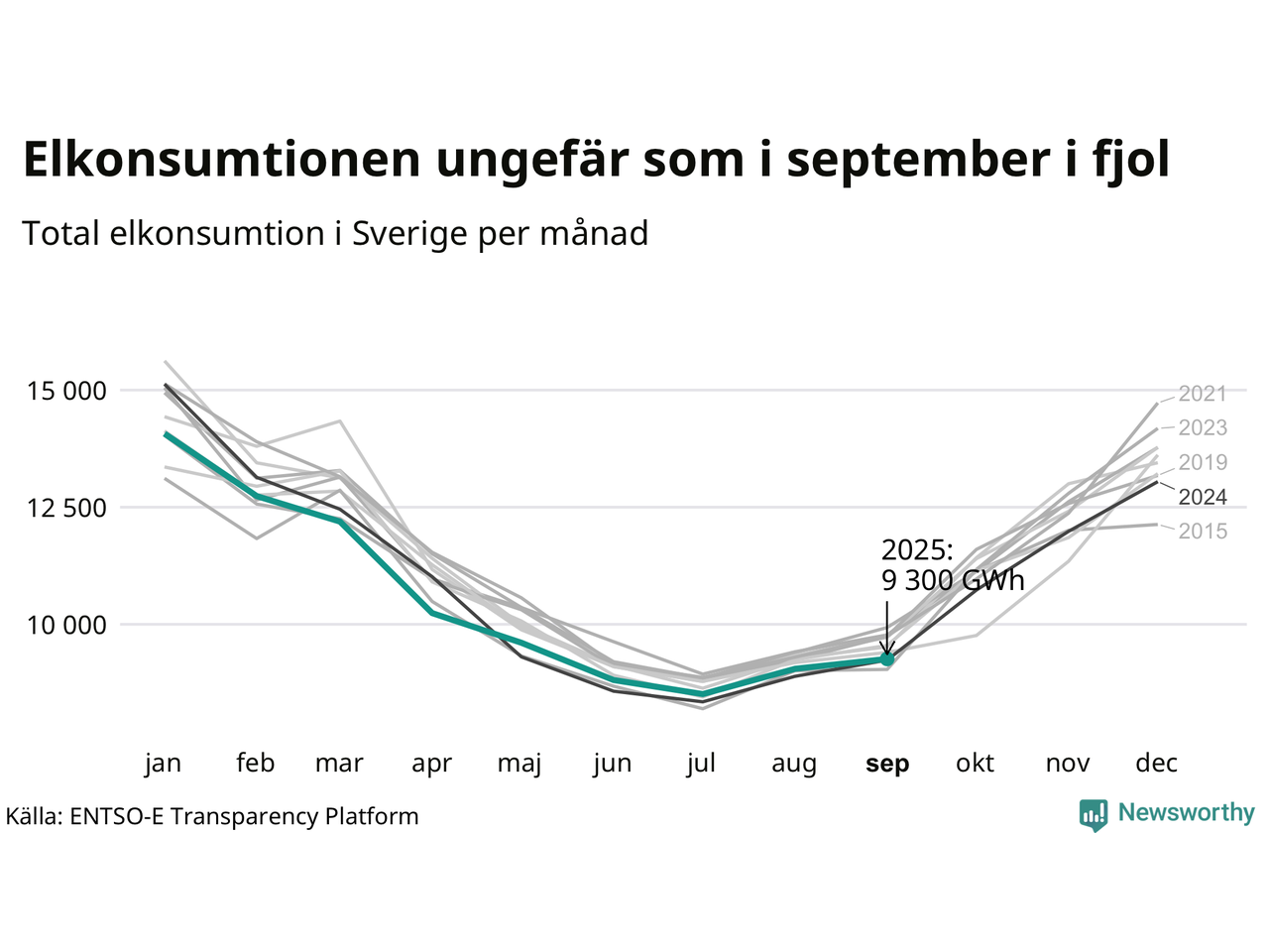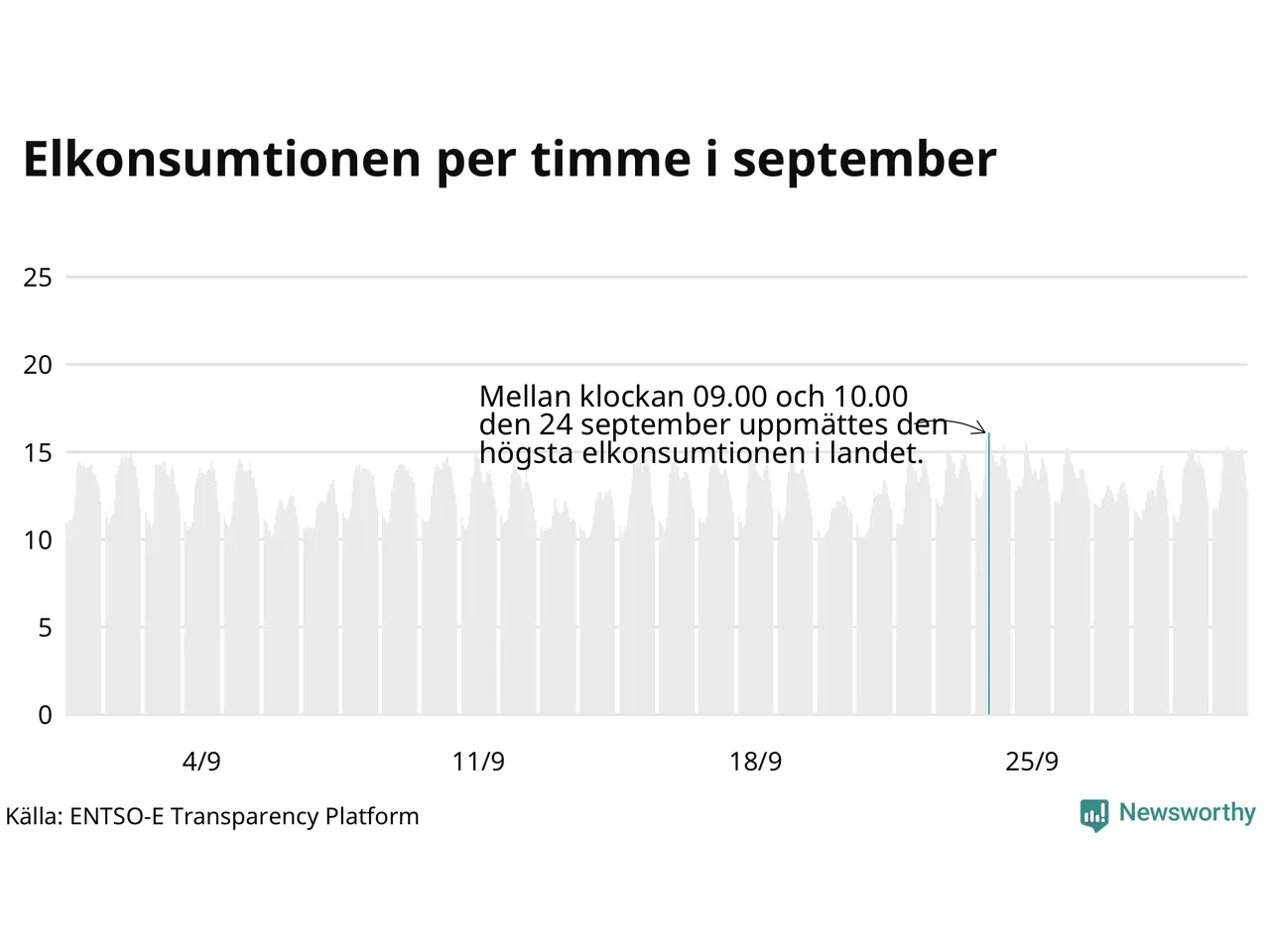Under september förbrukades det ungefär 9 300 gigawattimmar el i Sverige. Det är ungefär tre procent mindre än snittet för månaden. Jämfört med samma månad i fjol var konsumtionen i princip lika stor. Konsumtionen påverkas mycket av hur varmt det är i landet.