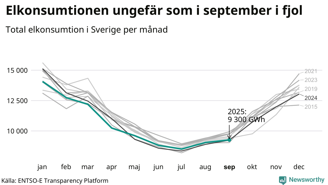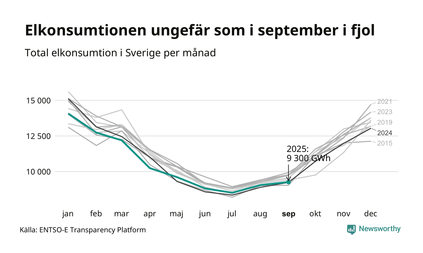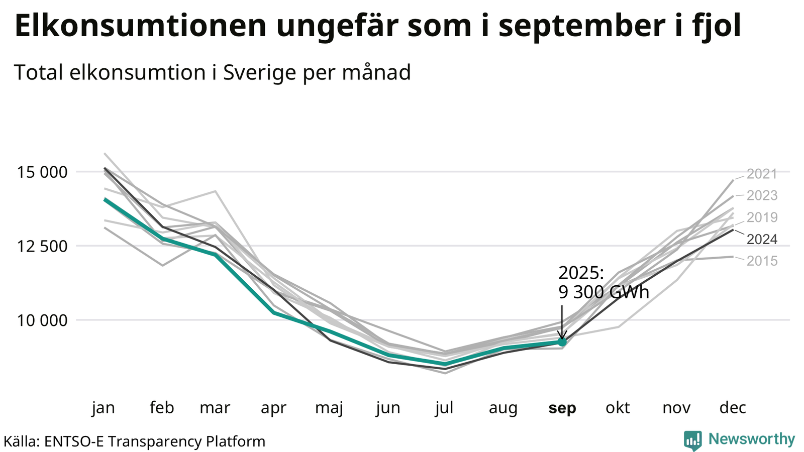Under september förbrukades det ungefär 9 300 gigawattimmar el i Sverige. Det är ungefär tre procent mindre än snittet för månaden. Jämfört med samma månad i fjol var konsumtionen i princip lika stor. Konsumtionen påverkas mycket av hur varmt det är i landet.