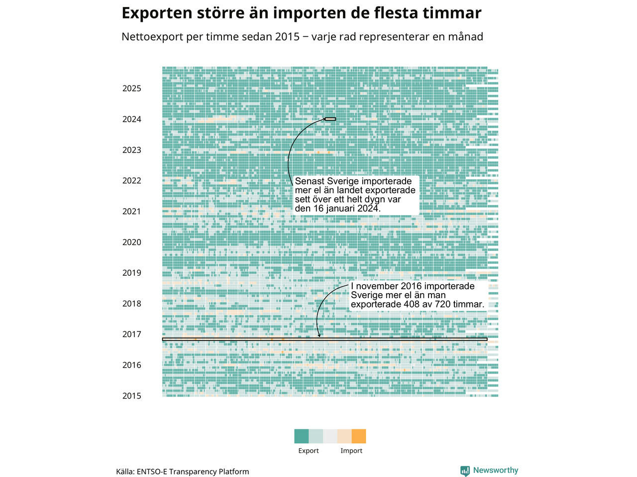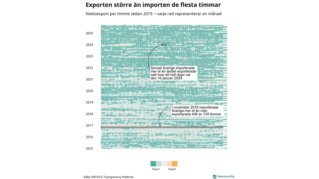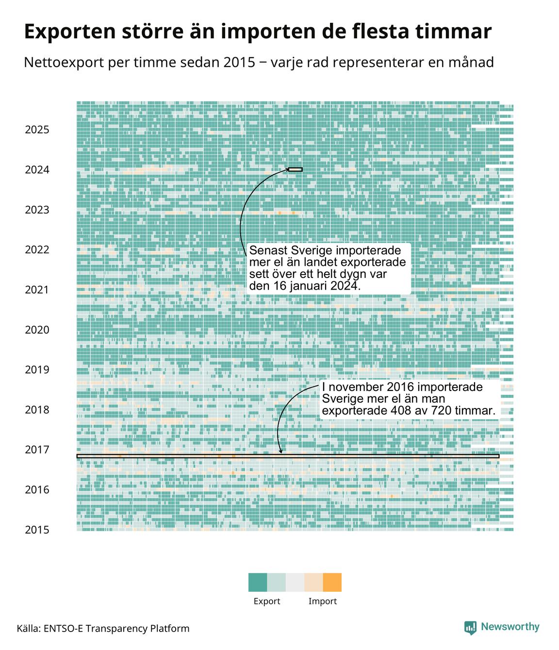 Det produceras som sagt mer el i Sverige än det förbrukas, i alla fall om man tittar på månadsbasis – bara två månader under de senaste elva åren har Sverige importerat mer el än landet exporterat. I september exporterade Sverige också mer el än man importerade under samtliga timmar.