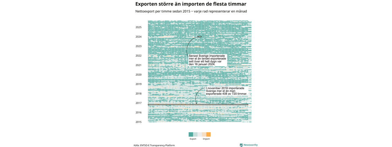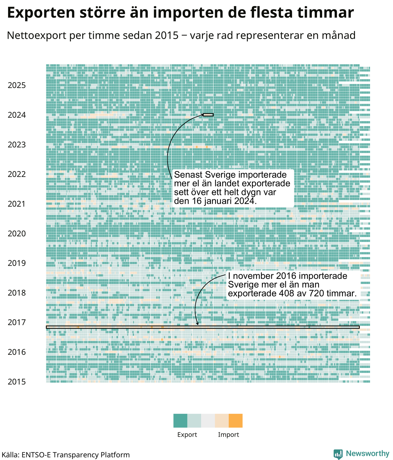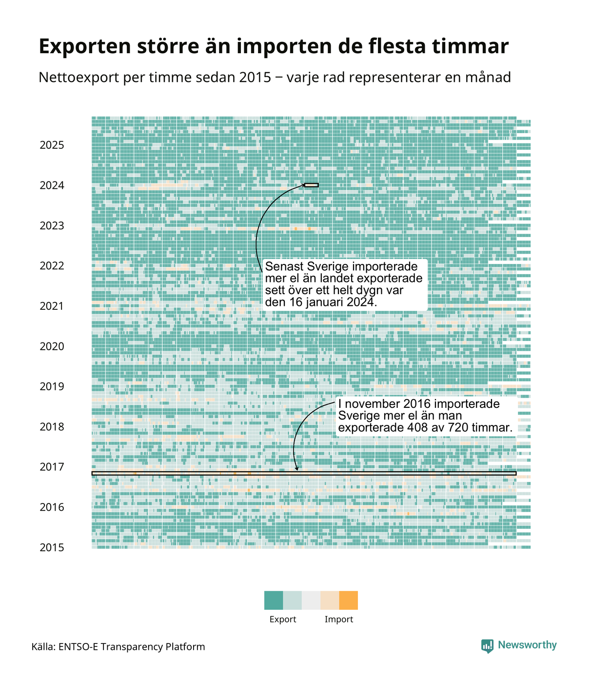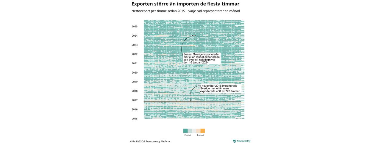 Det produceras som sagt mer el i Sverige än det förbrukas, i alla fall om man tittar på månadsbasis – bara två månader under de senaste elva åren har Sverige importerat mer el än landet exporterat. I september exporterade Sverige också mer el än man importerade under samtliga timmar.