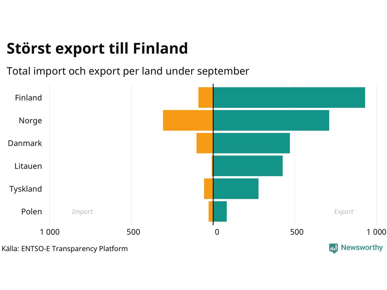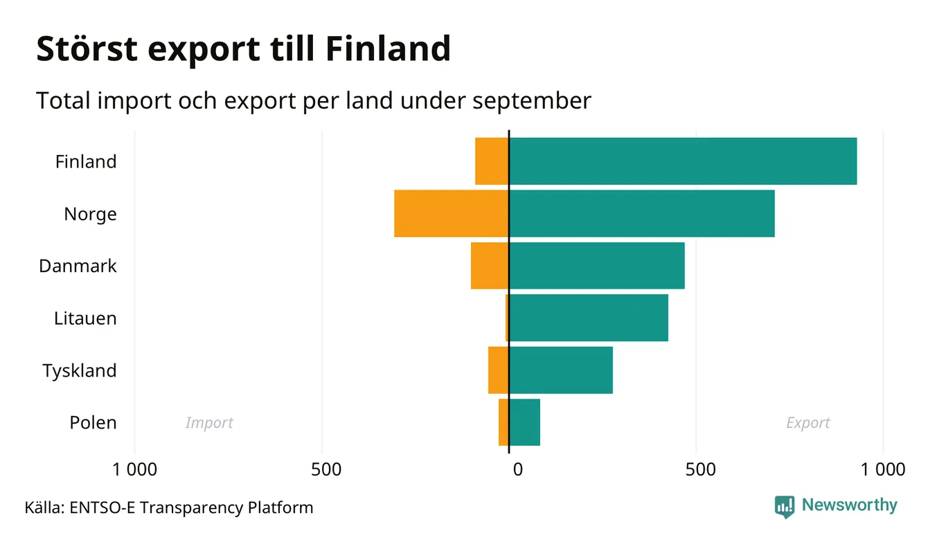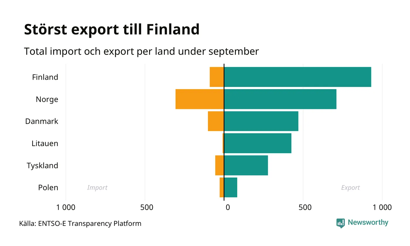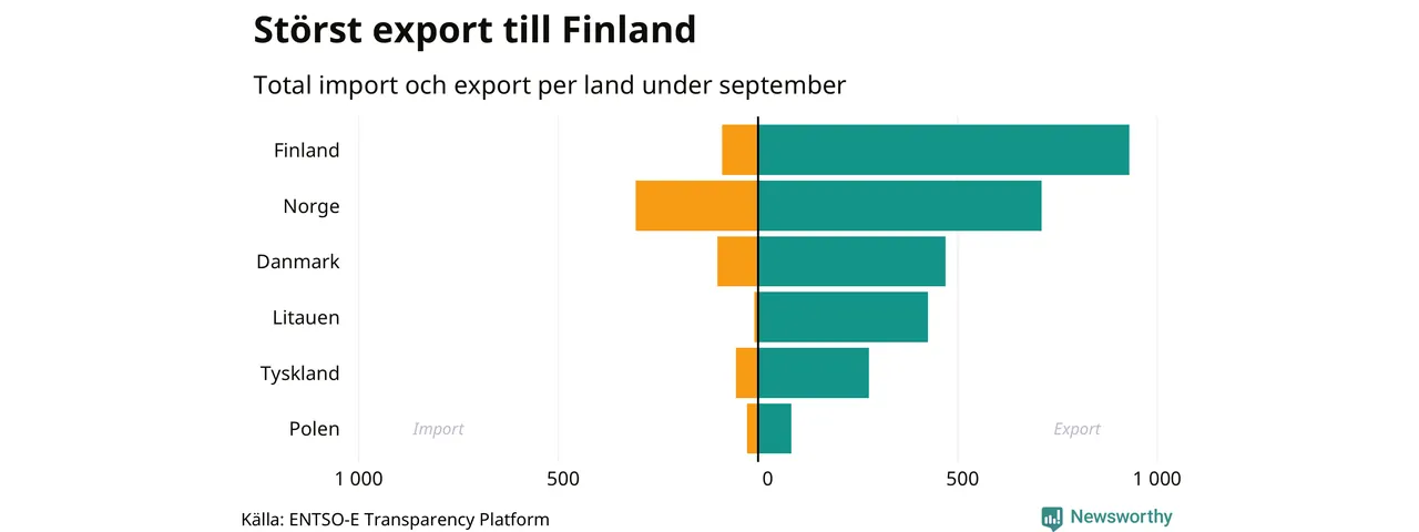 Under september exporterade Sverige mest el till Finland, medan den största importen kom från Norge.
