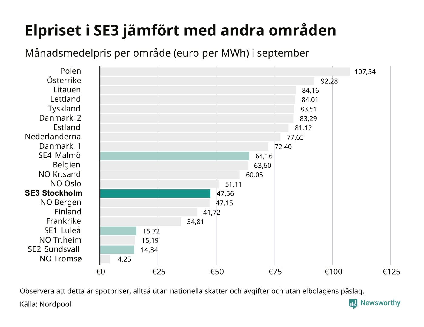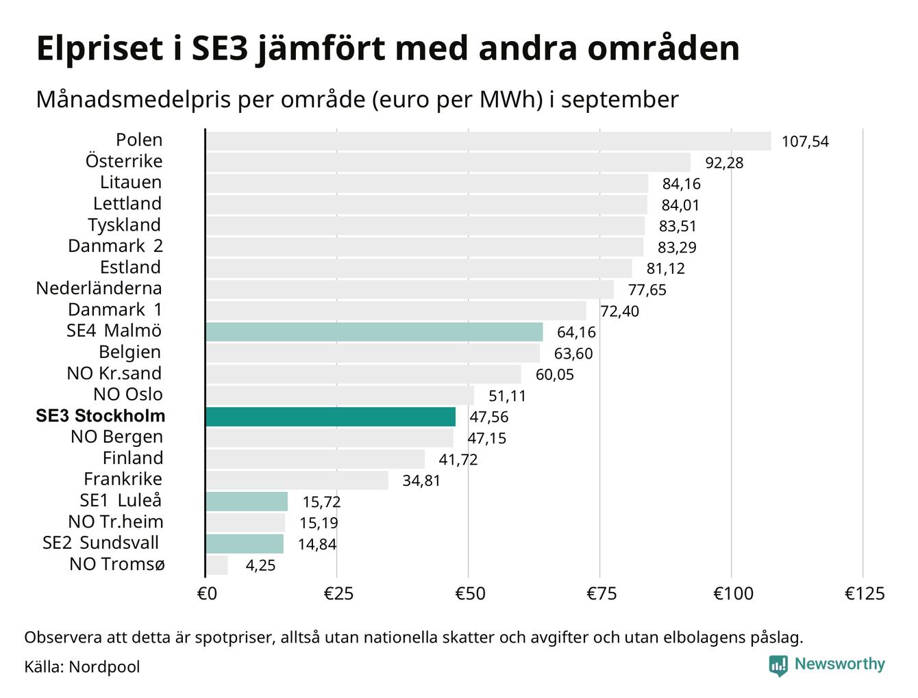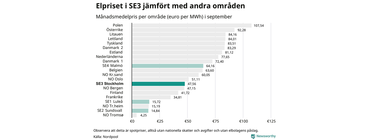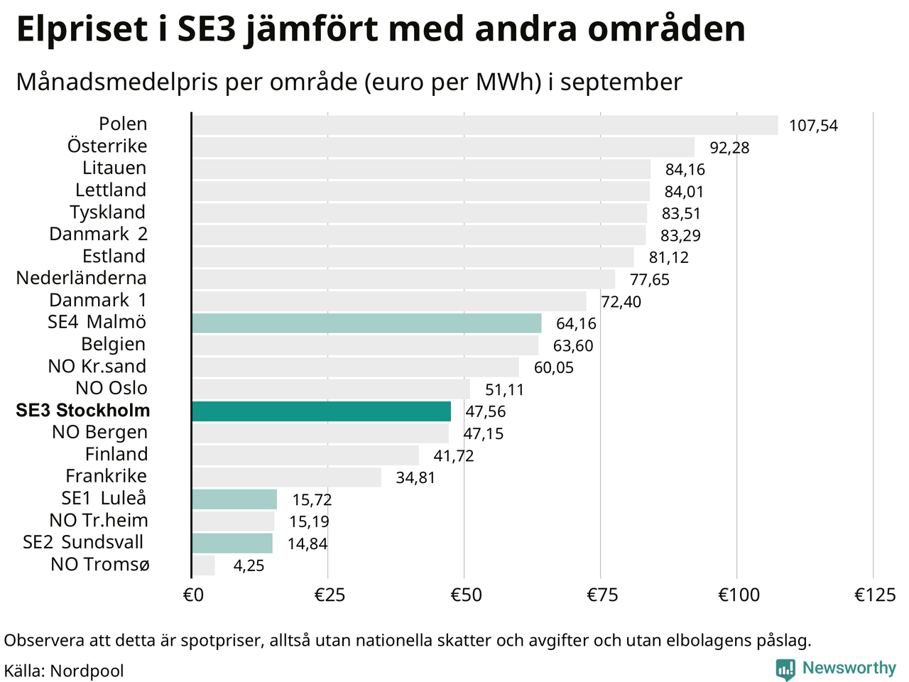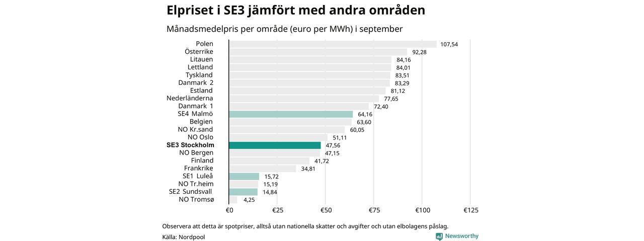 Om man tittar på månadsmedelpriset brukar de svenska elområdena oftast tillhöra de med lägst spotpriser i en europeisk jämförelse. Värt att notera är att detta handlar om spotpriser, de priser konsumenten sedan betalar beror på nationella avgifter och skatter samt elbolagens påslag. I praktiken ligger de svenska konsumentpriserna närmare det europeiska snittet efter skatter och påslag.
