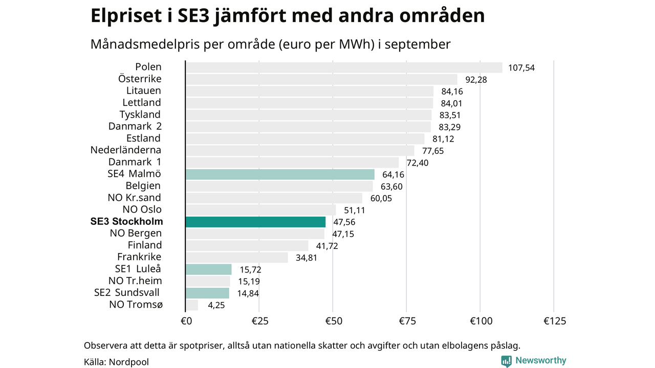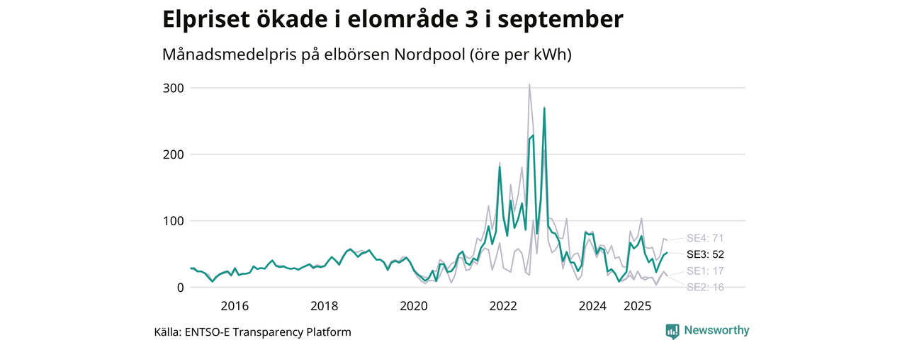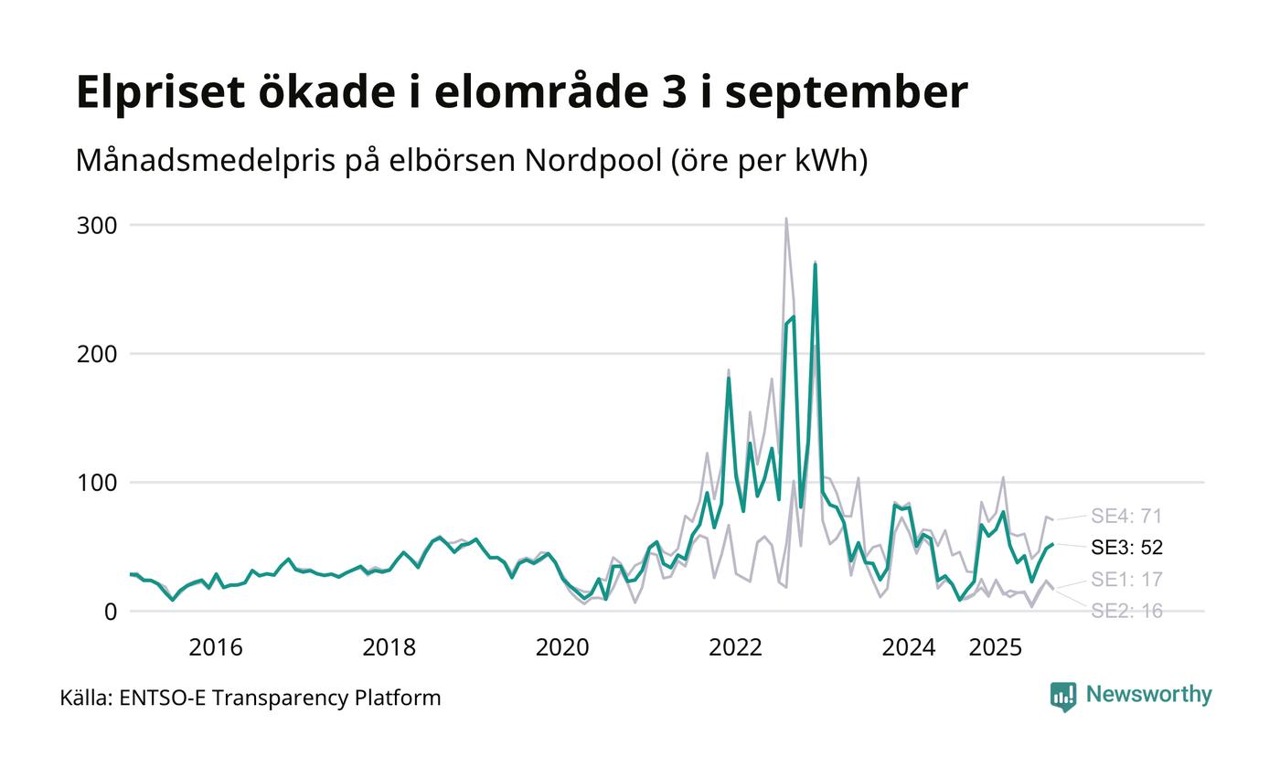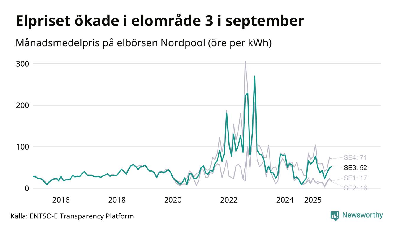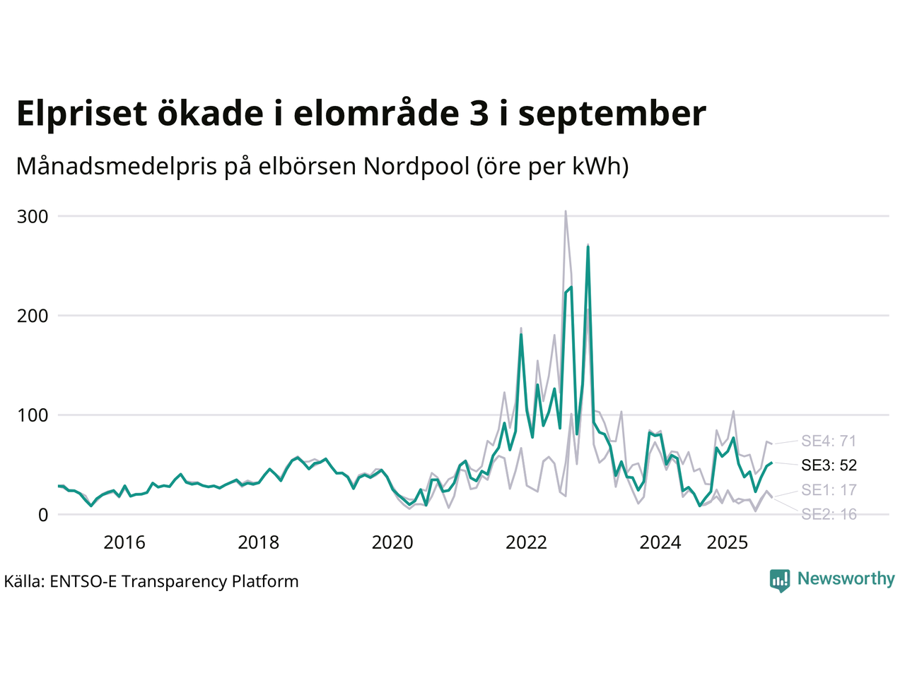 Spotpriset – alltså priset som elbolagen köper in elen för – gick upp i september i elområde 3 som Sigtuna tillhör. Månadspriset var 52 öre per kilowattimme, vilket är 3 öre dyrare än i augusti. Det högsta priset i elområdet hittills noterades i december 2022, då en kilowattimme kostade 269 öre. För ett år sedan – i september 2024 – kostade en kilowattimme 16 öre.