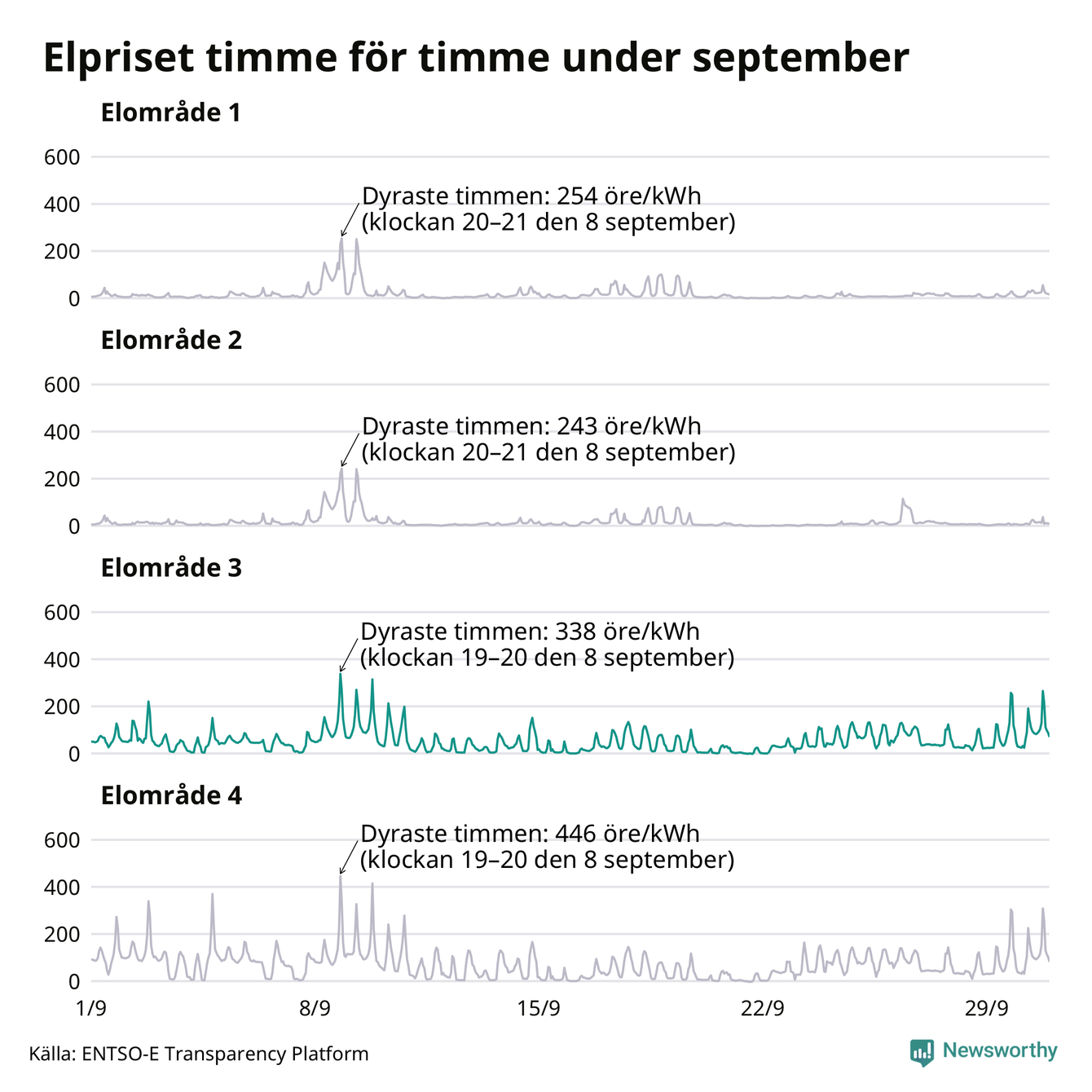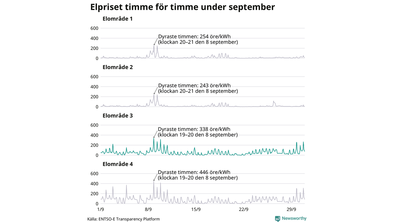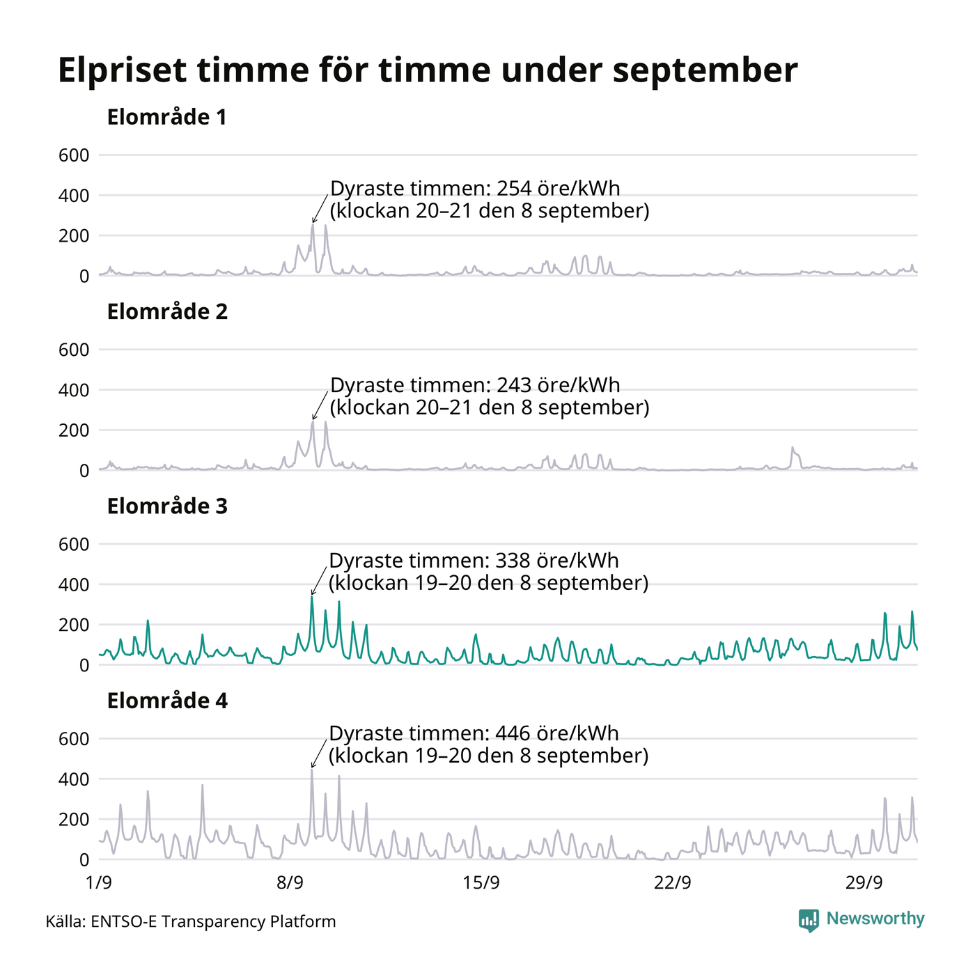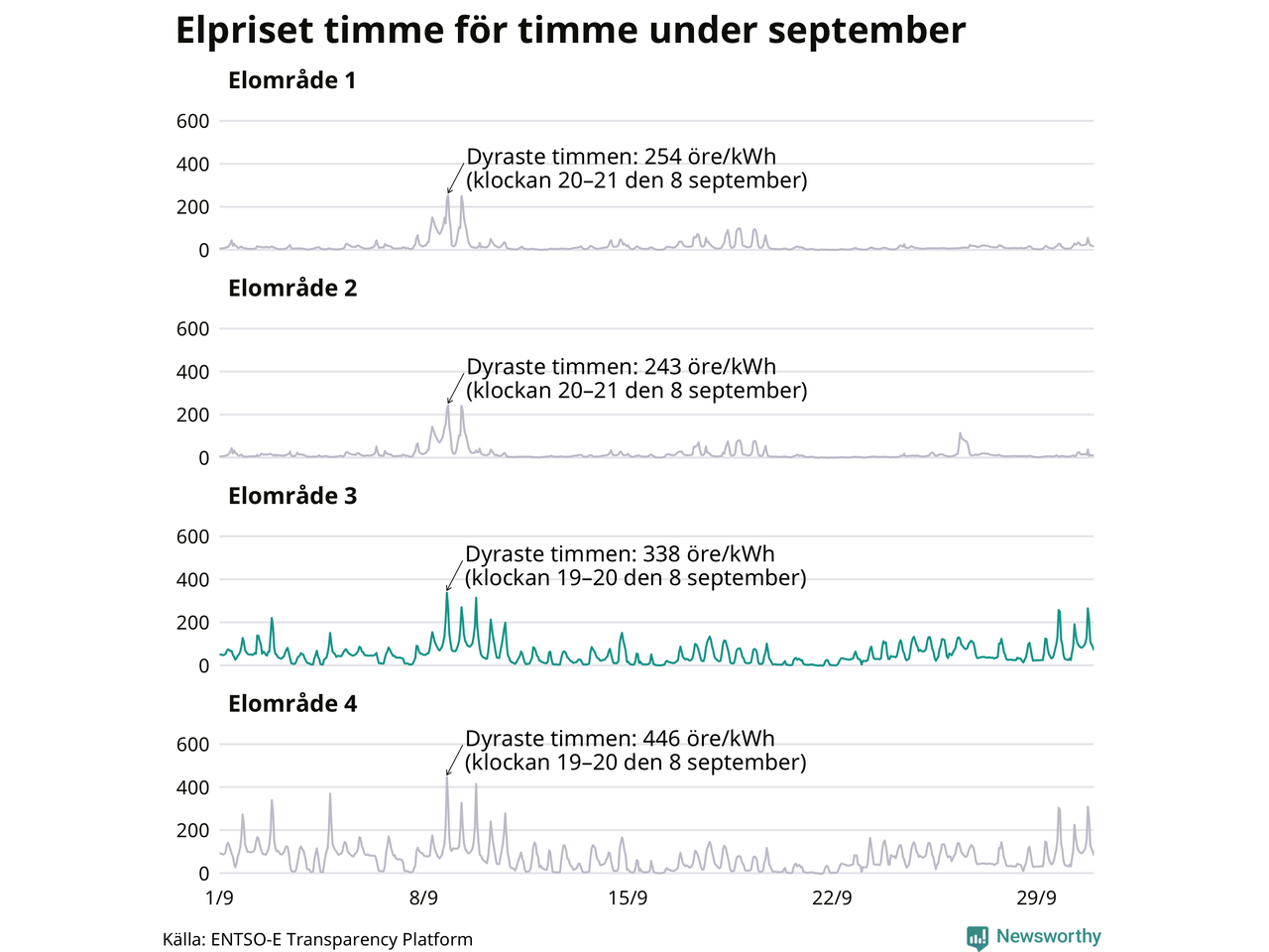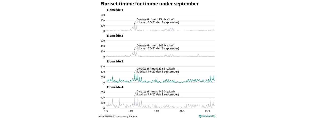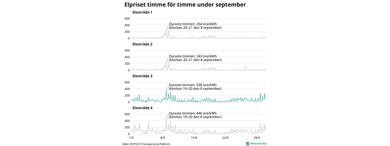 Det är inte bara prisskillnaderna mellan prisområdena som har ökat de senaste åren, även inom områdena pendlar priserna timme för timme. Skillnaderna mellan de dyraste och billigaste timmarna har blivit större sedan 2020. Dyraste timmen i september i Sigtuna inträffade mellan klockan 19 och 20 den 8 september, då kostade en kilowattimme 338 öre. Som lägst var priset i området −2 öre. Under september var timpriset negativt under 4 timmar. Negativa timpriser har noterats varje månad under det senaste året.