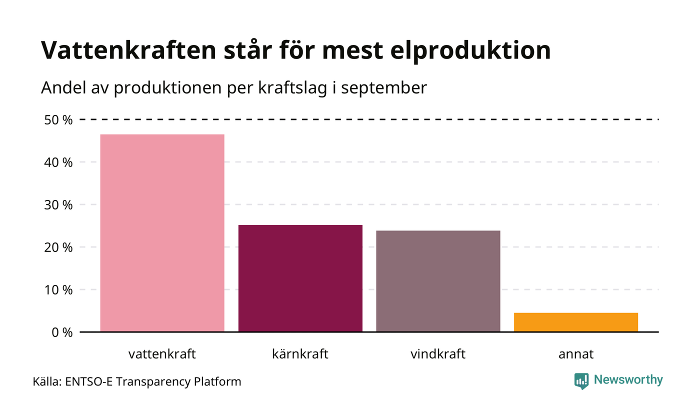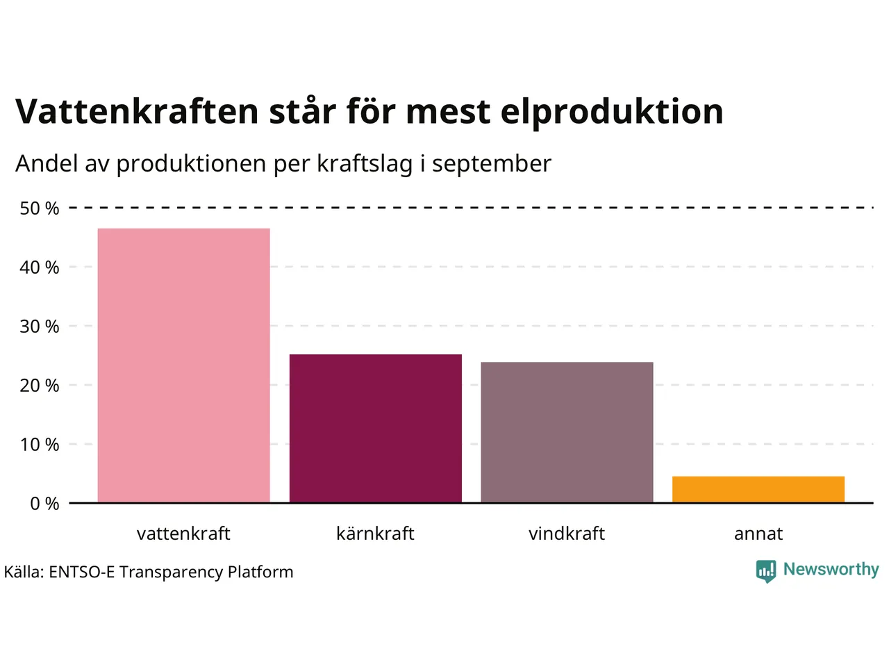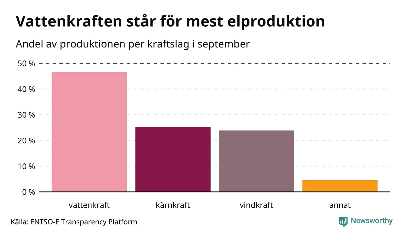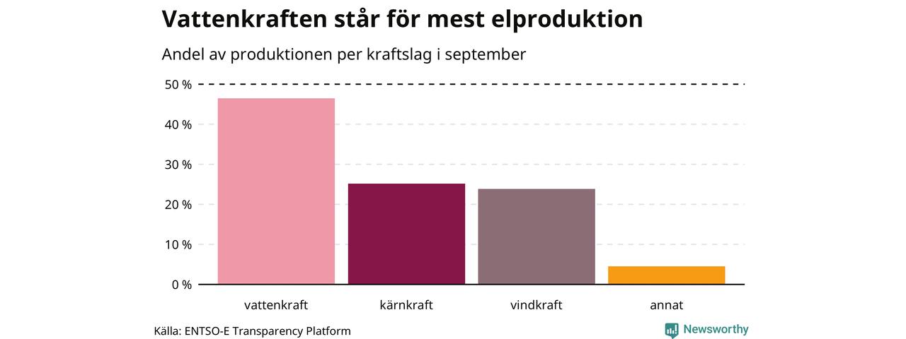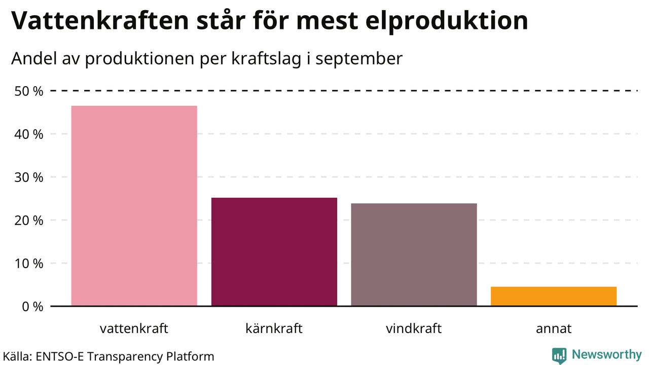 Enligt de preliminära siffrorna kom ungefär 46 procent av elproduktionen under september från vattenkraft, ungefär 25 procent från kärnkraft och runt 24 procent från vindkraft.
