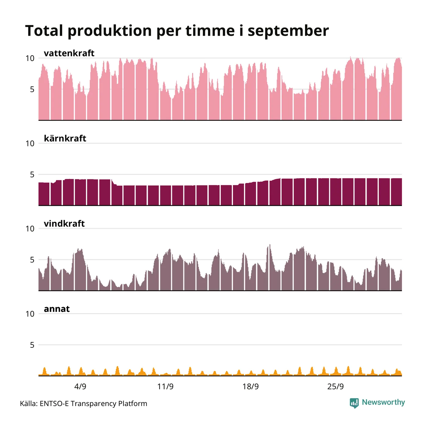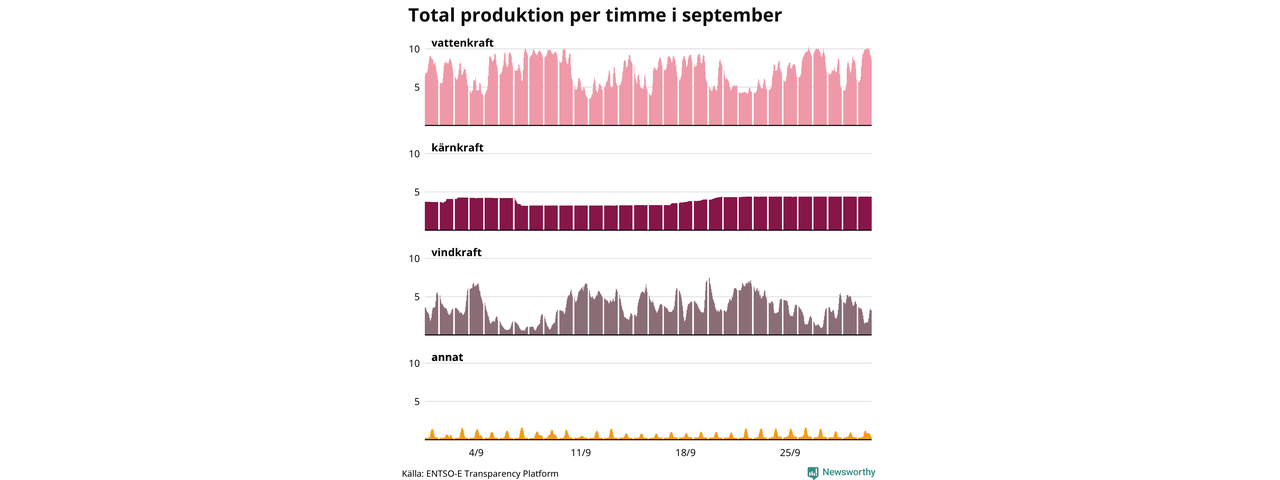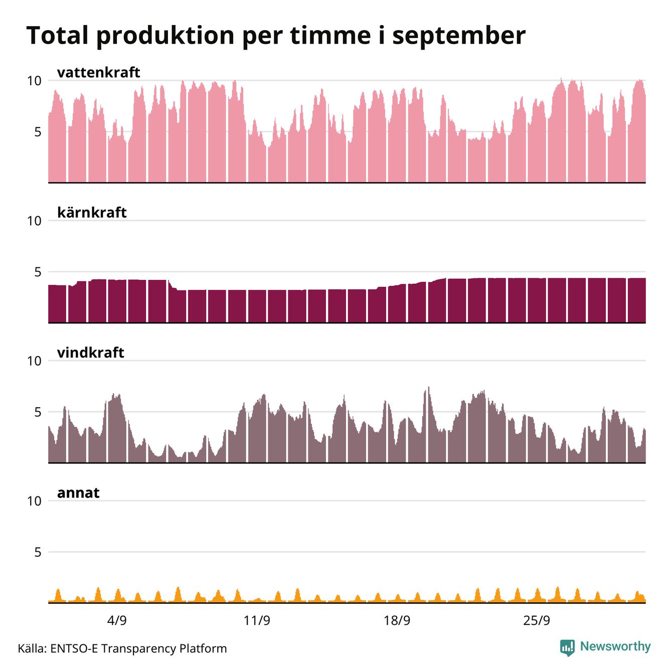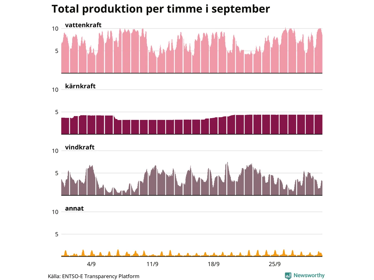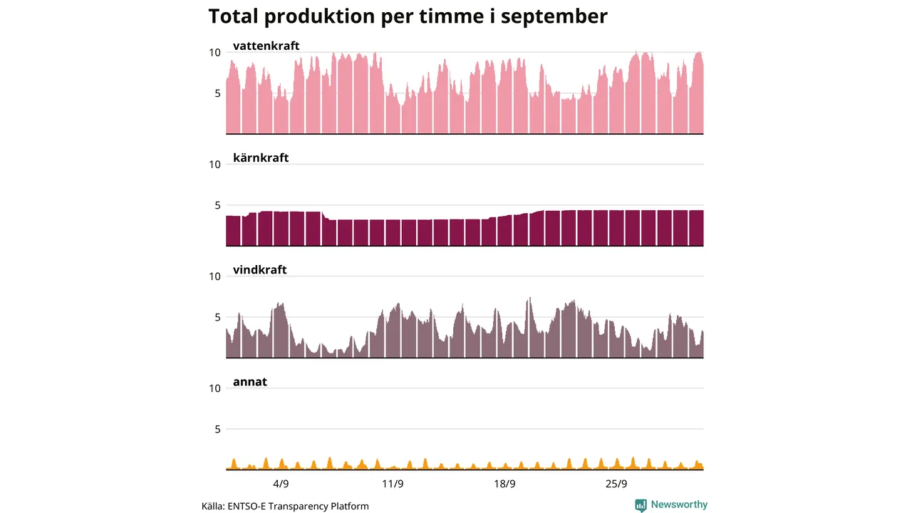 Enligt de preliminära siffrorna kom ungefär 46 procent av elproduktionen under september från vattenkraft, ungefär 25 procent från kärnkraft och runt 24 procent från vindkraft.
