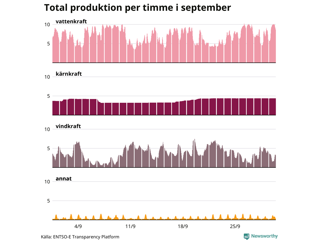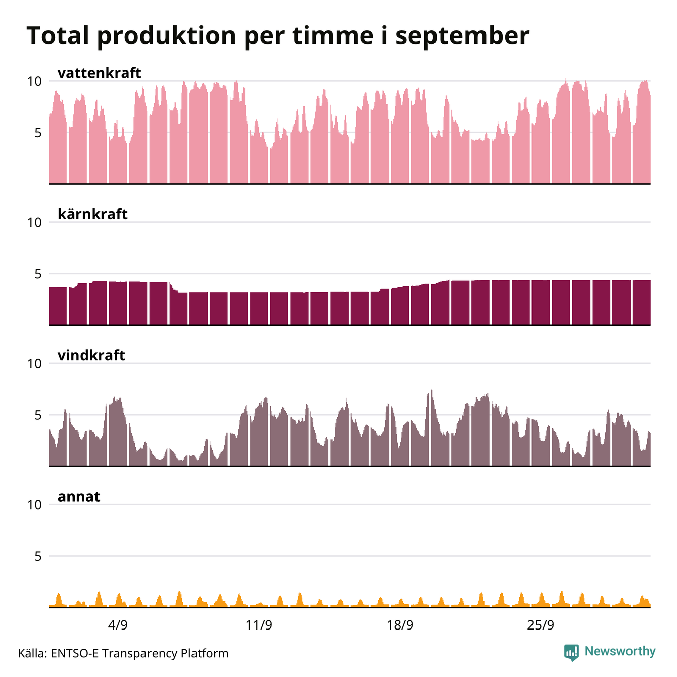 Produktionen av vindkraft är svår att planera, den är beroende av just vind. För att upprätthålla balansen justeras produktionen främst av vattenkraft – som förutom att användas som baskraft också kan startas och stoppas på kort tid och möta variationer i efterfrågan. Tittar man på produktionen timme för timme syns det i diagrammet här som en ”taggigare” kurva, medan kärnkraftsproduktionen ligger stabil över tid. Under september var Oskarshamn 3 och Forsmark 1 avställda på grund av reparation och revision.