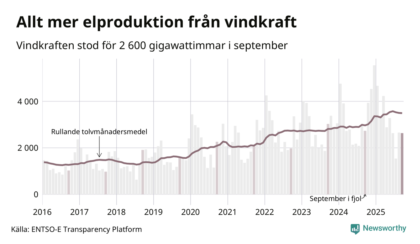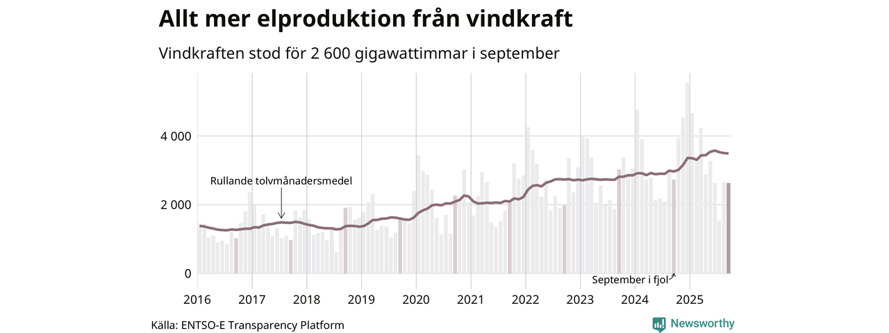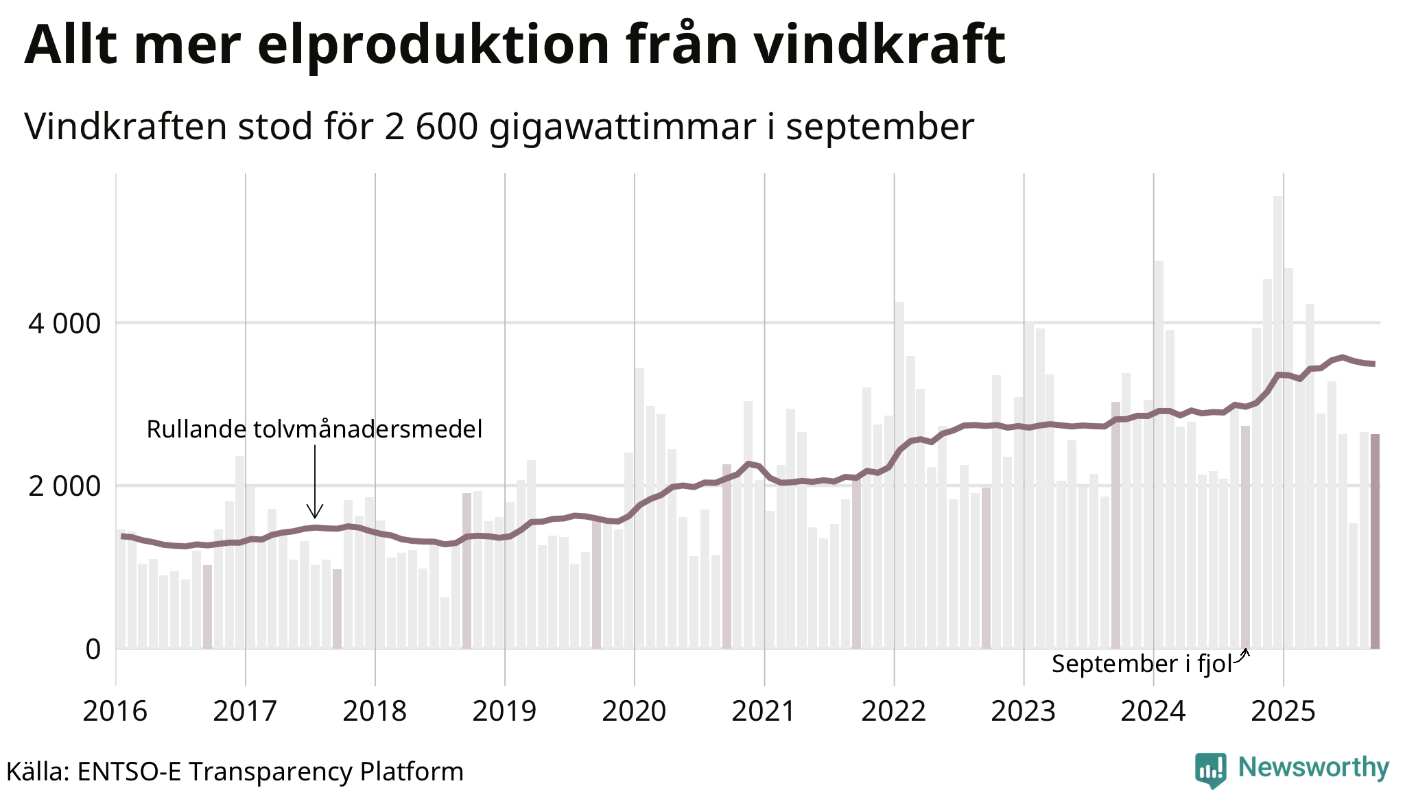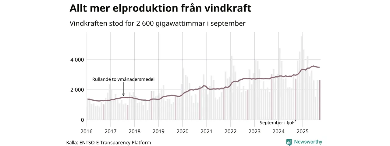 Vindkraften stod alltså för cirka 24 procent av elproduktionen i september. Det motsvarar ungefär 2 600 gigawattimmar, vilket är i nivå med samma månad i fjol. Det är den minsta vindkraftproduktionen under en septembermånad sedan 2022. Sett till de senaste tolv månaderna har däremot vindkraftens produktion ökat jämfört med året innan (+18 procent). Jämfört med för fem år sedan har snittproduktionen från vindkraft ökat med nära 70 procent.