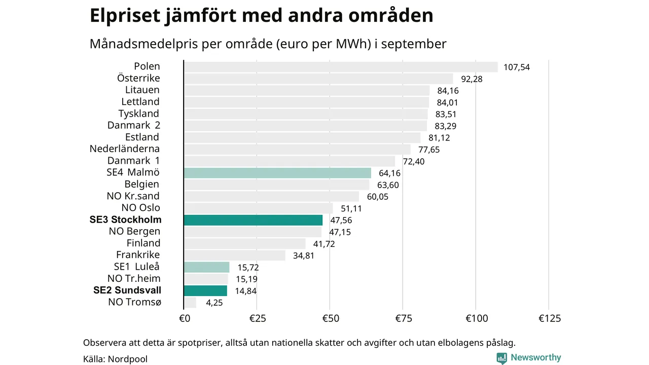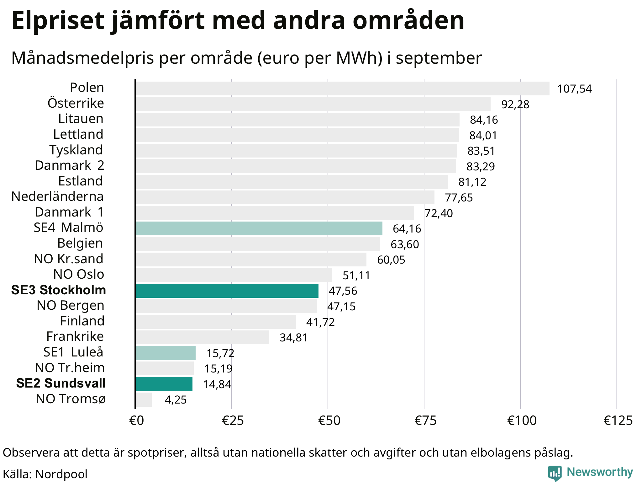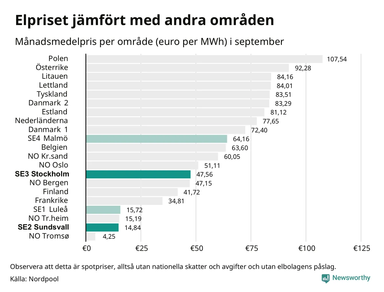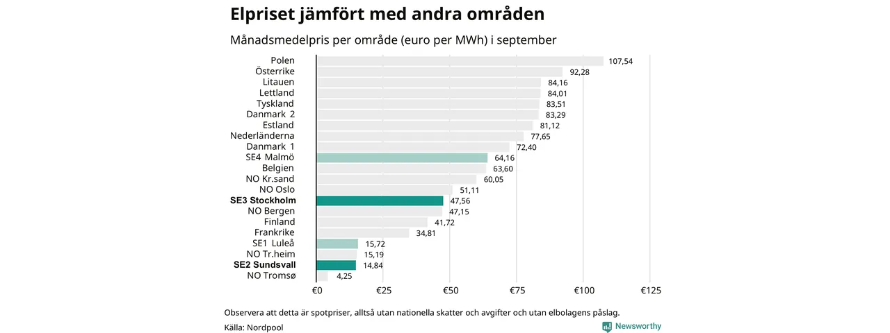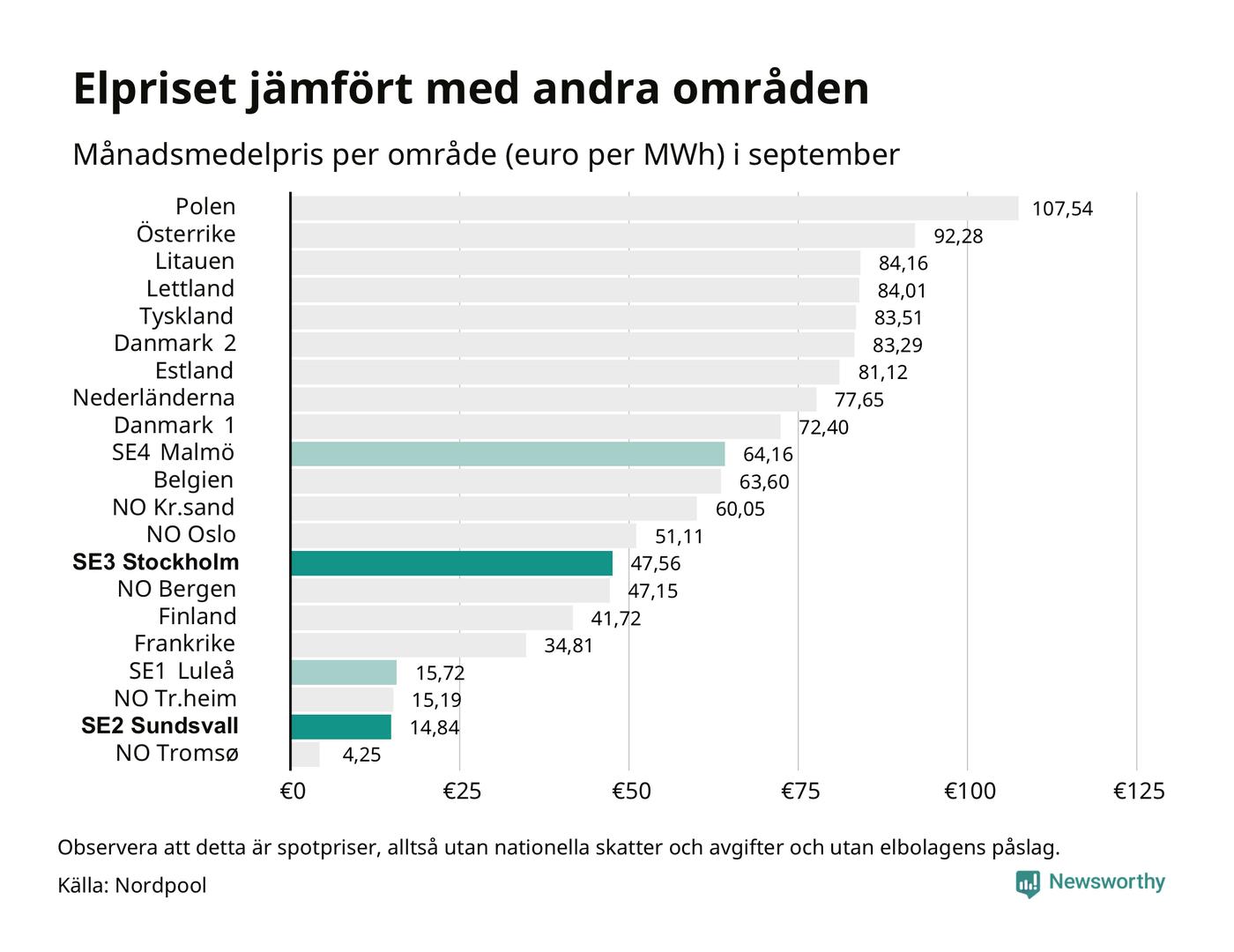 Om man tittar på månadsmedelpriset brukar de svenska elområdena oftast tillhöra de med lägst spotpriser i en europeisk jämförelse. Värt att notera är att detta handlar om spotpriser, de priser konsumenten sedan betalar beror på nationella avgifter och skatter samt elbolagens påslag. I praktiken ligger de svenska konsumentpriserna närmare det europeiska snittet efter skatter och påslag.