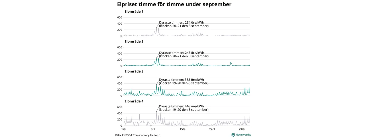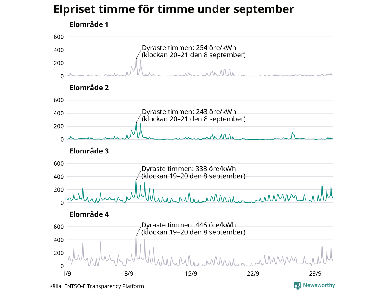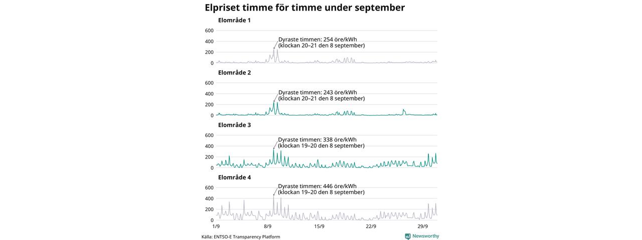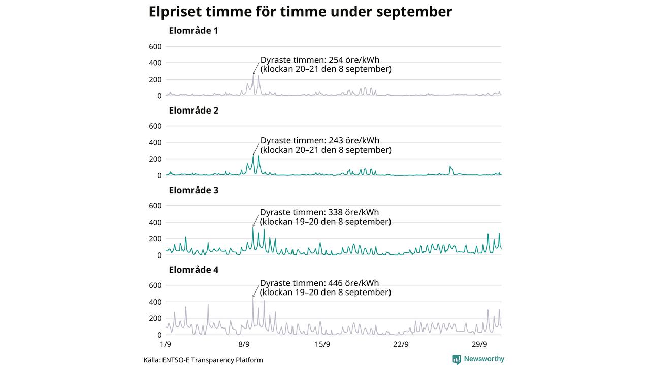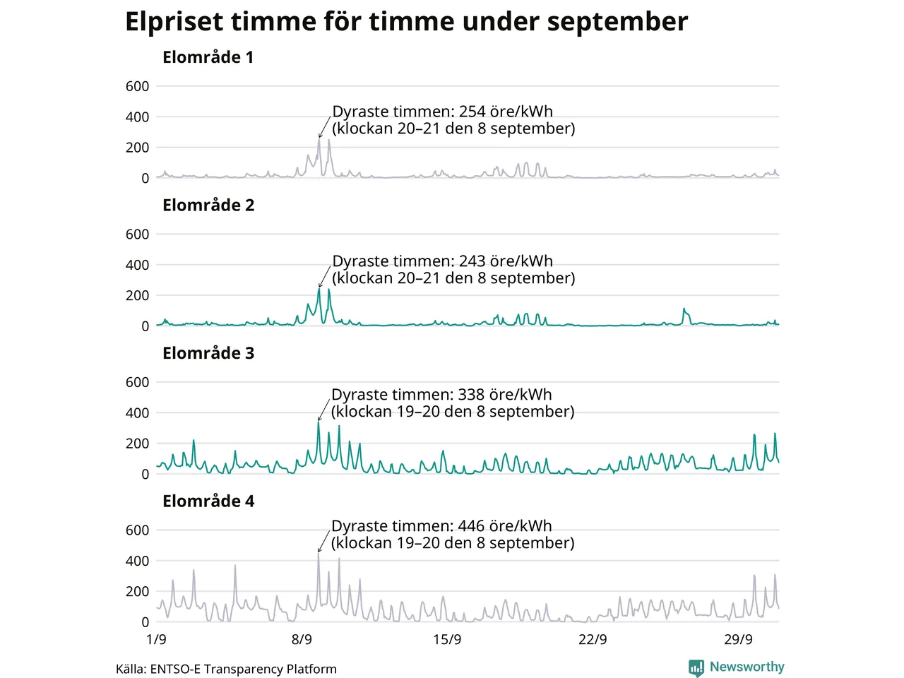 Det är inte bara prisskillnaderna mellan prisområdena som har ökat de senaste åren, även inom områdena pendlar priserna timme för timme – och skillnaderna mellan de dyraste och billigaste timmarna har blivit större sedan 2020. Dyraste timmen i september i elområde 3 inträffade mellan klockan 19 och 20 den 8 september, då kostade en kilowattimme 338 öre. Som lägst var priset i området −2 öre. I elområde 2 toppade priset mellan klockan 20 och 21 den 8 september på 243 öre per kilowattimme. Som lägst kostade elen i området −1 öre per kilowattimme.