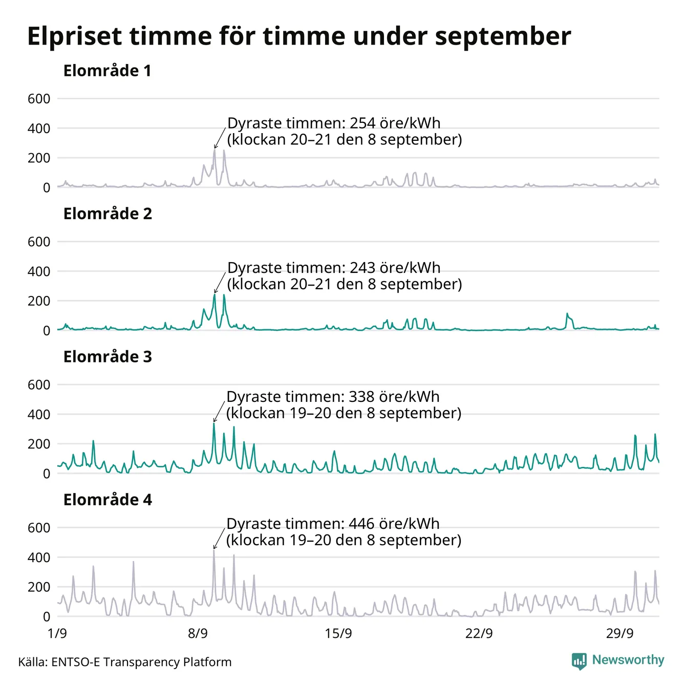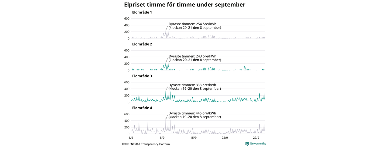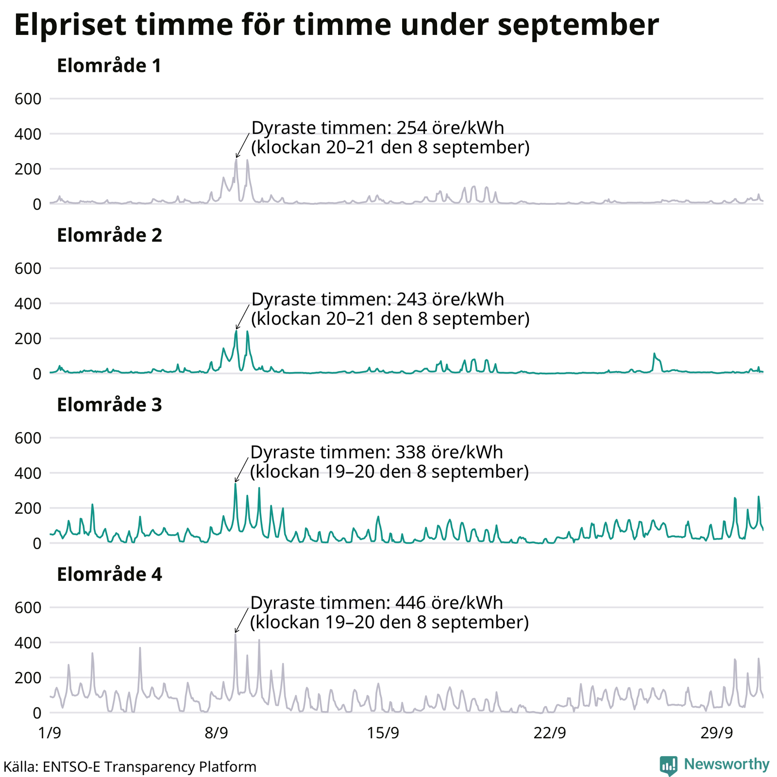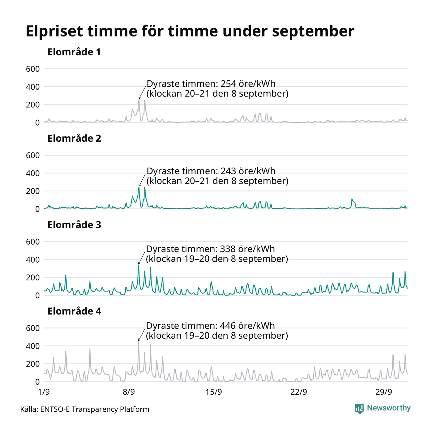 Det är inte bara prisskillnaderna mellan prisområdena som har ökat de senaste åren, även inom områdena pendlar priserna timme för timme – och skillnaderna mellan de dyraste och billigaste timmarna har blivit större sedan 2020. Dyraste timmen i september i elområde 3 inträffade mellan klockan 19 och 20 den 8 september, då kostade en kilowattimme 338 öre. Som lägst var priset i området −2 öre. I elområde 2 toppade priset mellan klockan 20 och 21 den 8 september på 243 öre per kilowattimme. Som lägst kostade elen i området −1 öre per kilowattimme.