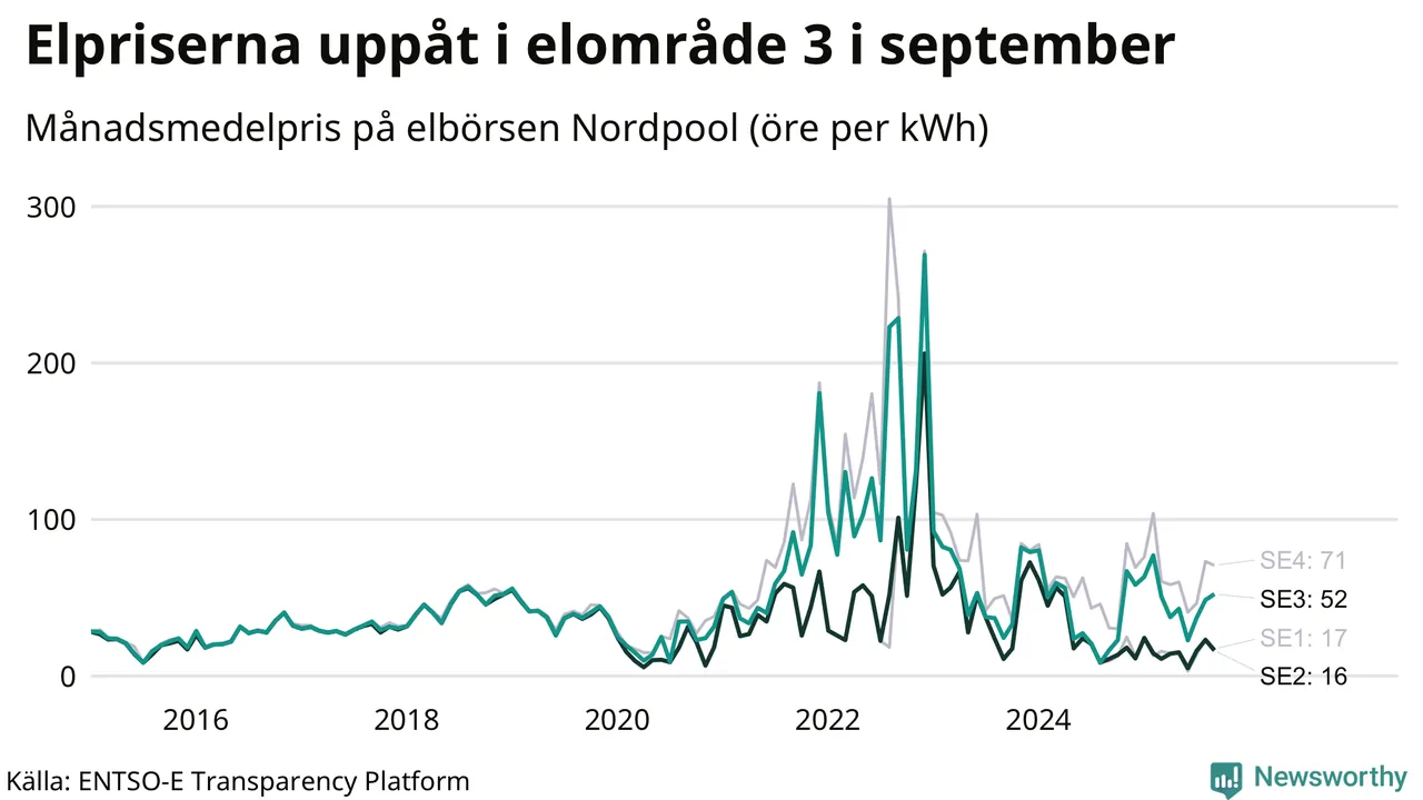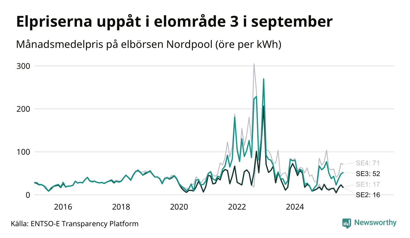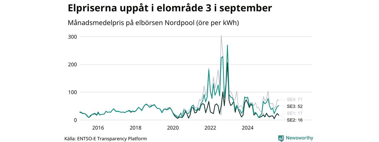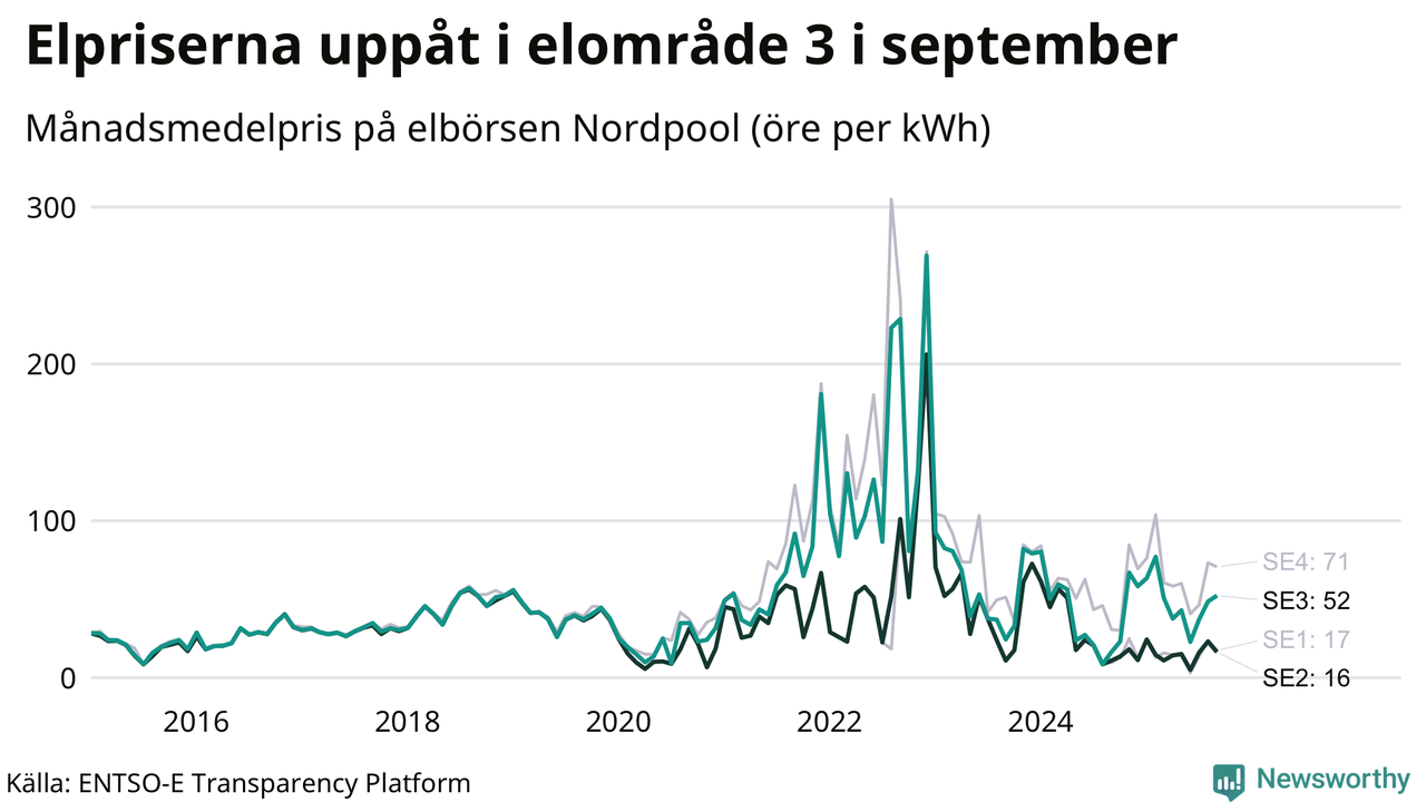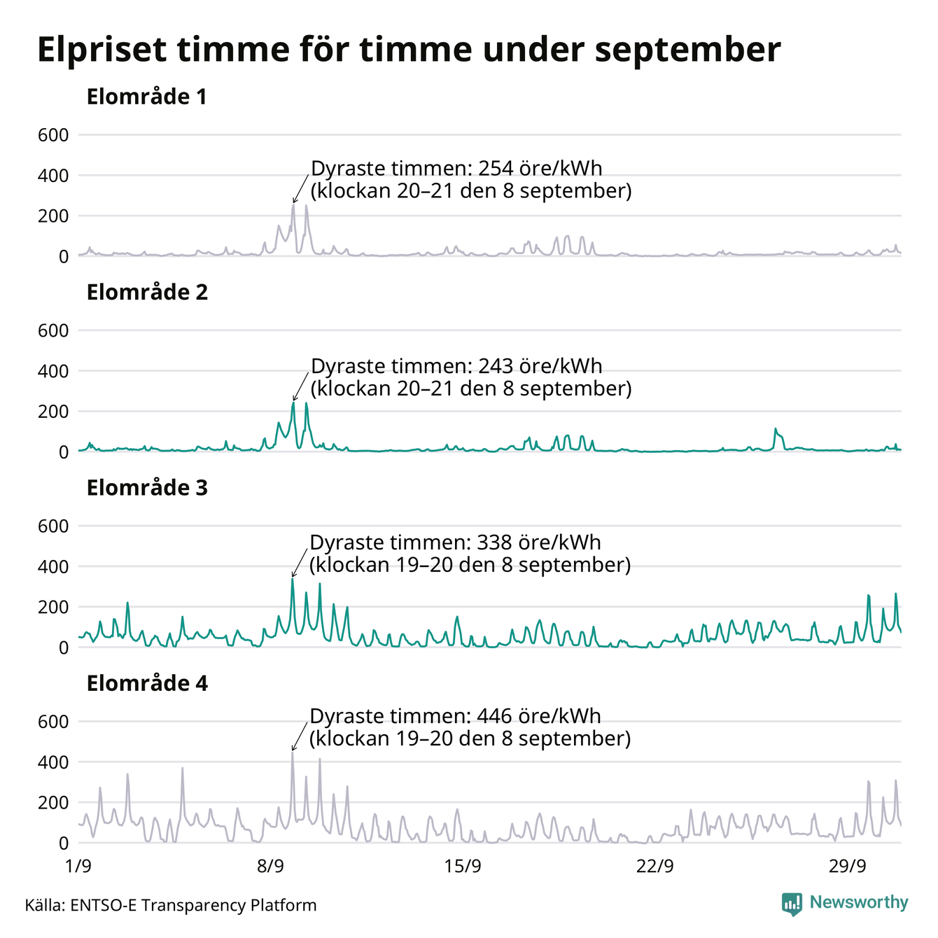 Det är inte bara prisskillnaderna mellan prisområdena som har ökat de senaste åren, även inom områdena pendlar priserna timme för timme – och skillnaderna mellan de dyraste och billigaste timmarna har blivit större sedan 2020. Dyraste timmen i september i elområde 3 inträffade mellan klockan 19 och 20 den 8 september, då kostade en kilowattimme 338 öre. Som lägst var priset i området −2 öre. I elområde 2 toppade priset mellan klockan 20 och 21 den 8 september på 243 öre per kilowattimme. Som lägst kostade elen i området −1 öre per kilowattimme.