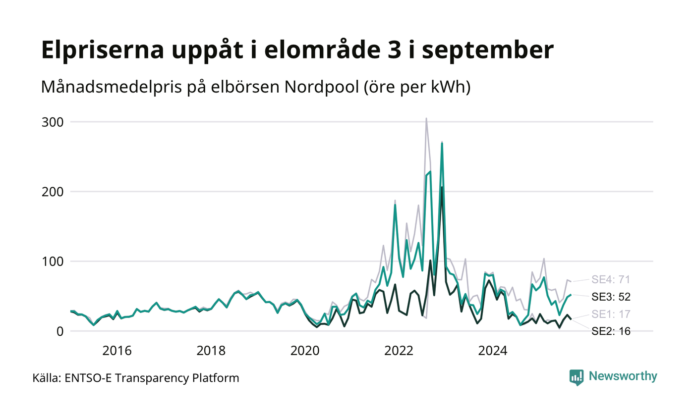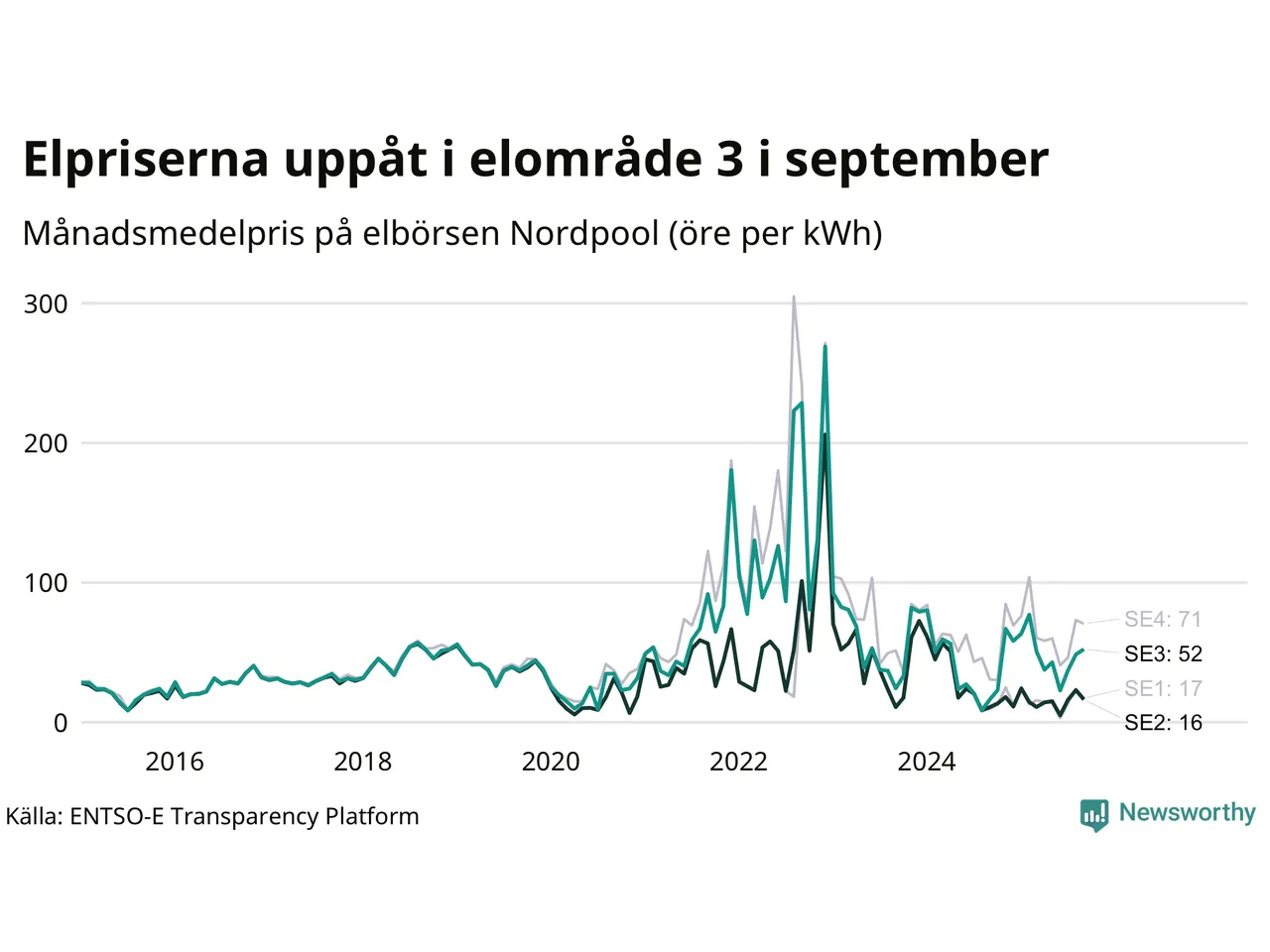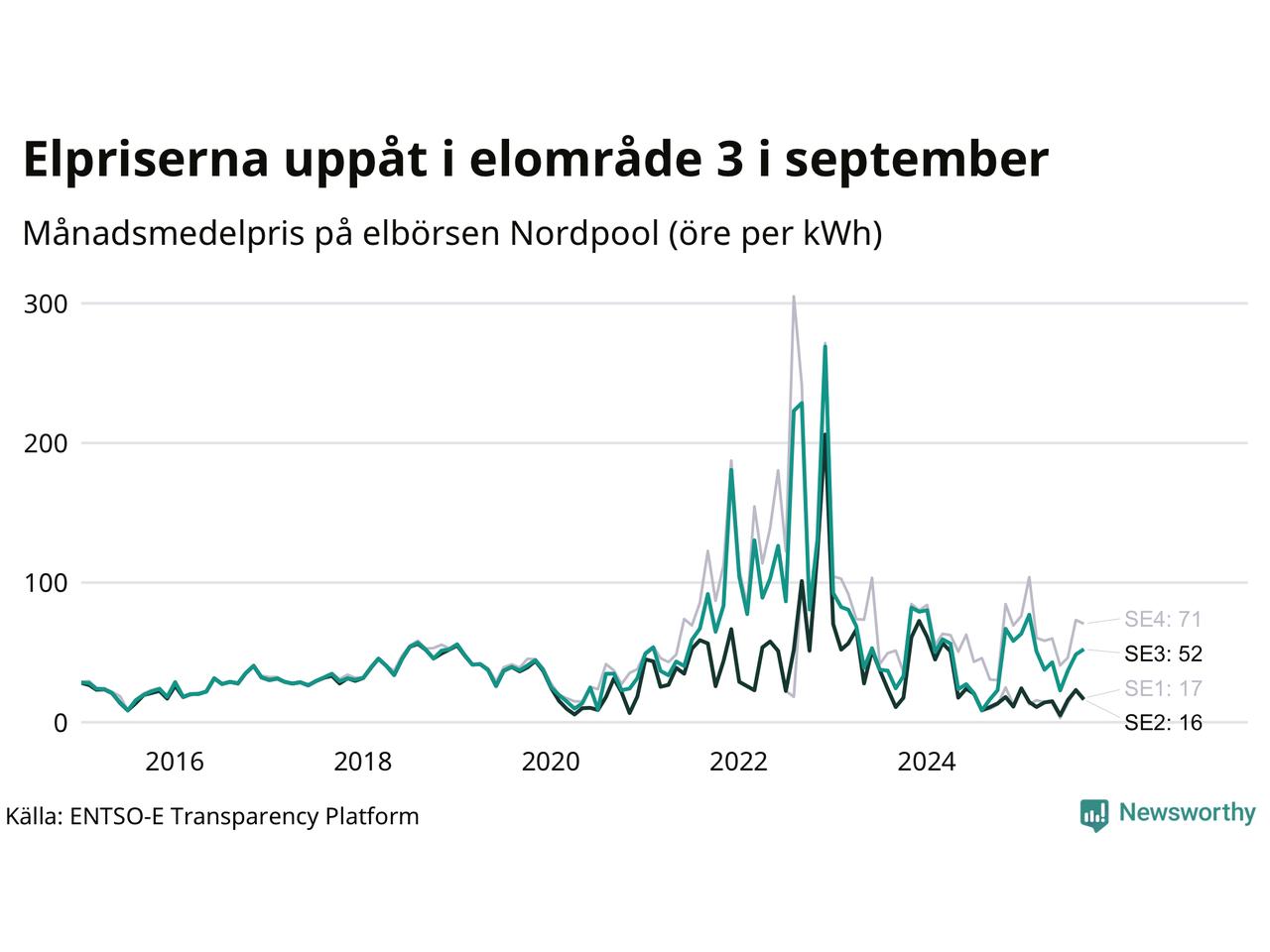 Gävle kommun tillhör två elområden, tätorten Gävle ligger i elområde 3, medan till exempel Bergby och Norrsundet tillhör elområde 2. Spotpriset – alltså priset som elbolagen köper in elen för – landade på 52 öre per kilowattimme i elområde 3 och 16 öre per kilowattimme i elområde 2 i september. Motsvarande priser i augusti var 49 öre (elområde 3) och 23 öre per kilowattimme (elområde 2). Rekordnoteringarna är 269 öre per kilowattimme i elområde 3 och 206 öre per kilowattimme i elområde 2. De noterades i december 2022. För ett år sedan, i september 2024, var snittpriset 16 öre per kilowattimme i elområde 3 och 11 öre per kilowattimme i elområde 2.