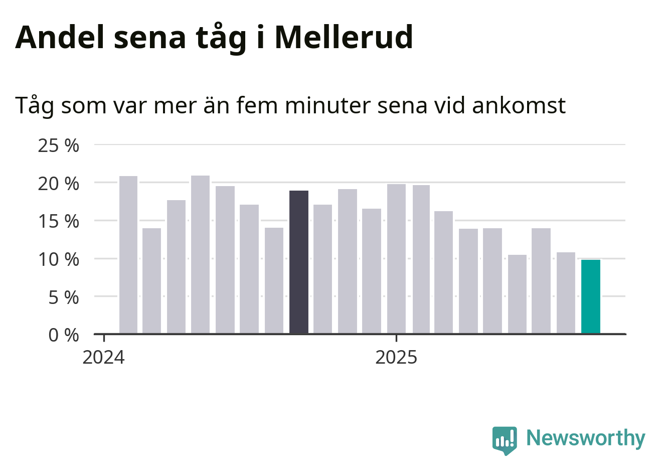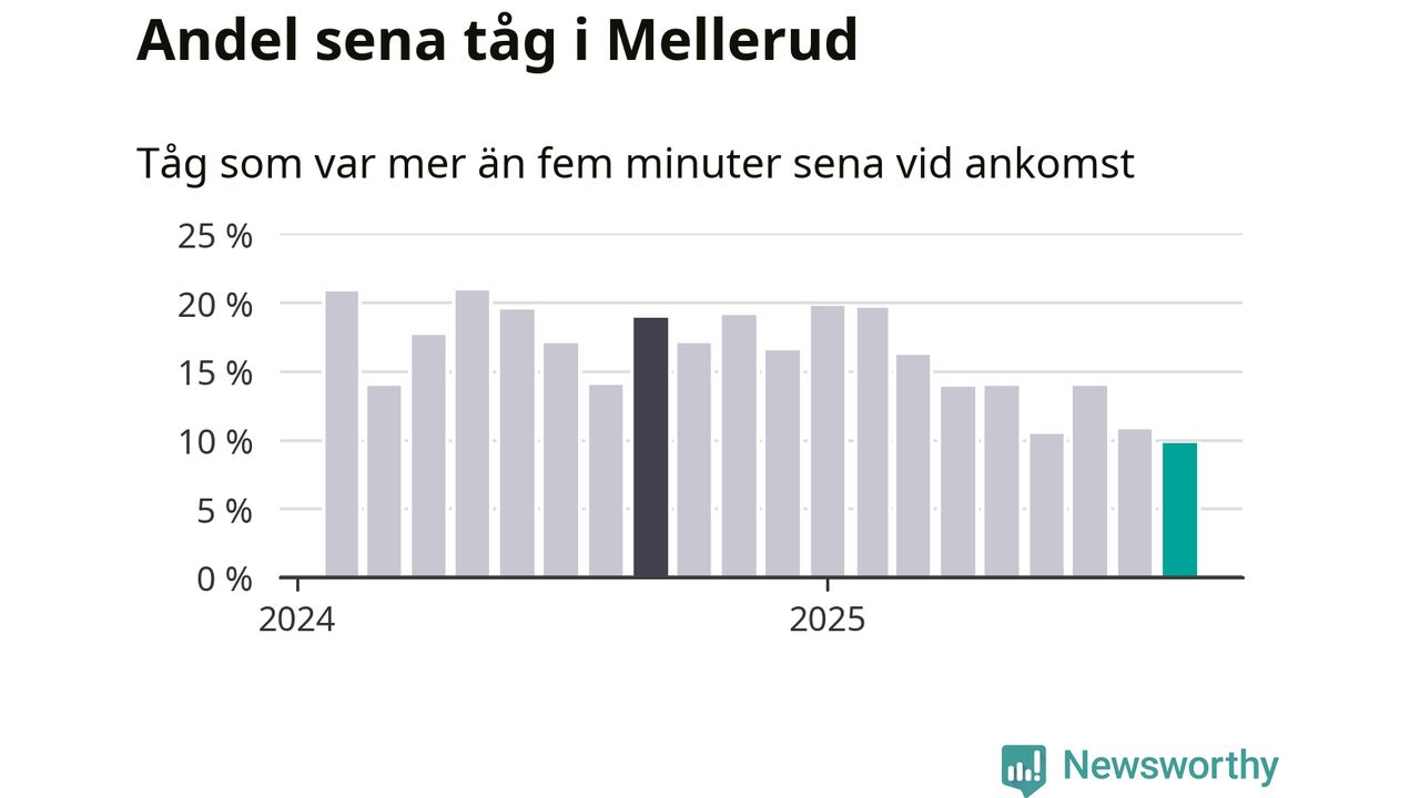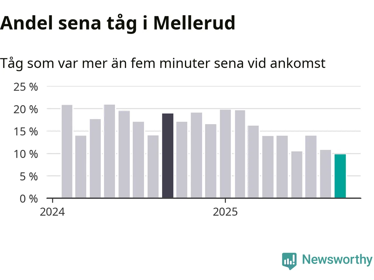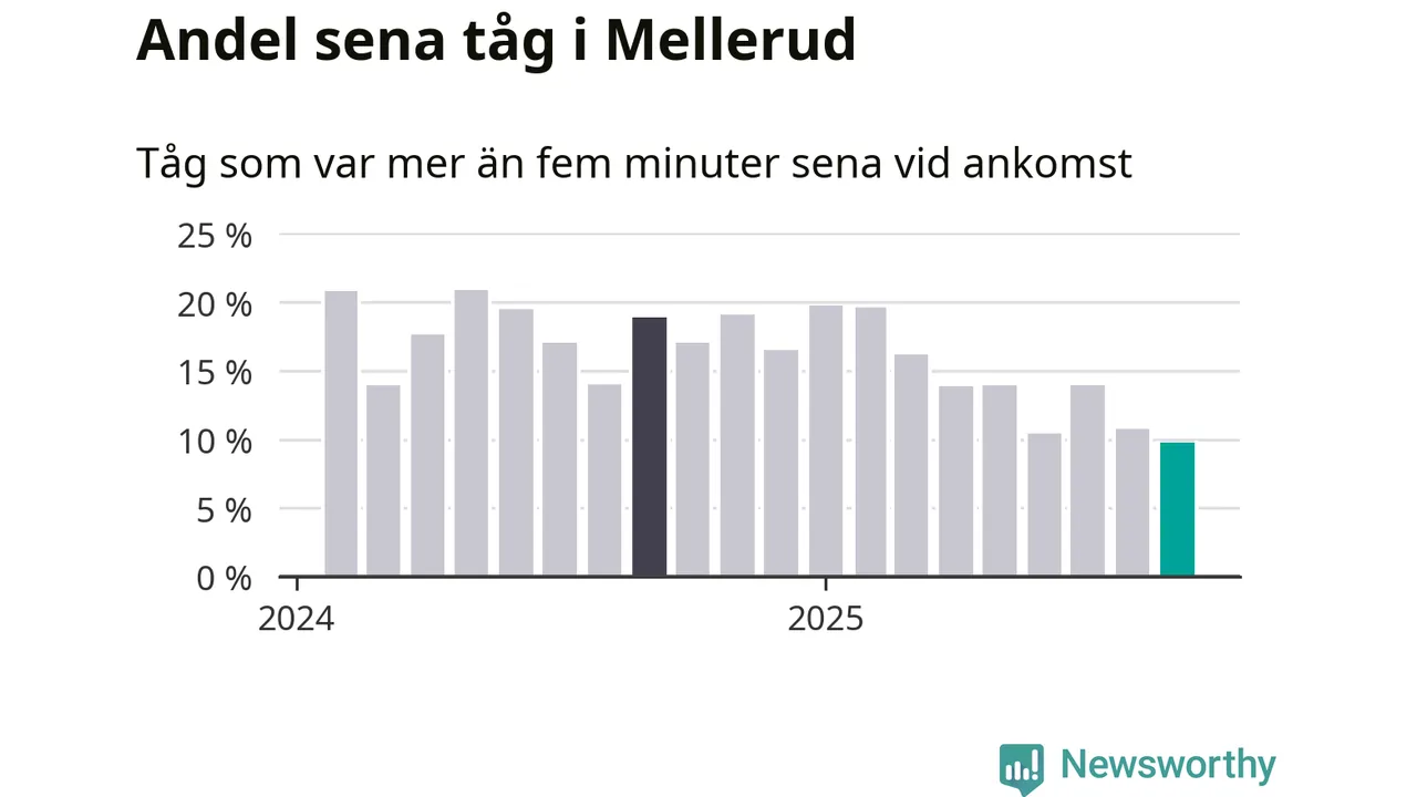Tio procent är den lägsta andelen sena tåg sedan Newsworthy började mäta lokala förseningar i början av 2024. Siffrorna bygger på realtidsinformation om tågavgångar och ankomster från Trafikverket, som Newsworthy löpande samlar in.