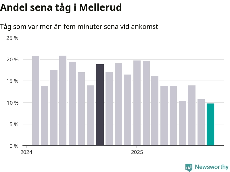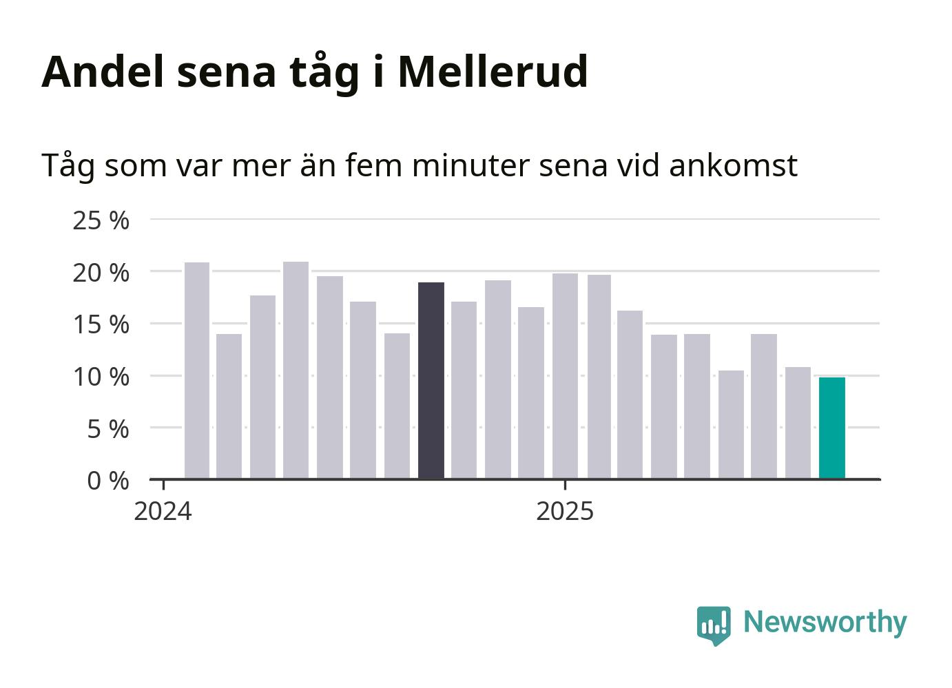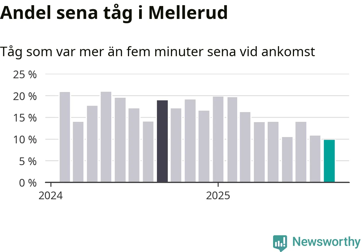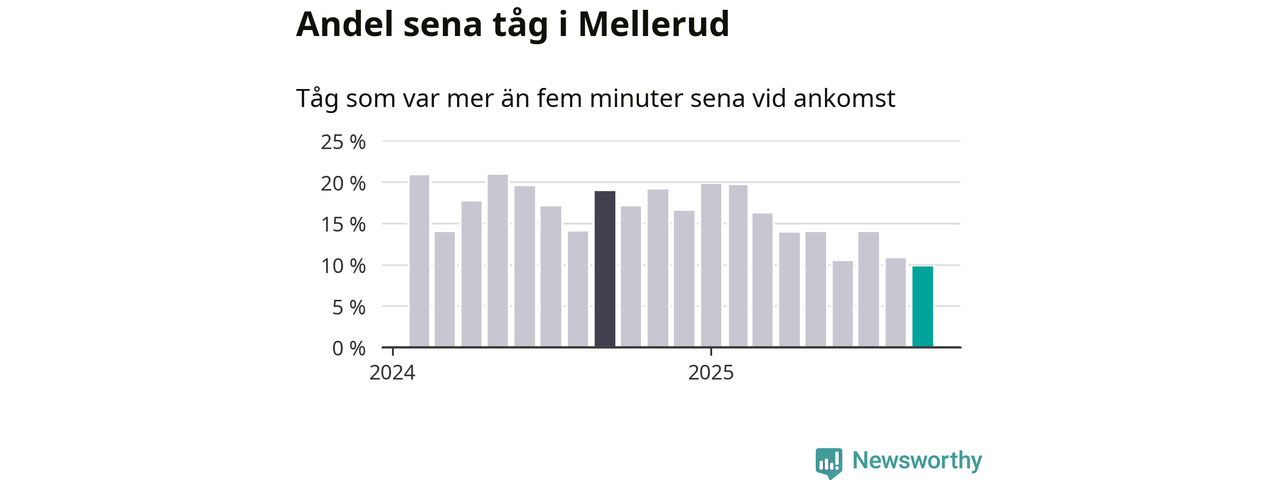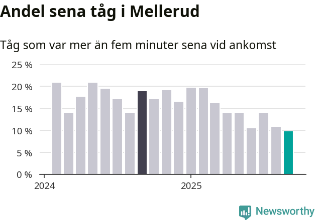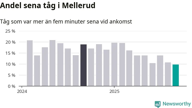 Tio procent är den lägsta andelen sena tåg sedan Newsworthy började mäta lokala förseningar i början av 2024. Siffrorna bygger på realtidsinformation om tågavgångar och ankomster från Trafikverket, som Newsworthy löpande samlar in.