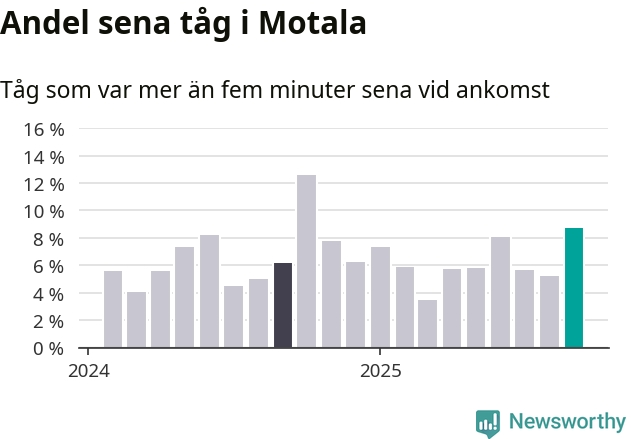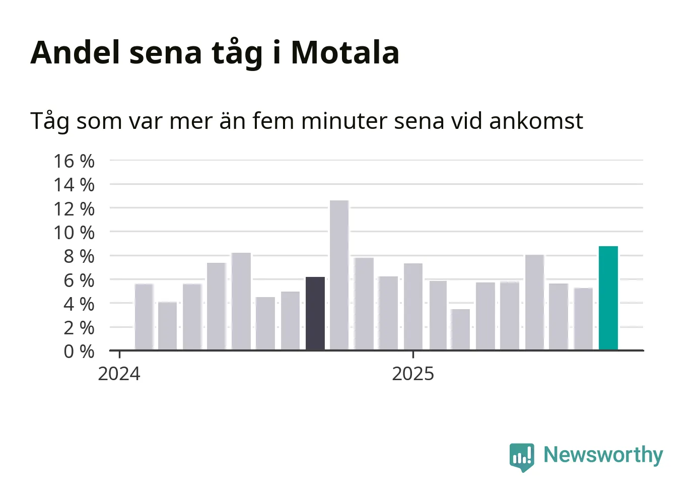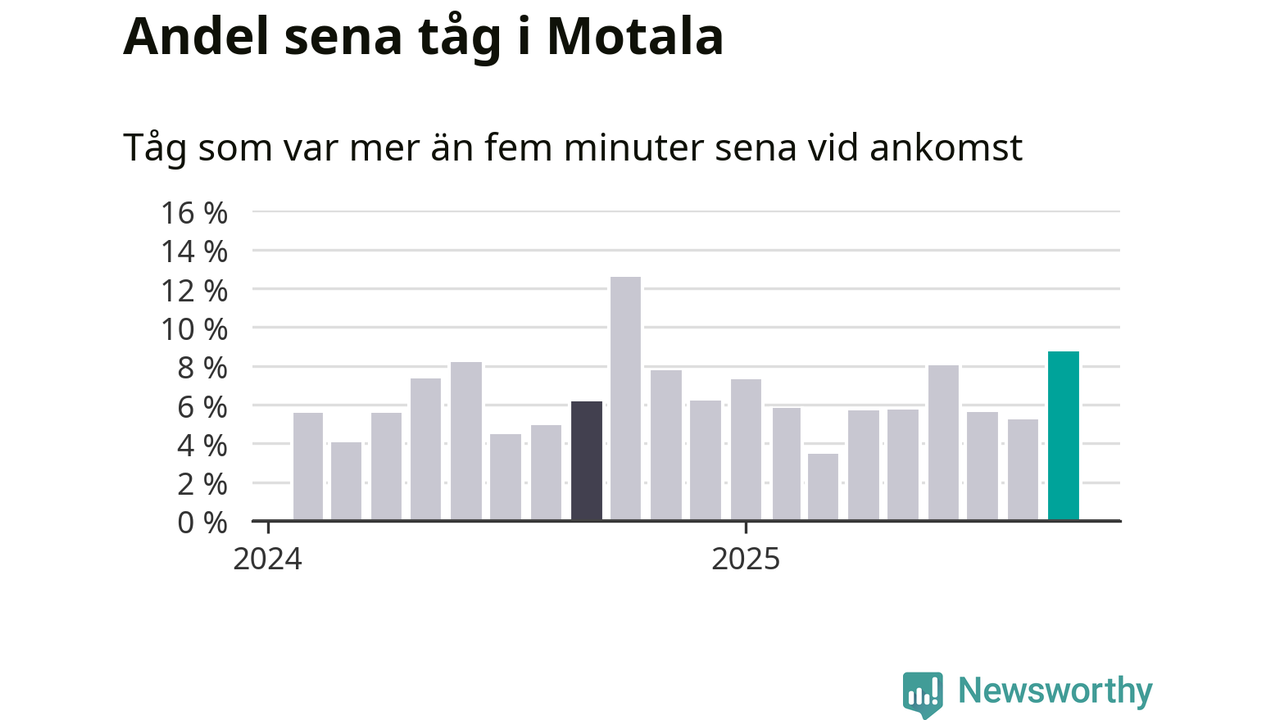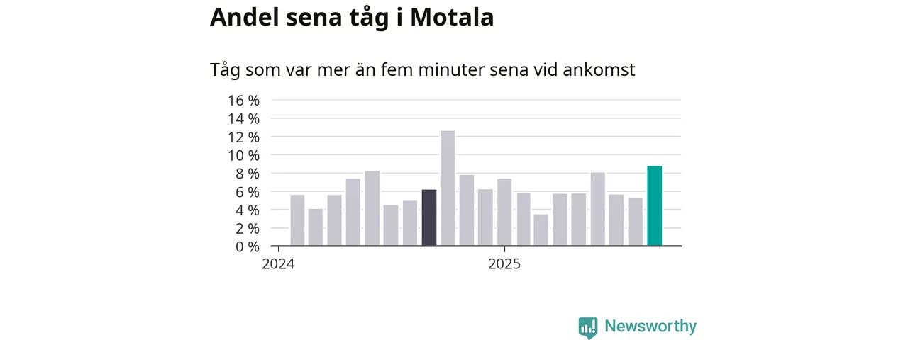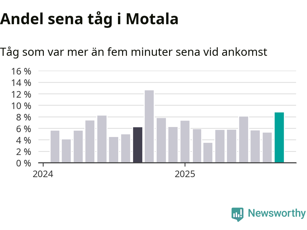 Nio procent kan jämföras med fem procent månaden innan, och sex procent i september 2024. Siffrorna bygger på realtidsinformation om tågavgångar och ankomster från Trafikverket, som Newsworthy löpande samlar in.