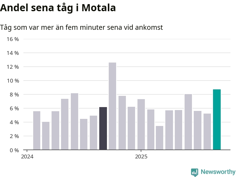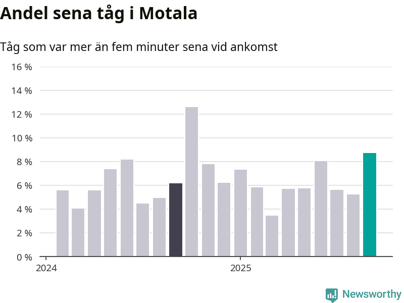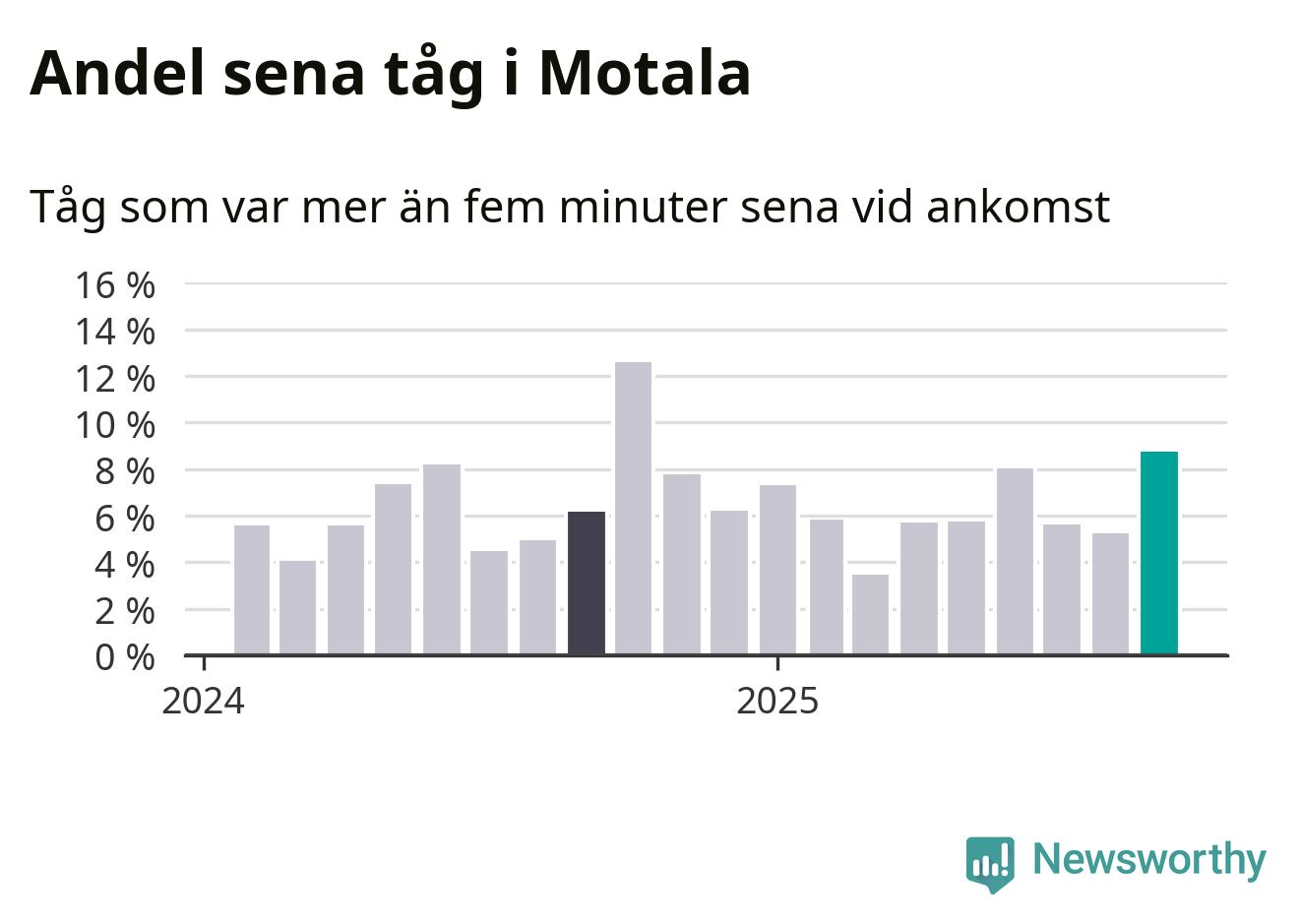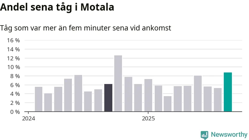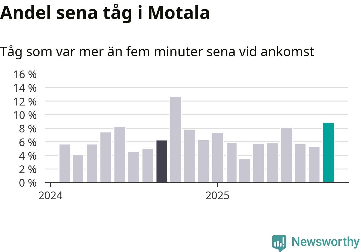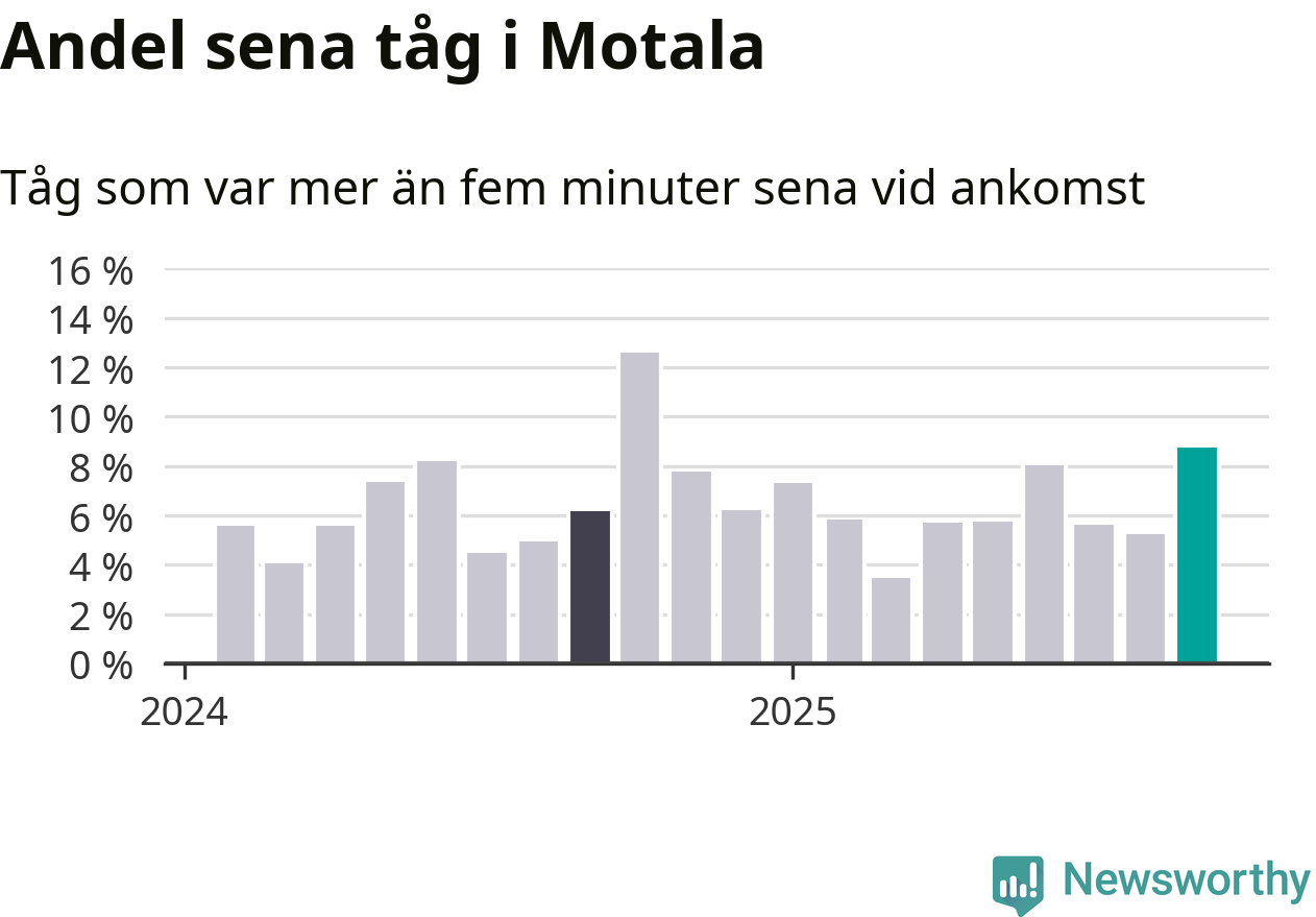 Nio procent kan jämföras med fem procent månaden innan, och sex procent i september 2024. Siffrorna bygger på realtidsinformation om tågavgångar och ankomster från Trafikverket, som Newsworthy löpande samlar in.