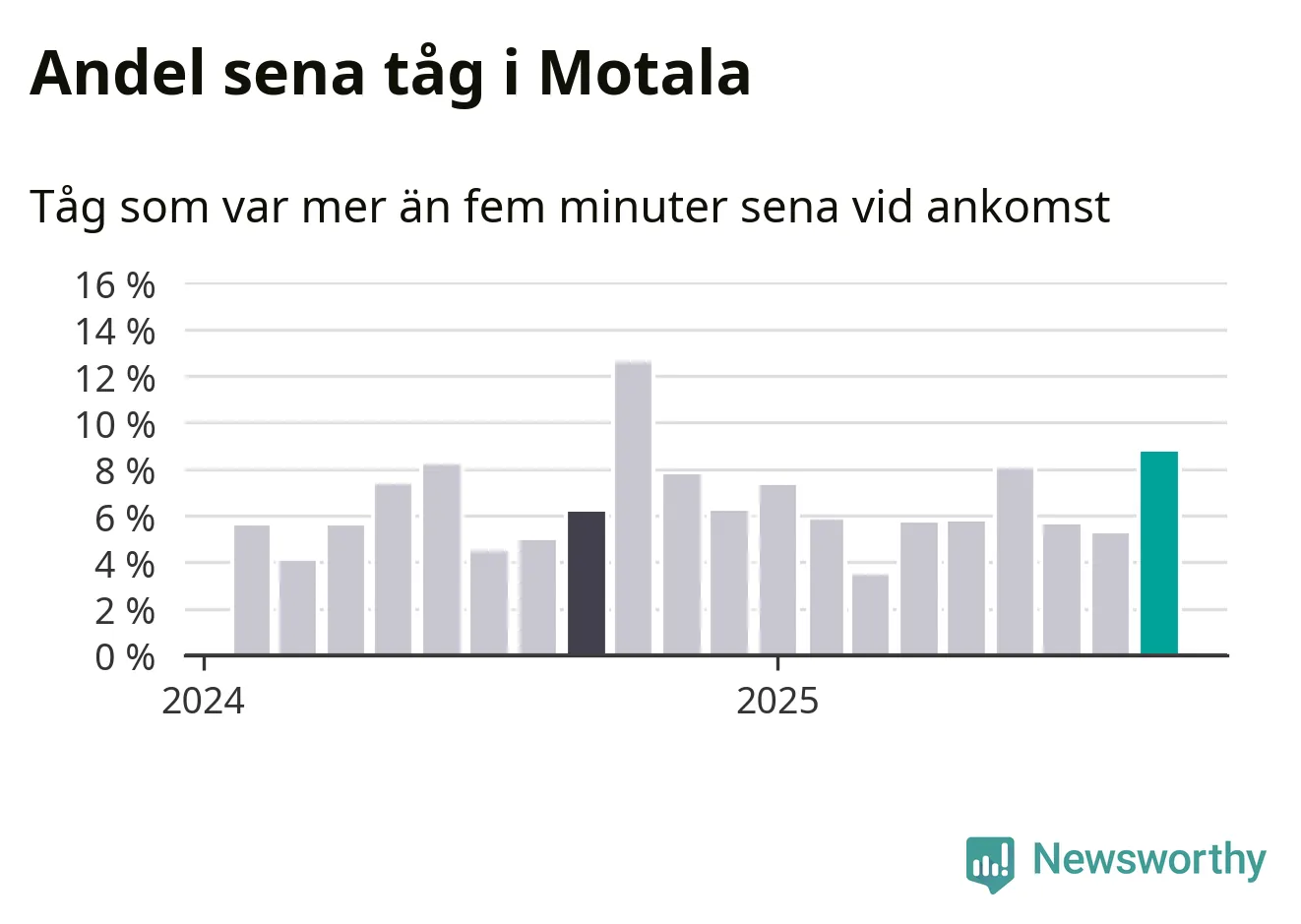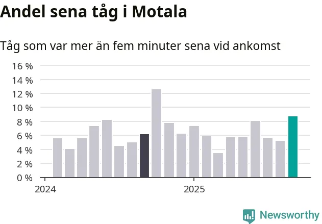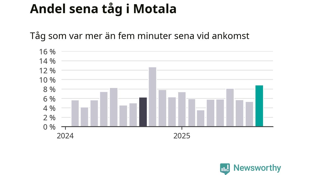 Av knappt 1 400 tåg som passerade Motala C i september var 118 mer än fem minuter sena. Det motsvarar 9 procent, en bit över den nationella målsättningen som säger att inte mer än fem procent av tågen ska vara sena.