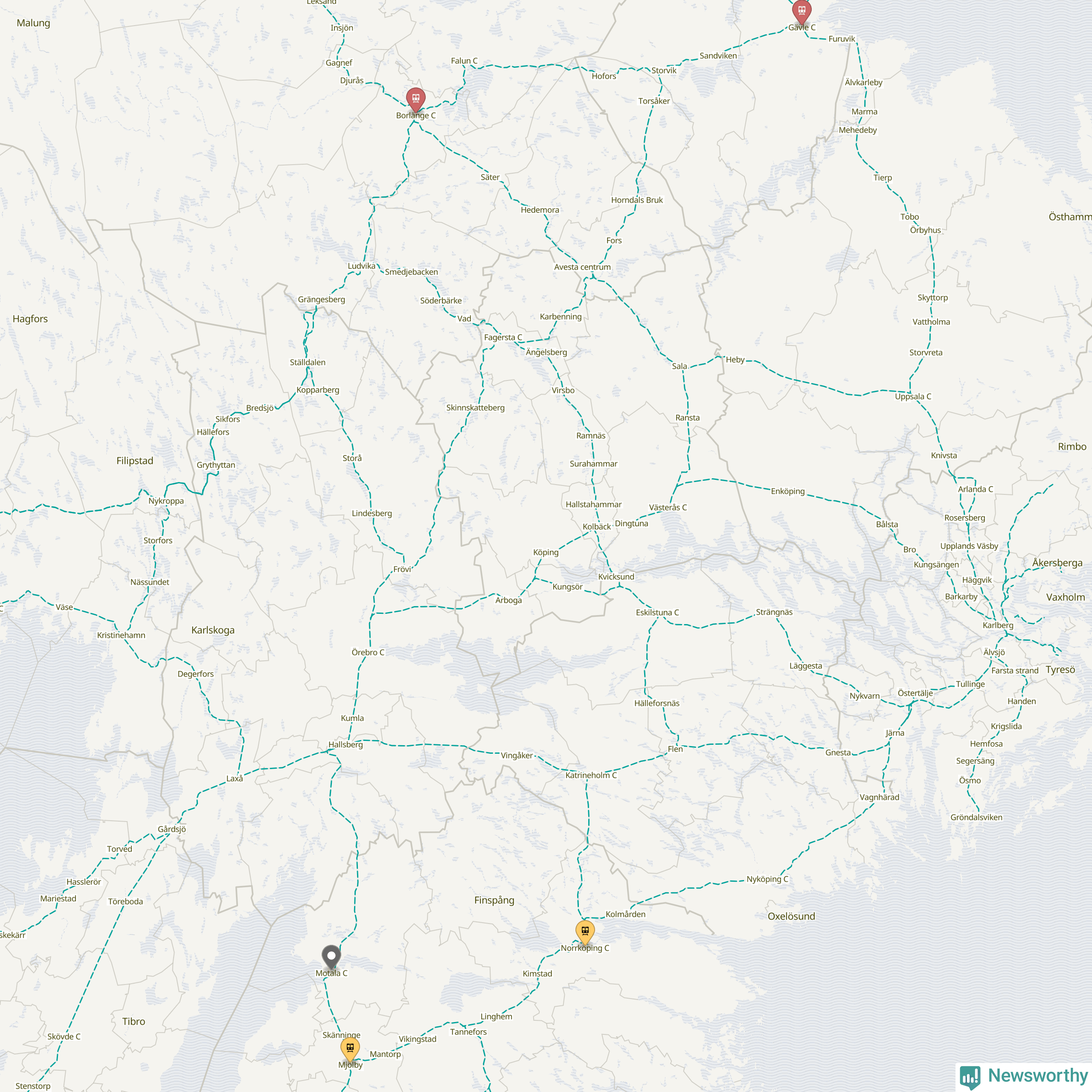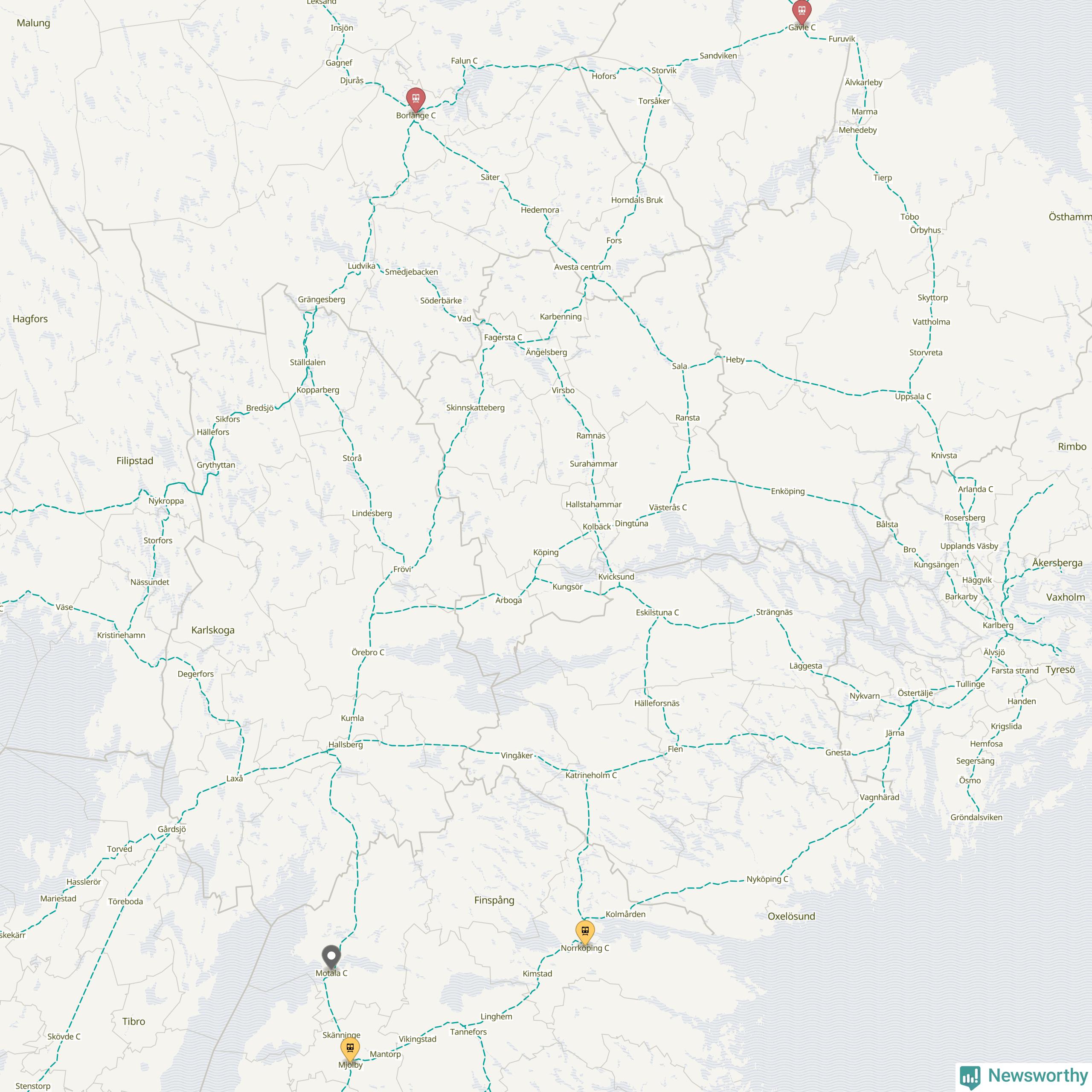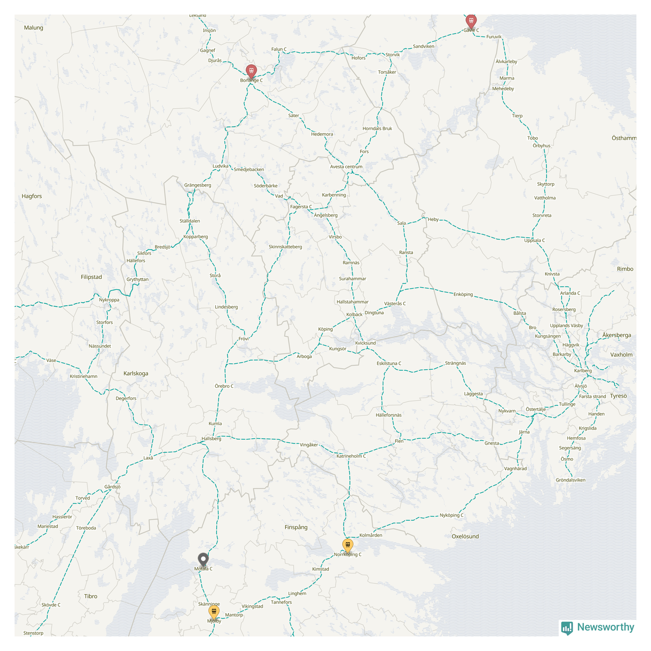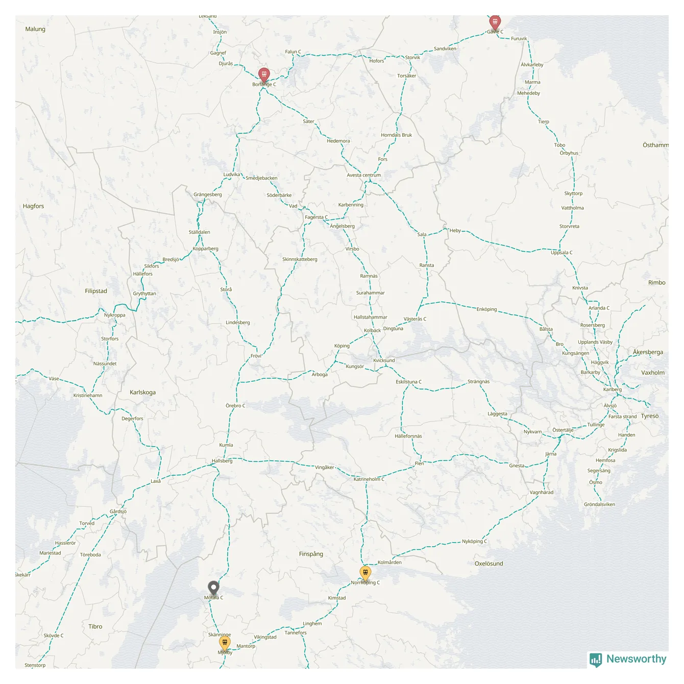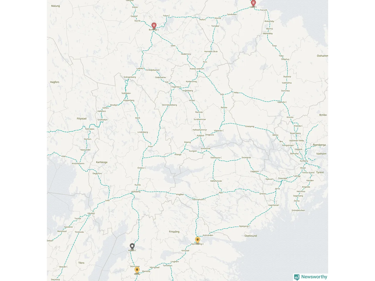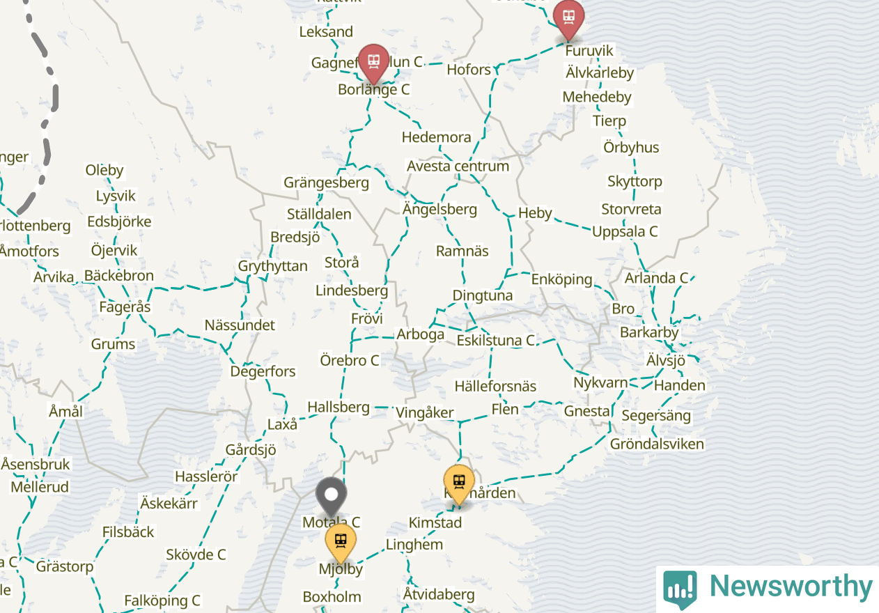 Kartdata från Mapbox, Newsworthy, OpenStreetMap och Trafikverket. Uppgifter om sträckor med passagerartrafik från jarnvag.net.