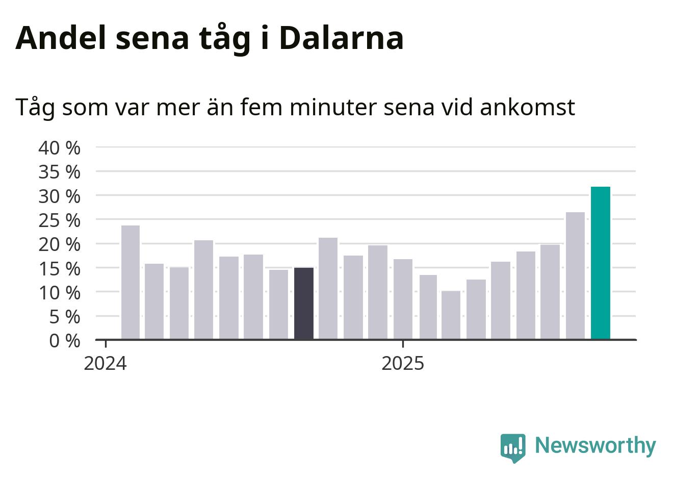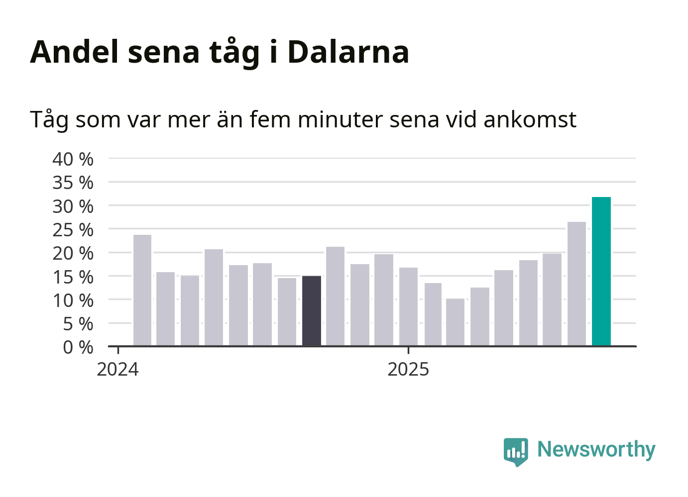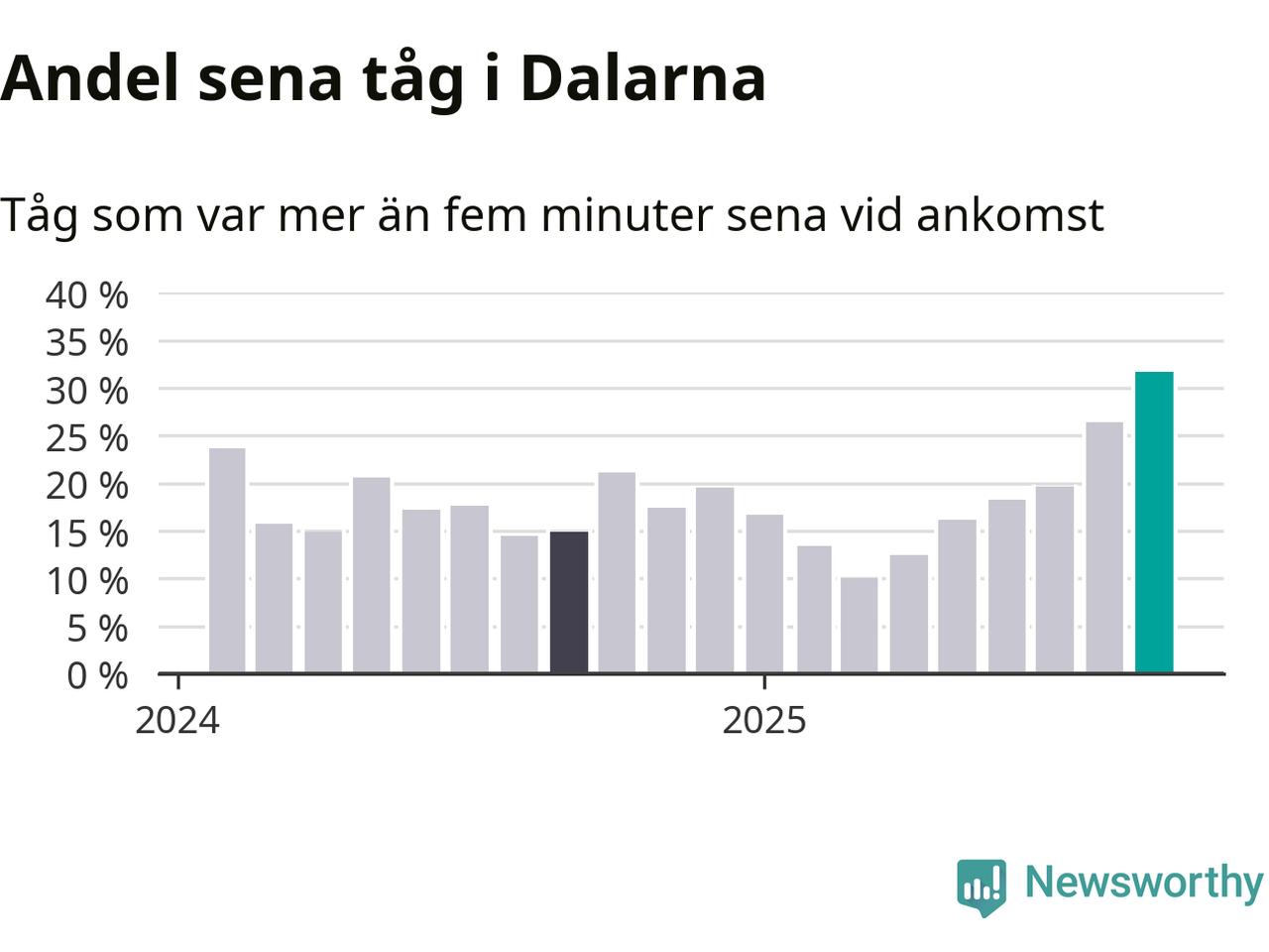 32 procent är den högsta andelen sena tåg sedan åtminstone den hårt förseningsdrabbade vintern 2023/24. Siffrorna bygger på realtidsinformation om tågavgångar och ankomster från Trafikverket, som Newsworthy löpande samlar in.