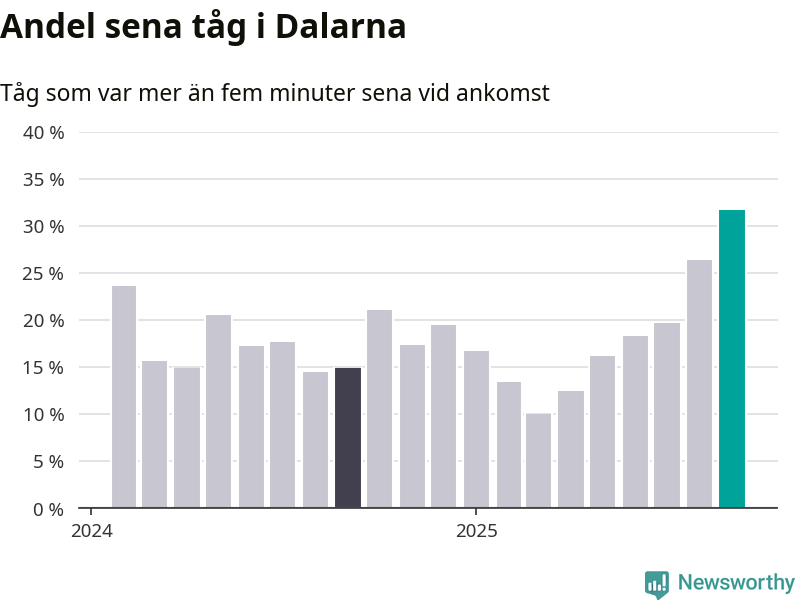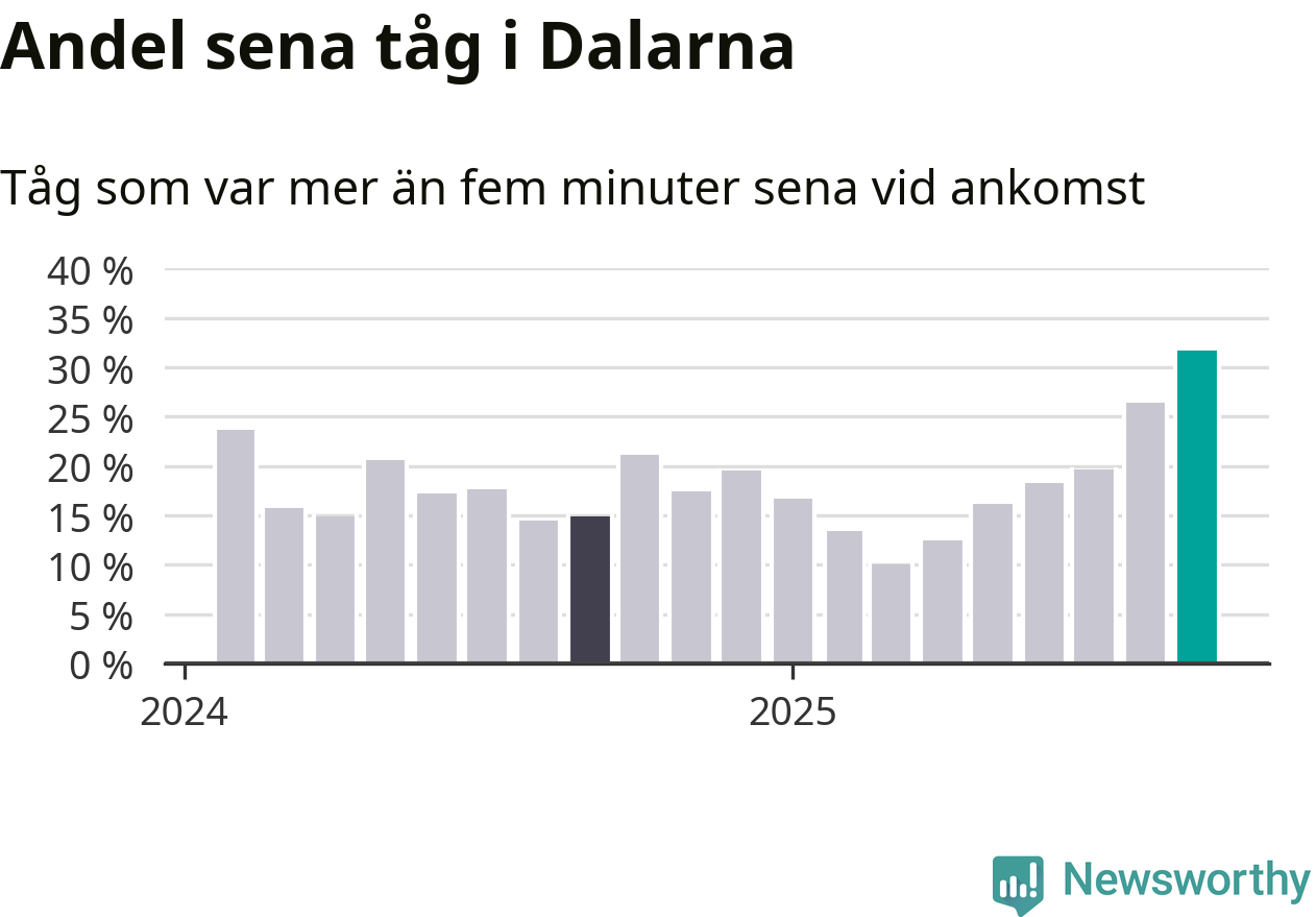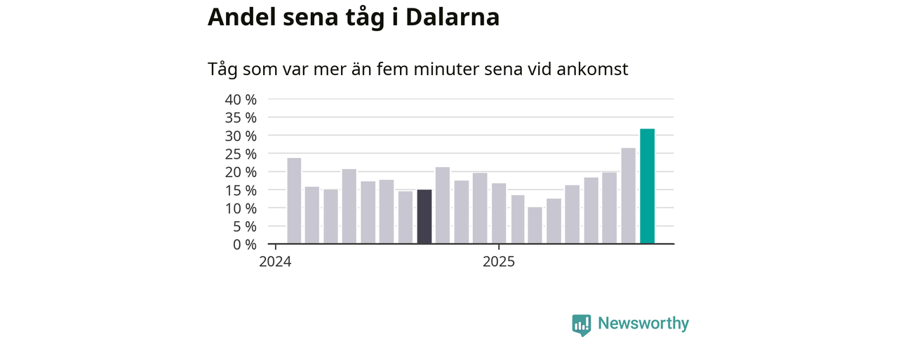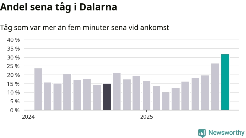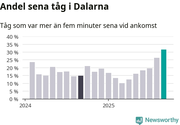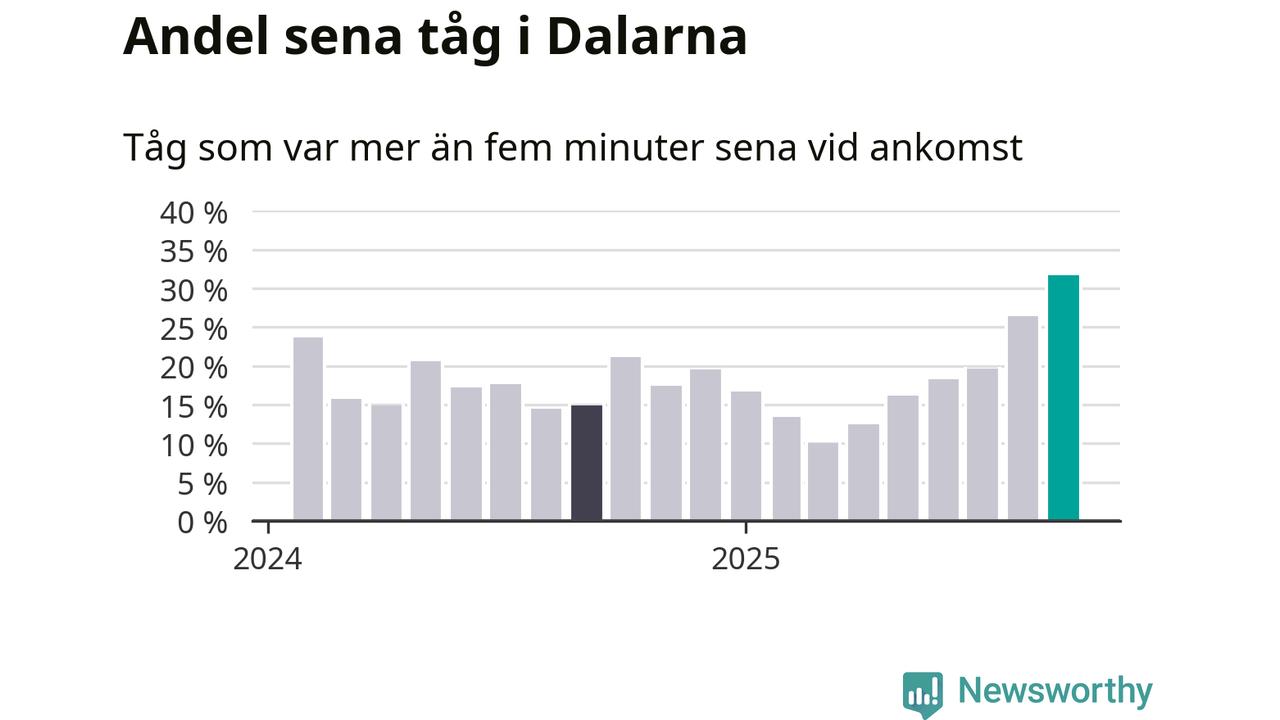 32 procent är den högsta andelen sena tåg sedan åtminstone den hårt förseningsdrabbade vintern 2023/24. Siffrorna bygger på realtidsinformation om tågavgångar och ankomster från Trafikverket, som Newsworthy löpande samlar in.
