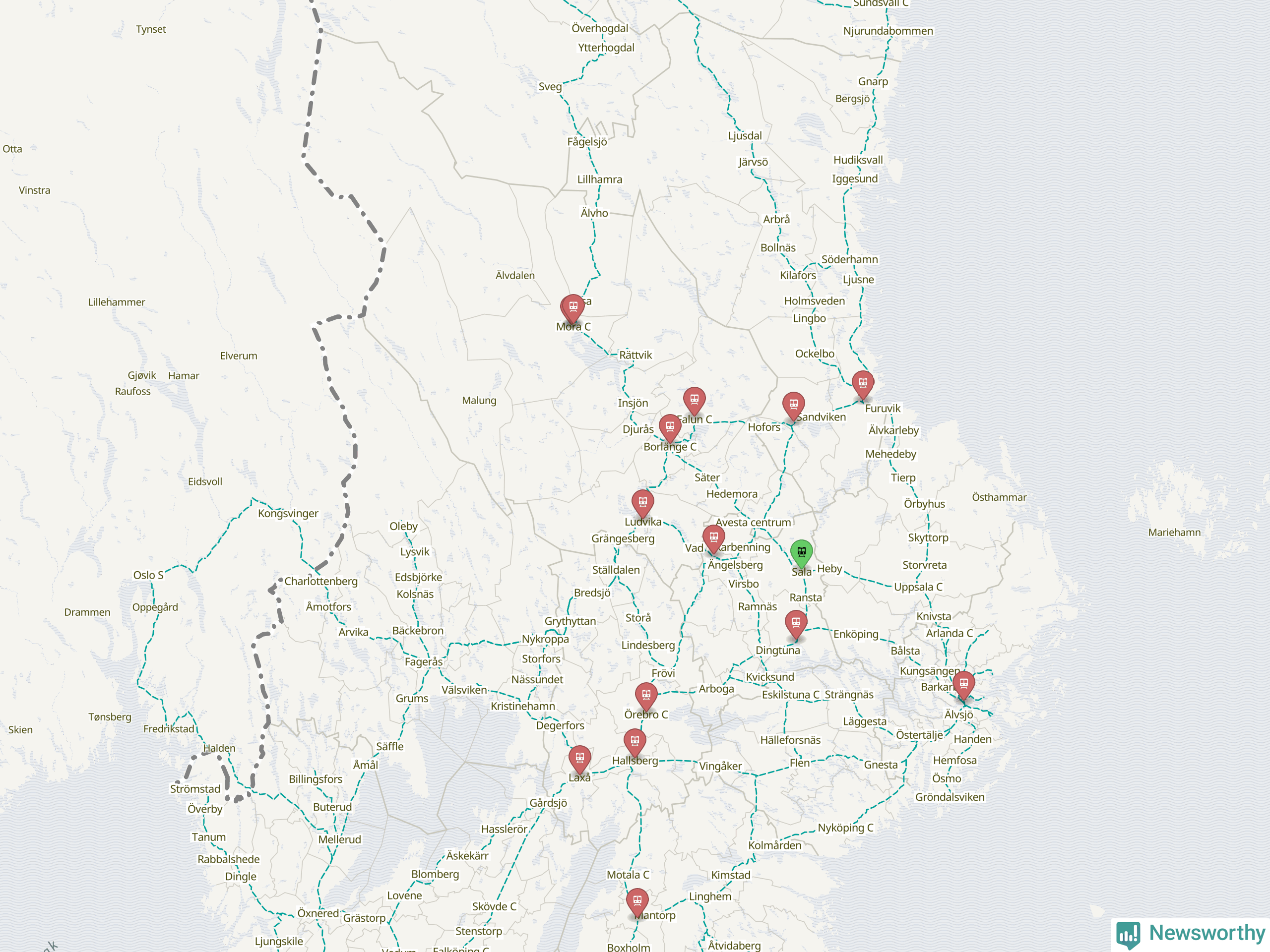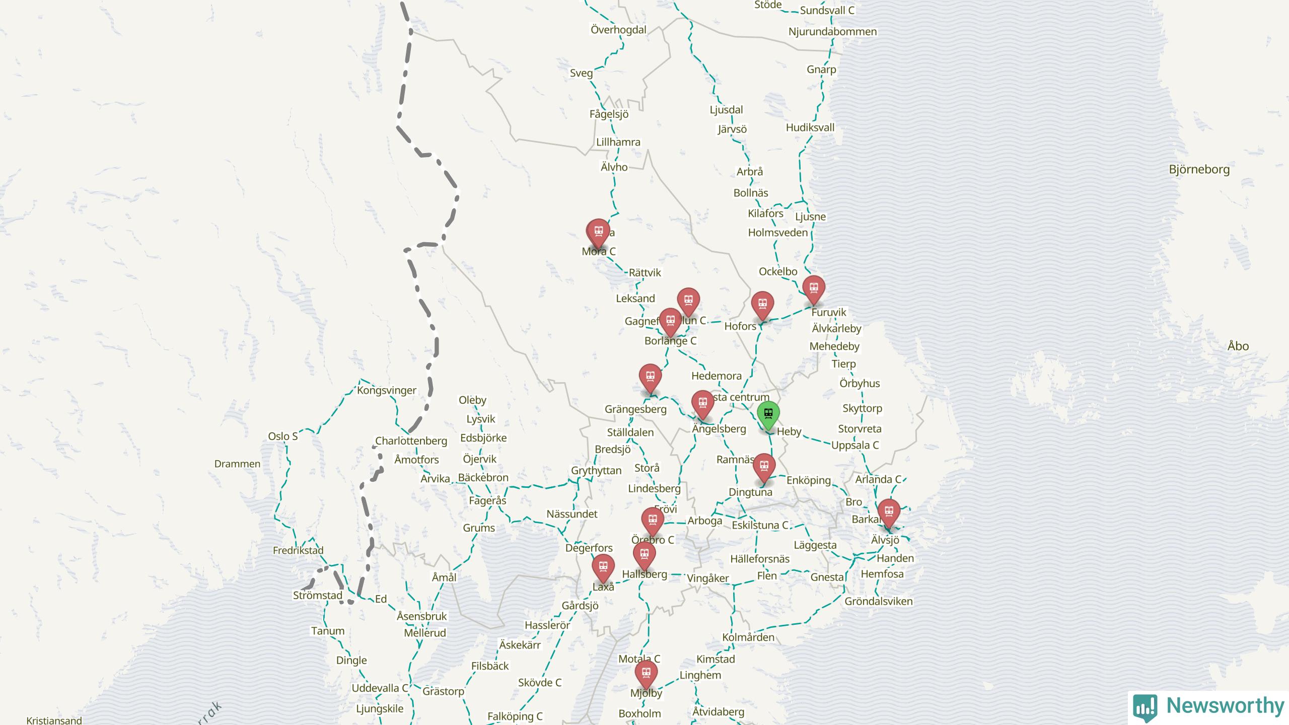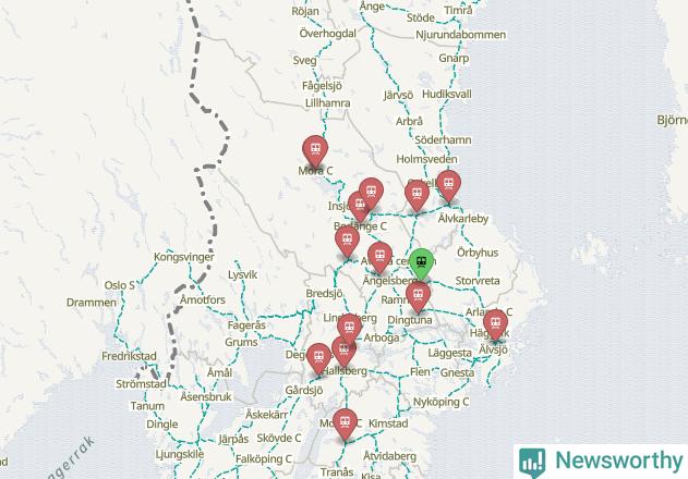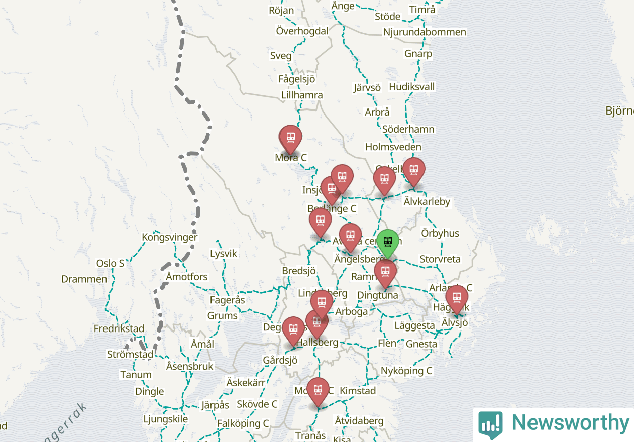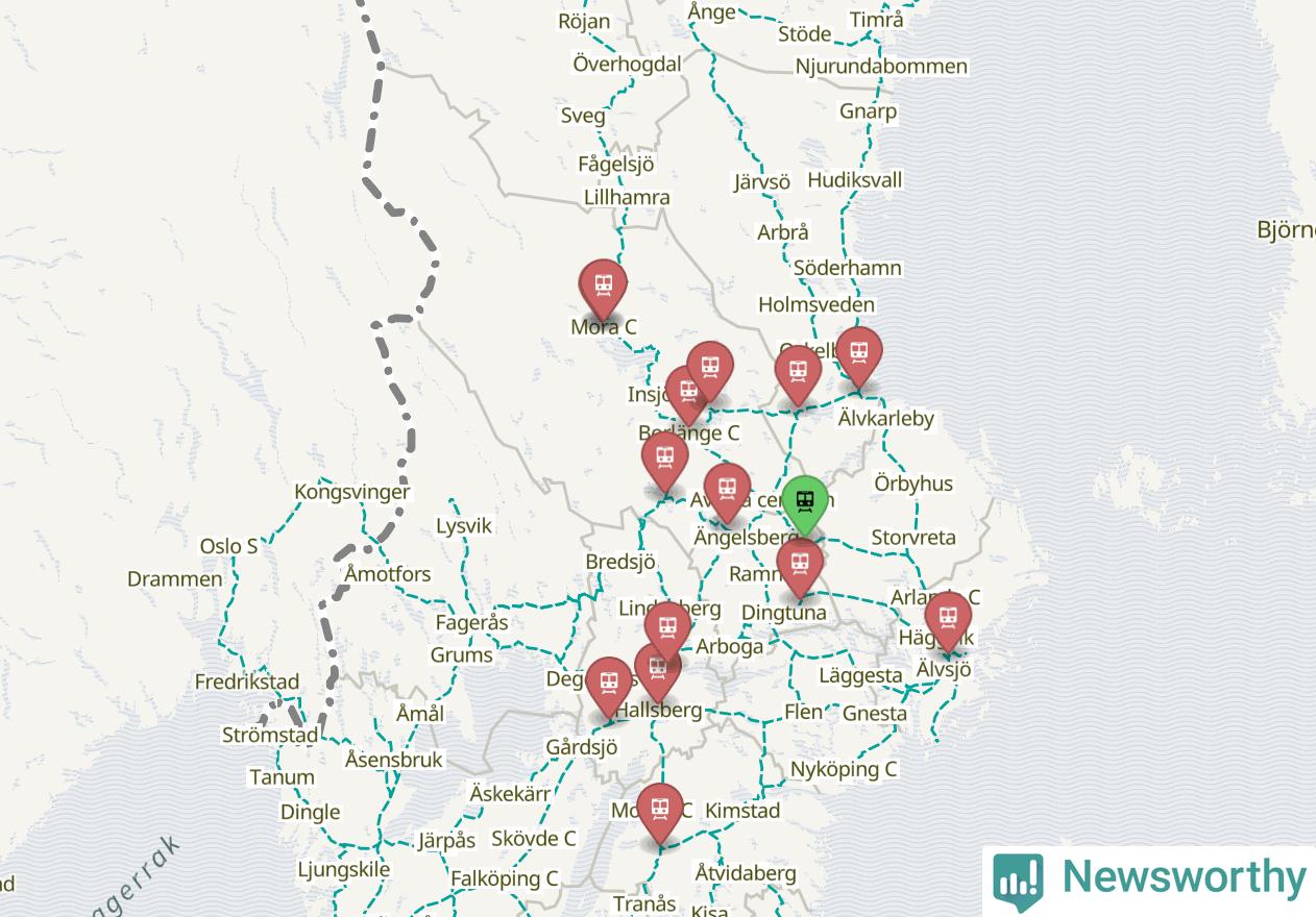 Kartdata från Mapbox, Newsworthy, OpenStreetMap och Trafikverket. Uppgifter om sträckor med passagerartrafik från jarnvag.net.