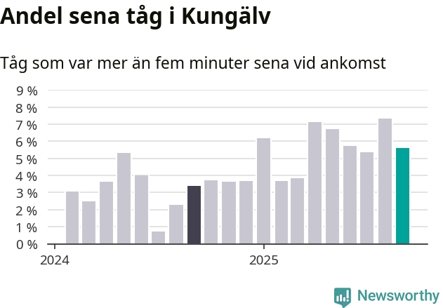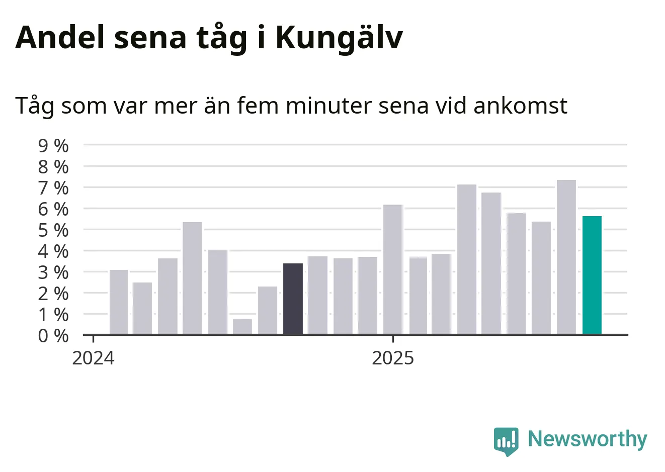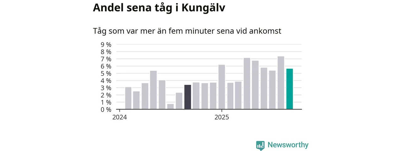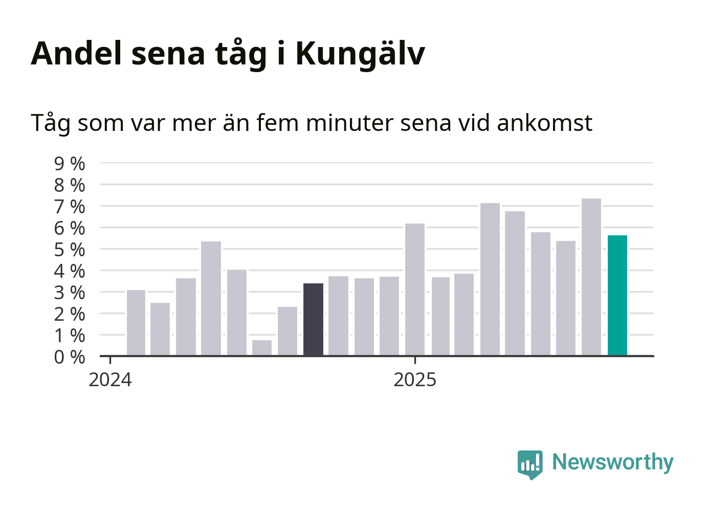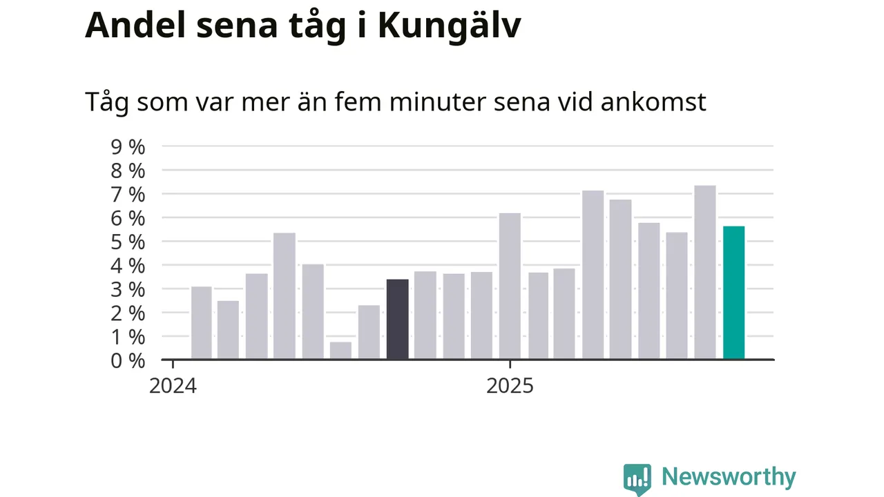 Sex procent kan jämföras med sju procent månaden innan, och tre procent i september 2024. Siffrorna bygger på realtidsinformation om tågavgångar och ankomster från Trafikverket, som Newsworthy löpande samlar in.