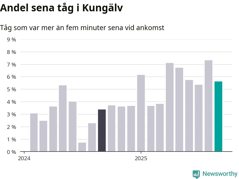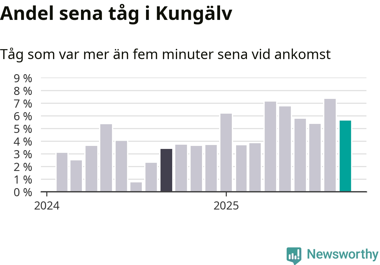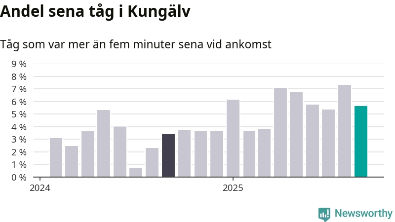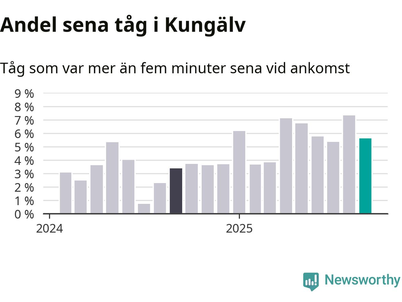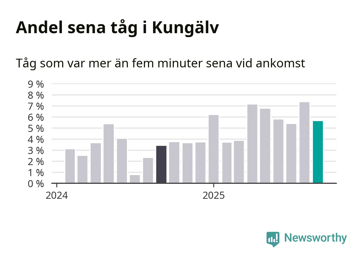Sex procent kan jämföras med sju procent månaden innan, och tre procent i september 2024. Siffrorna bygger på realtidsinformation om tågavgångar och ankomster från Trafikverket, som Newsworthy löpande samlar in.