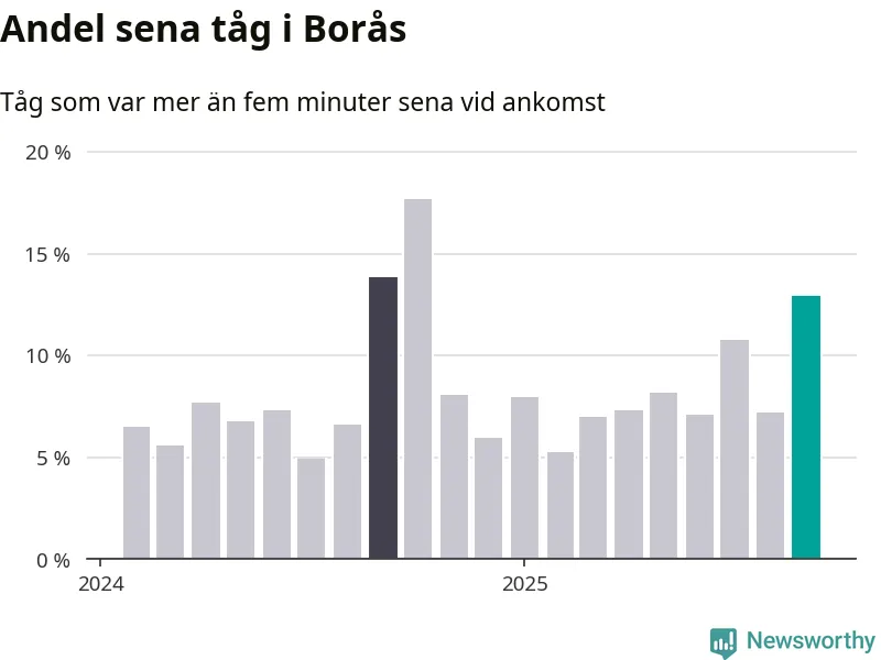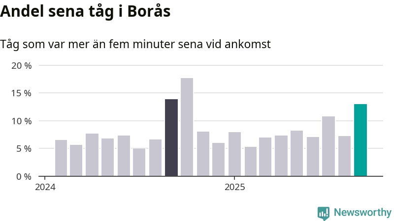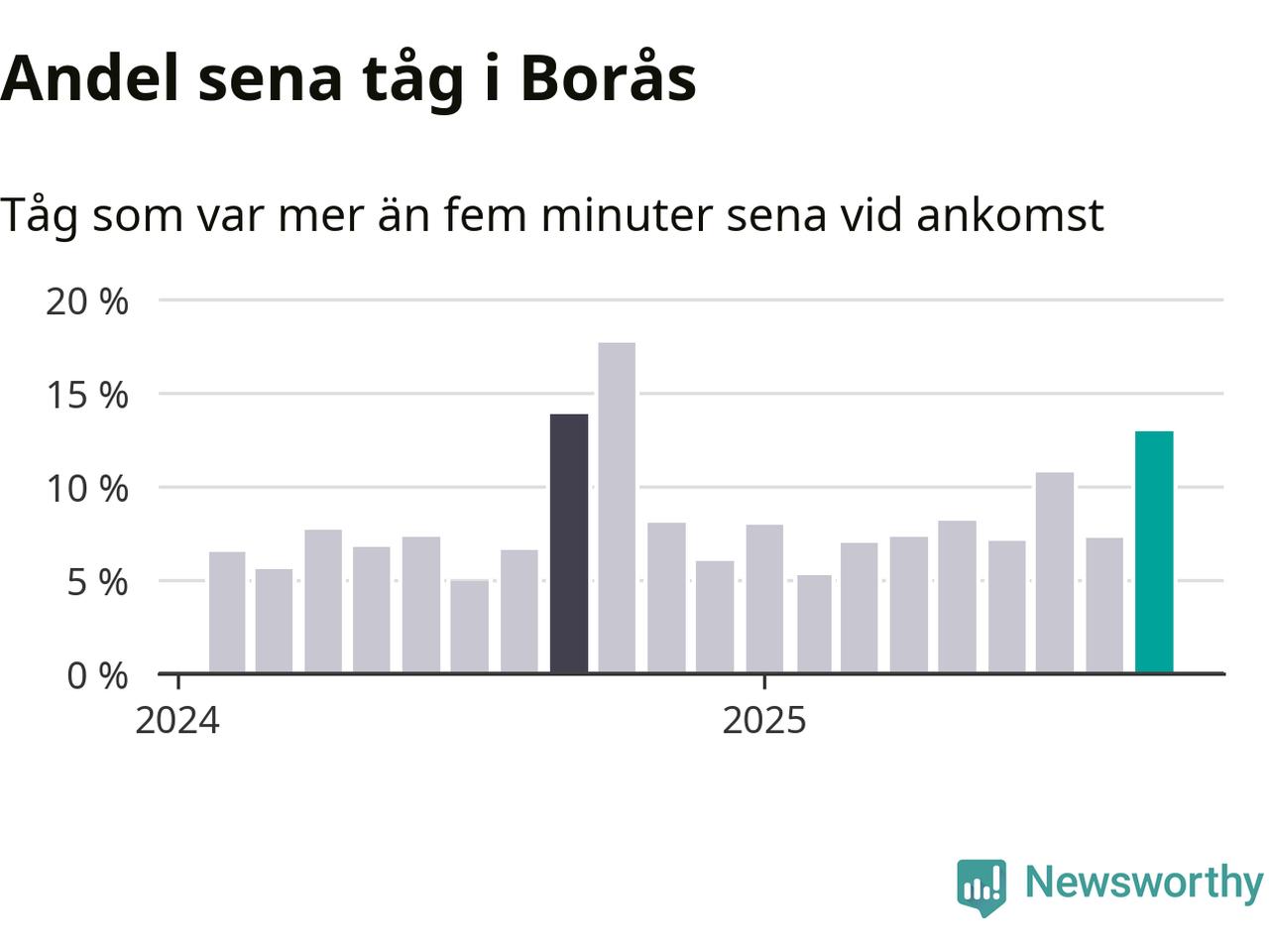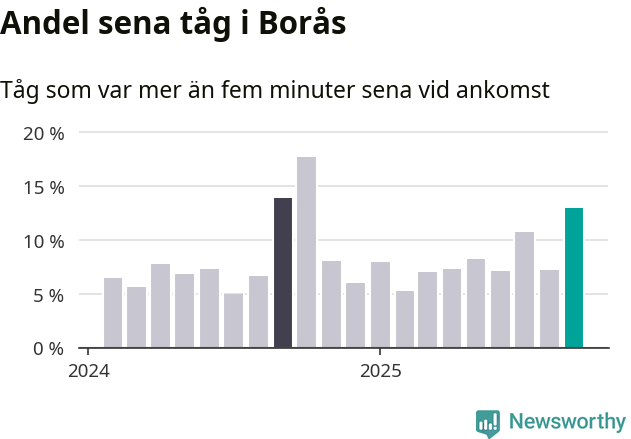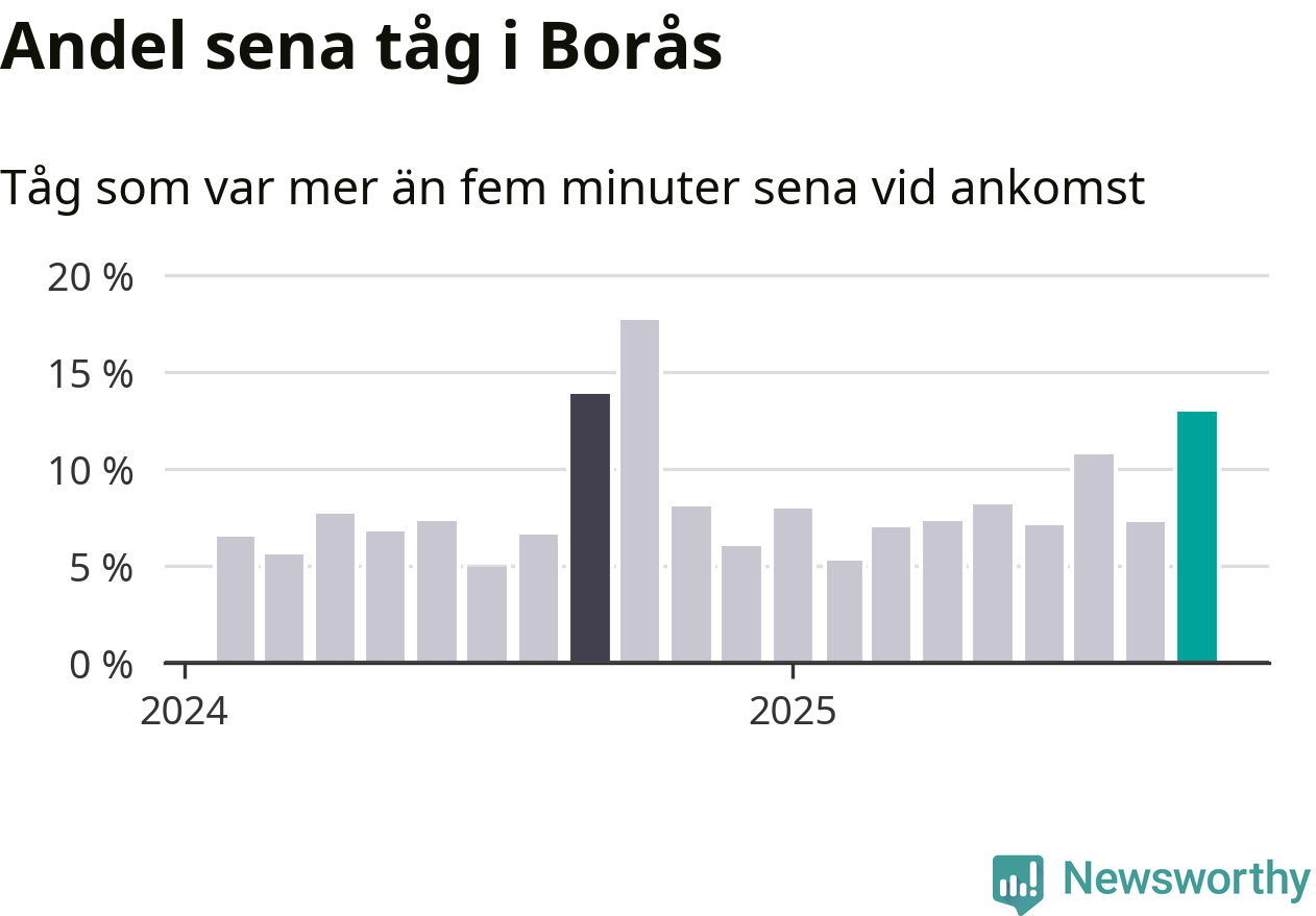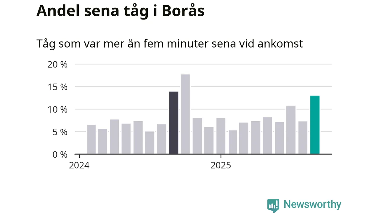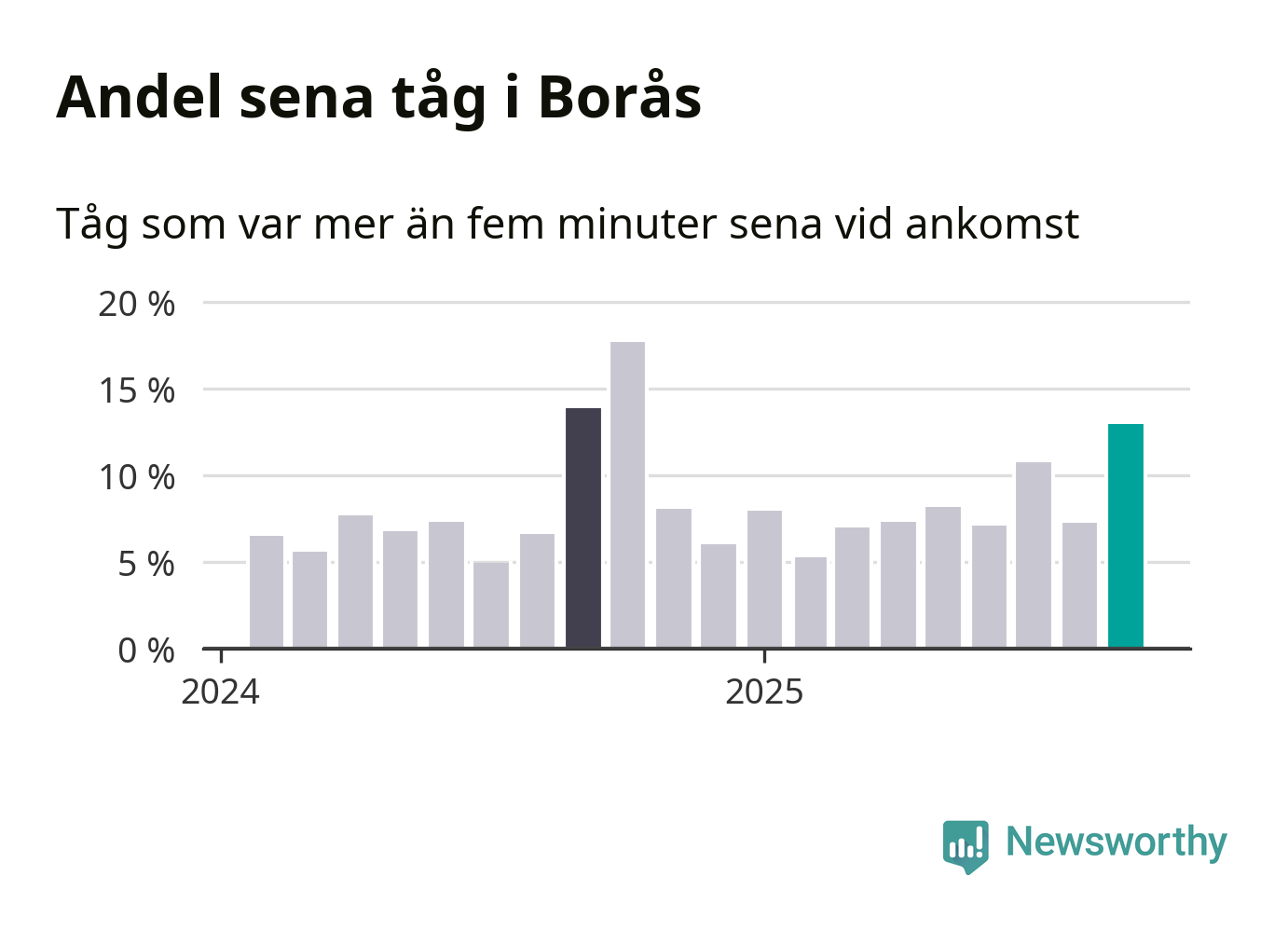 13 procent kan jämföras med sju procent månaden innan, och 14 procent i september 2024. Siffrorna bygger på realtidsinformation om tågavgångar och ankomster från Trafikverket, som Newsworthy löpande samlar in.