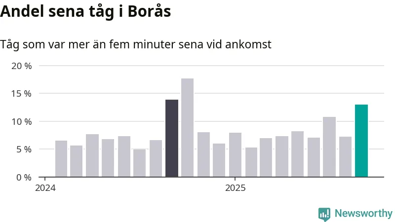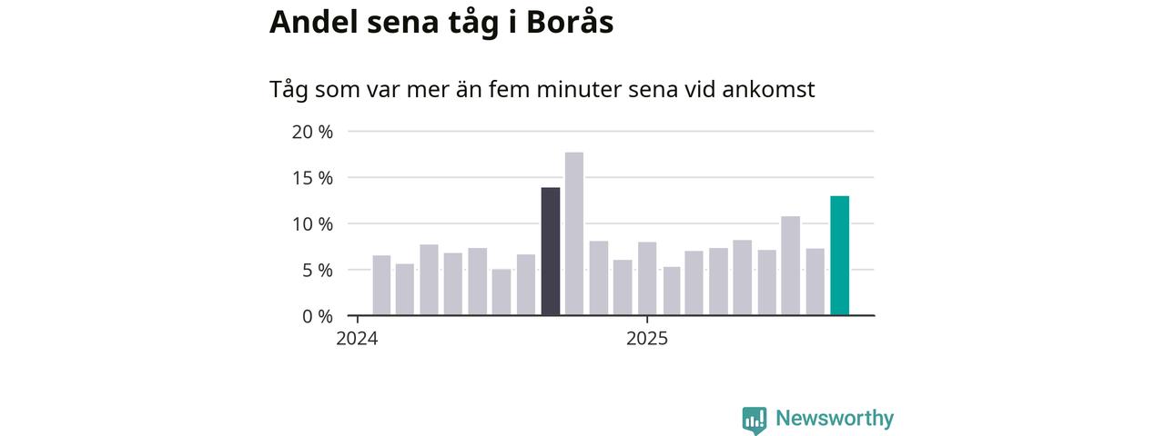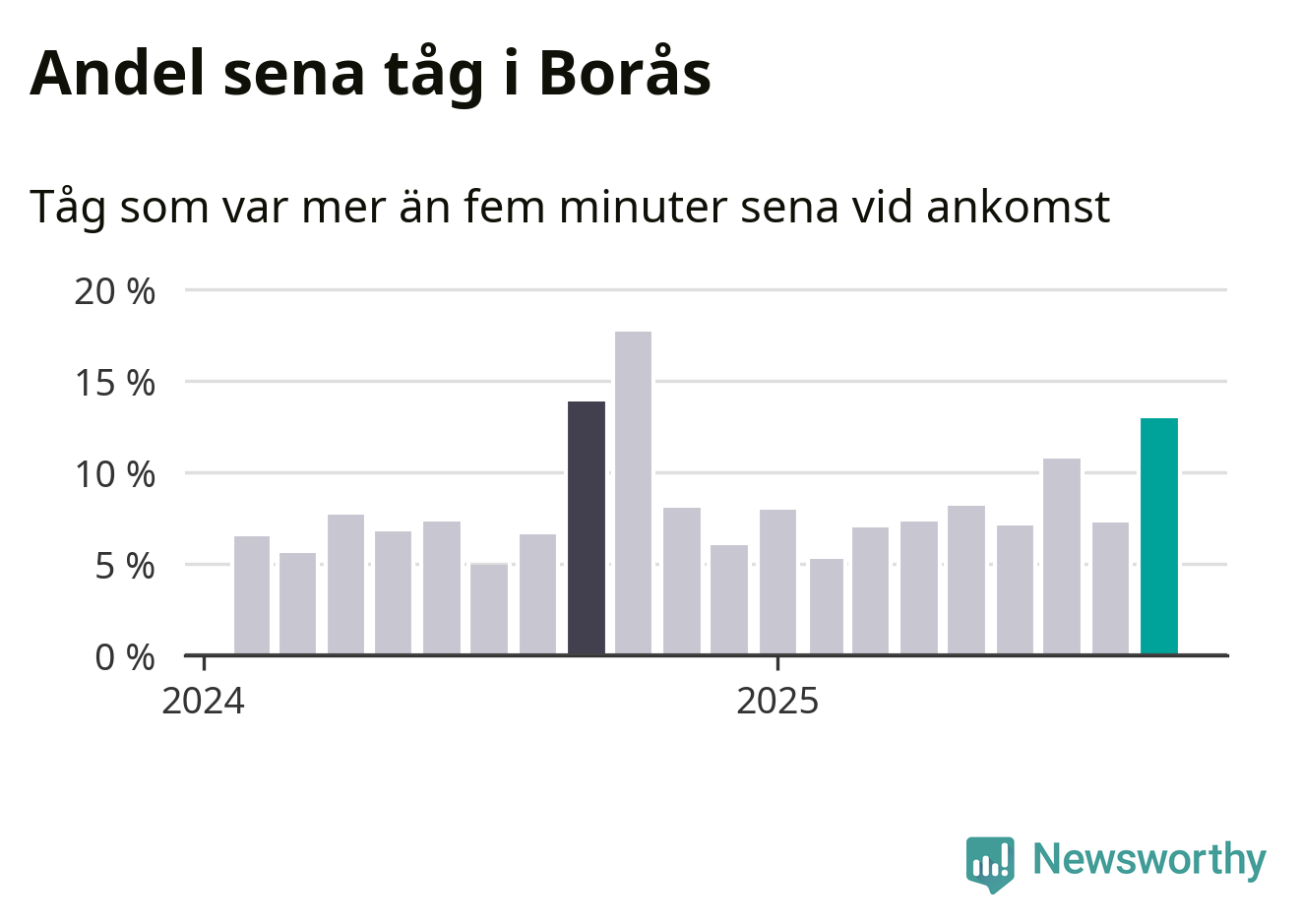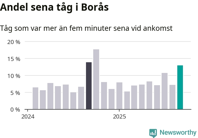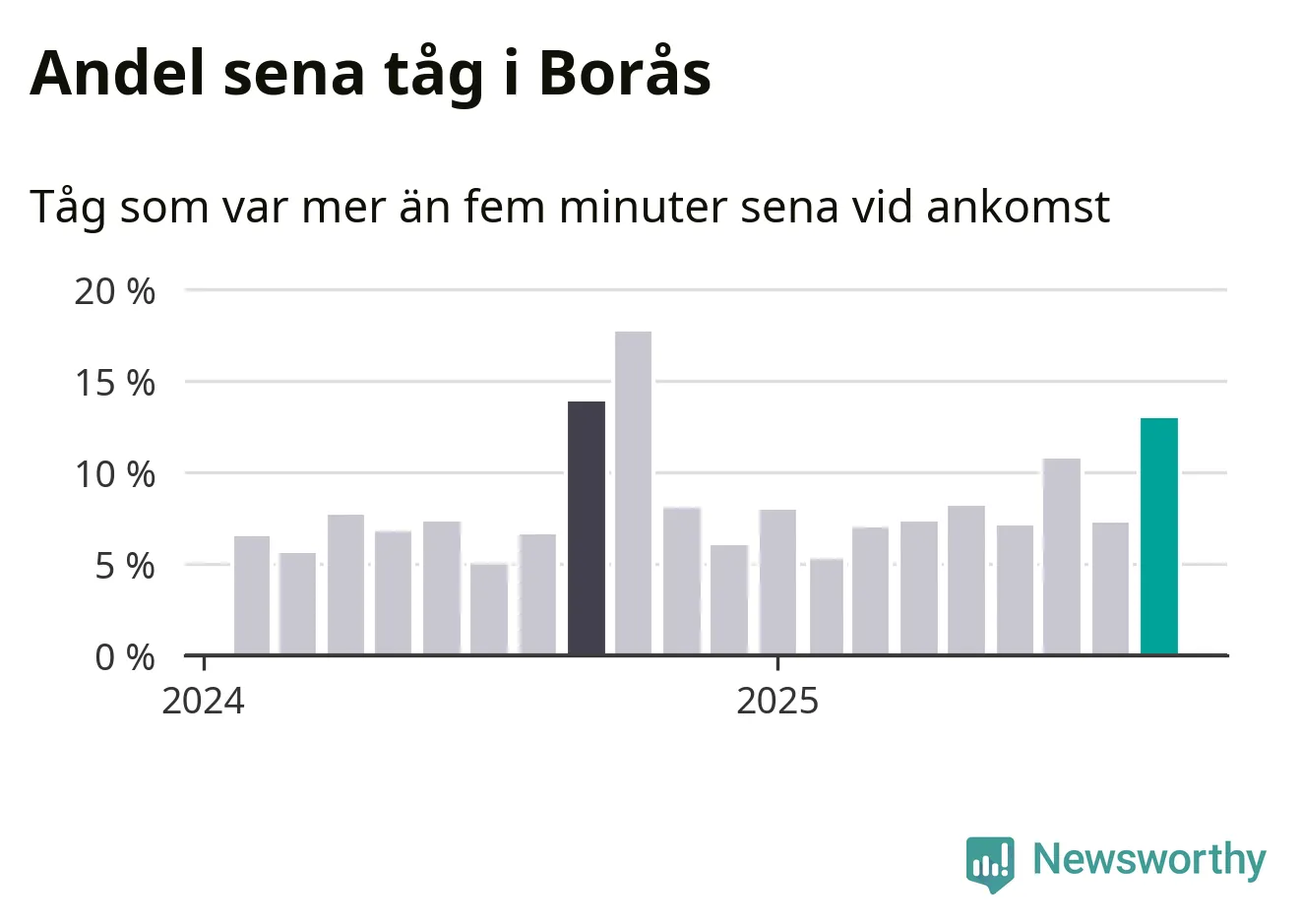 Av knappt 1 500 tåg som passerade någon av stationerna i Borås kommun i september var 191 mer än fem minuter sena. Det motsvarar 13 procent, en bit över den nationella målsättningen som säger att inte mer än fem procent av tågen ska vara sena.
