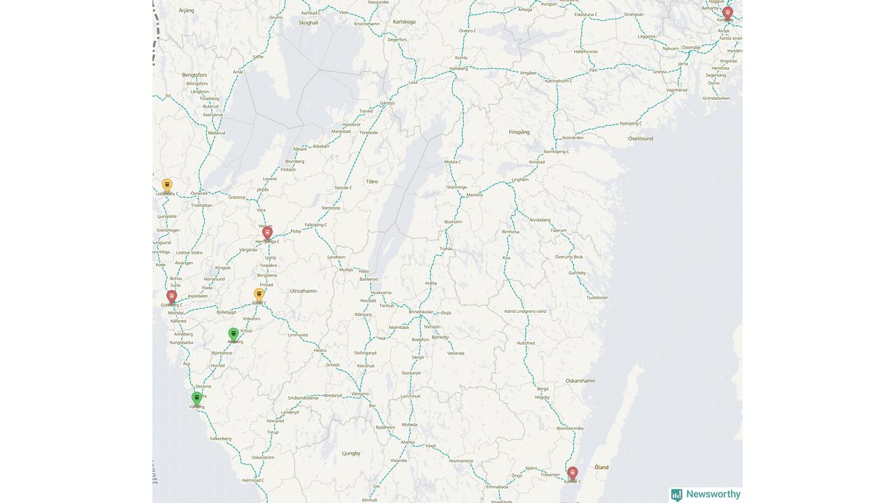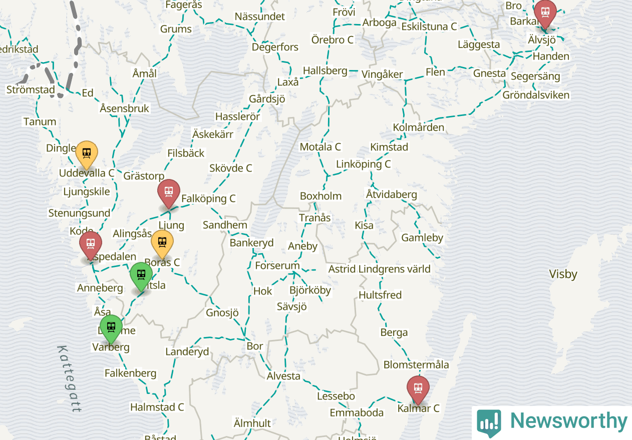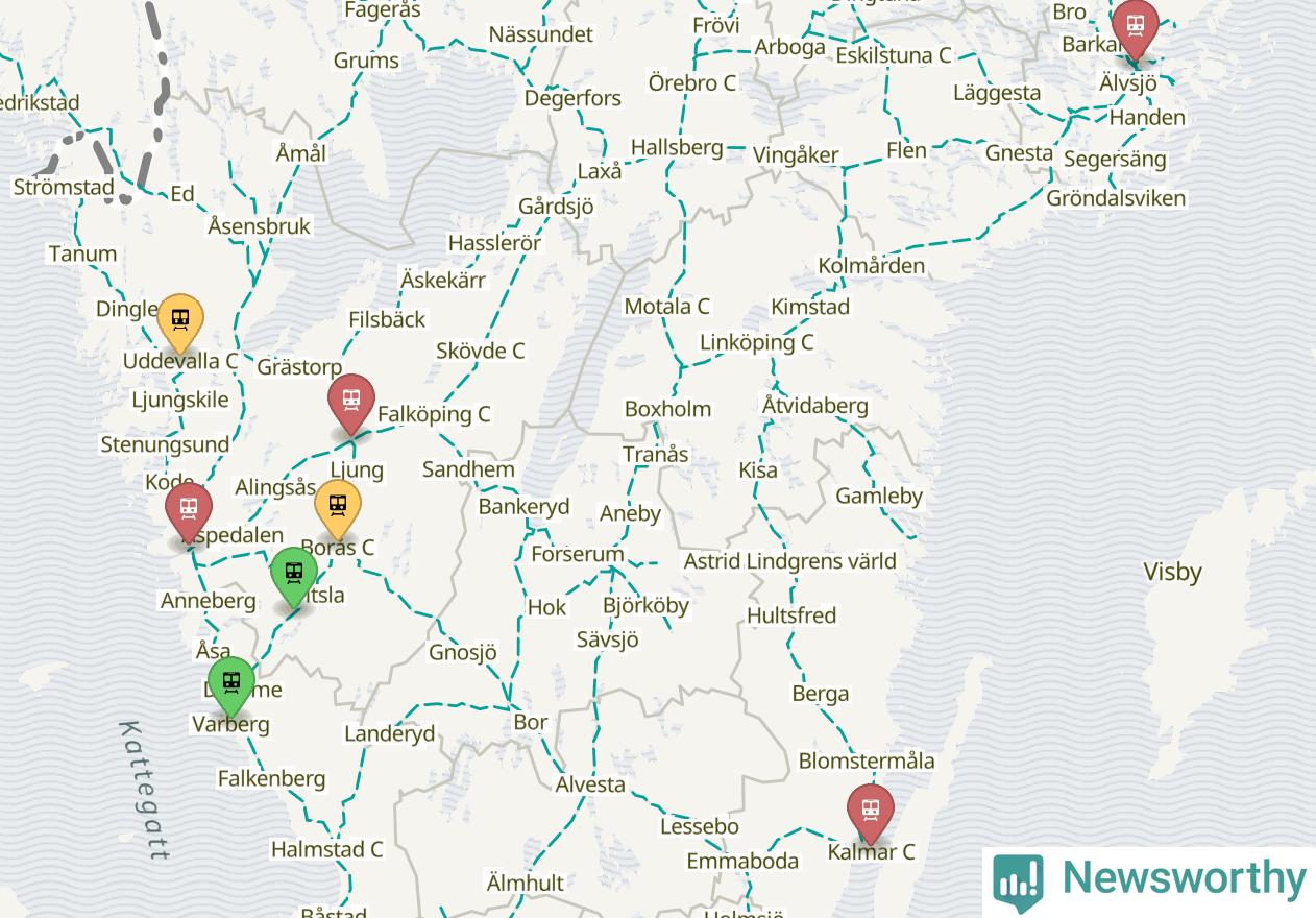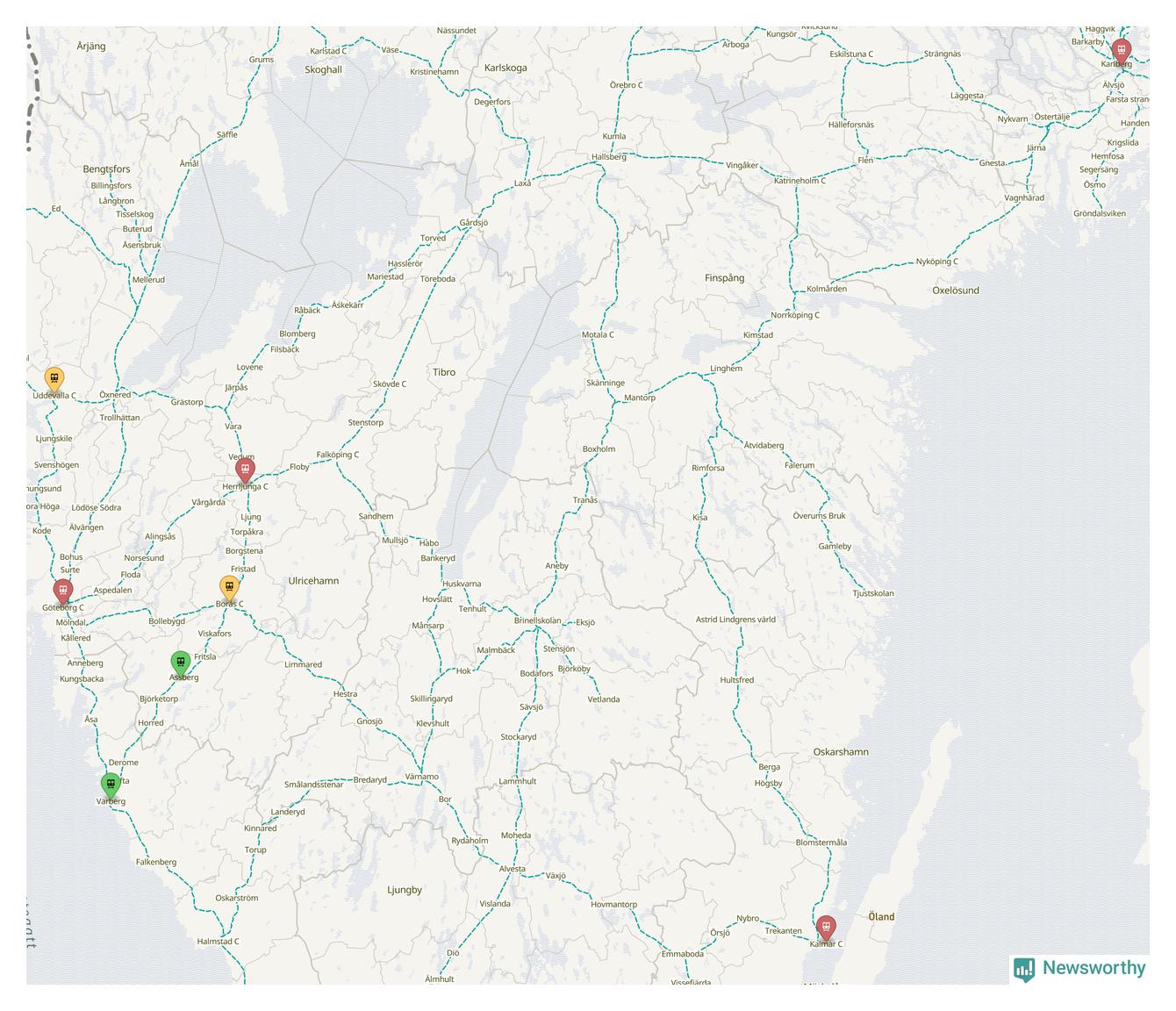Kartdata från Mapbox, Newsworthy, OpenStreetMap och Trafikverket. Uppgifter om sträckor med passagerartrafik från jarnvag.net.