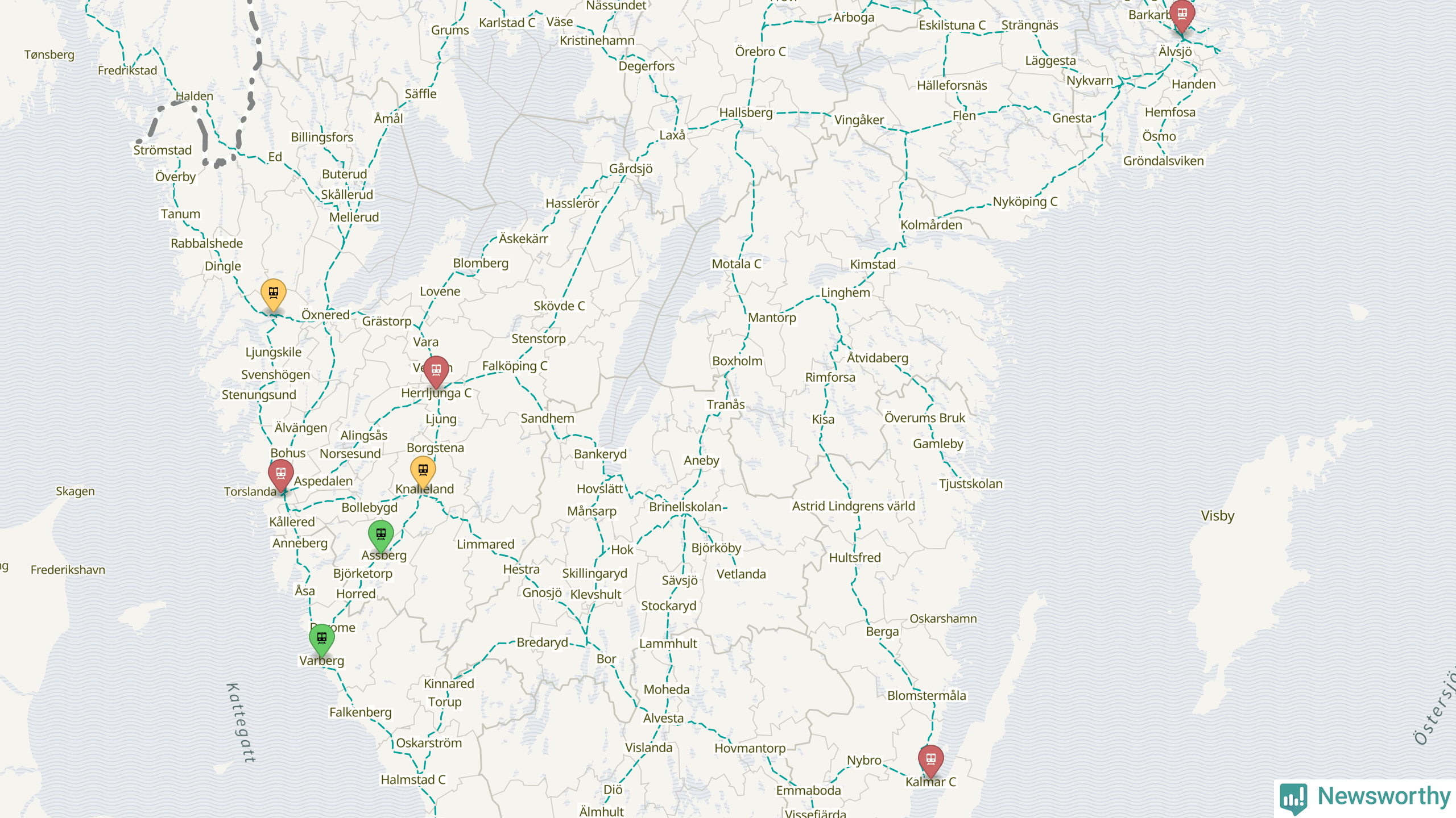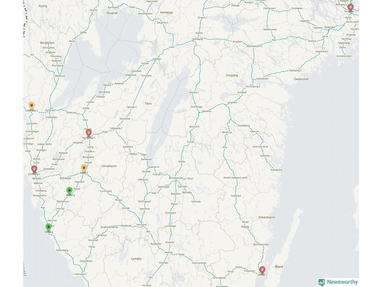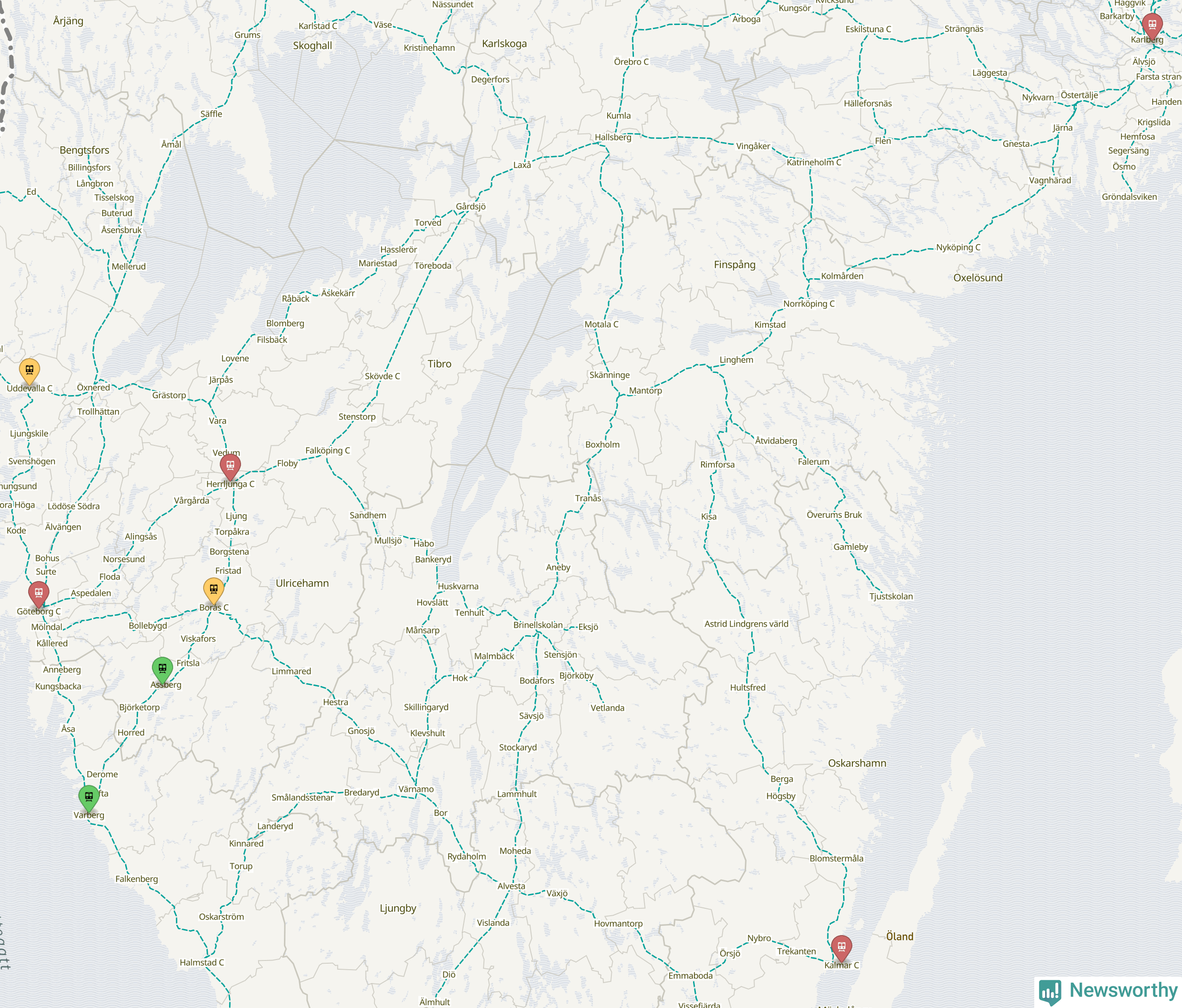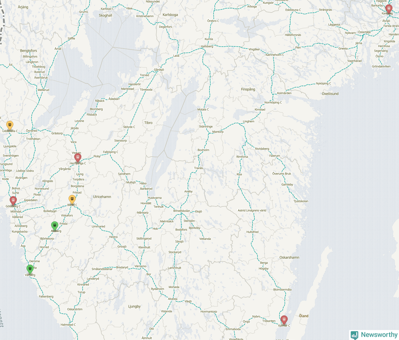 Kartdata från Mapbox, Newsworthy, OpenStreetMap och Trafikverket. Uppgifter om sträckor med passagerartrafik från jarnvag.net.