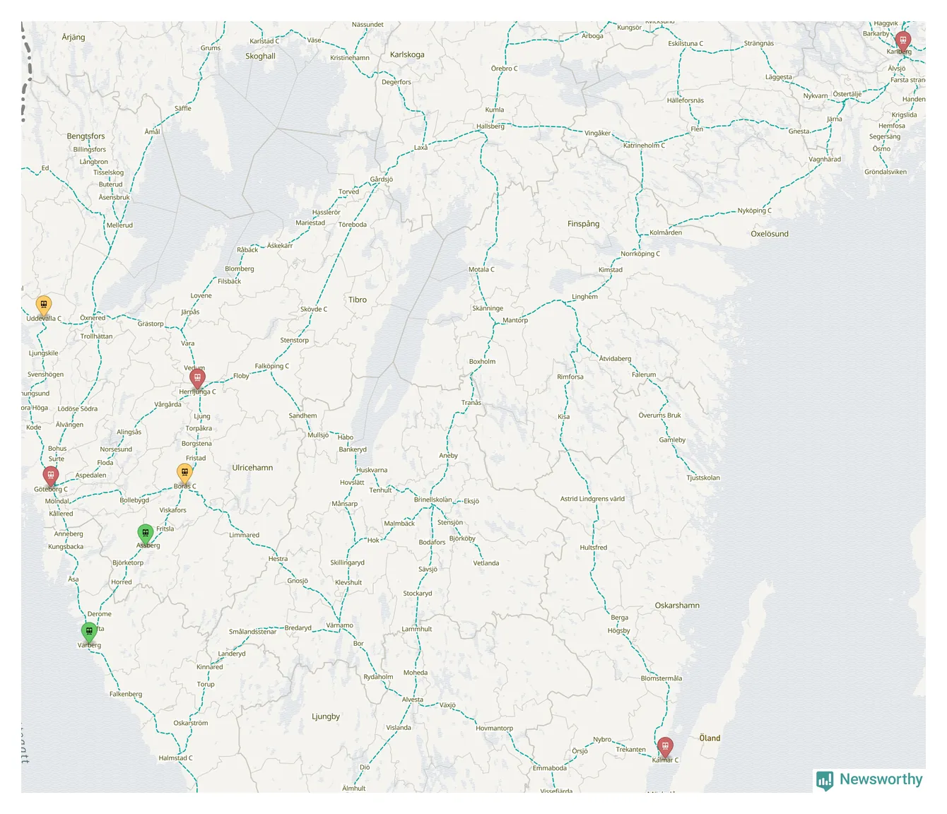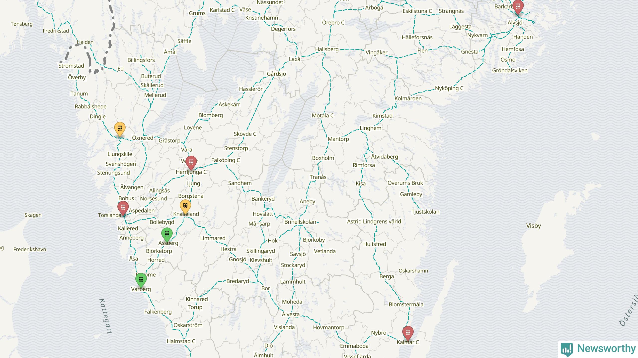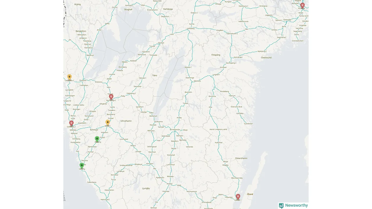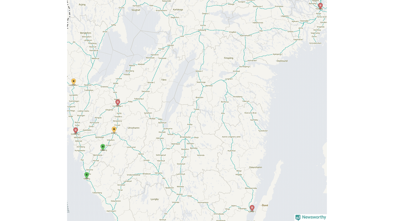 Kartdata från Mapbox, Newsworthy, OpenStreetMap och Trafikverket. Uppgifter om sträckor med passagerartrafik från jarnvag.net.