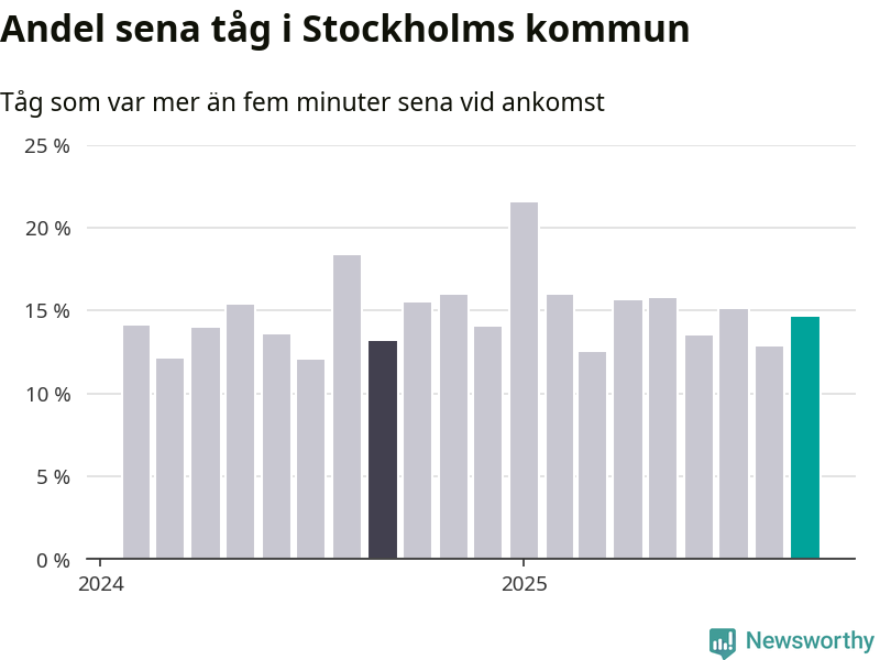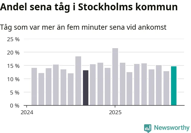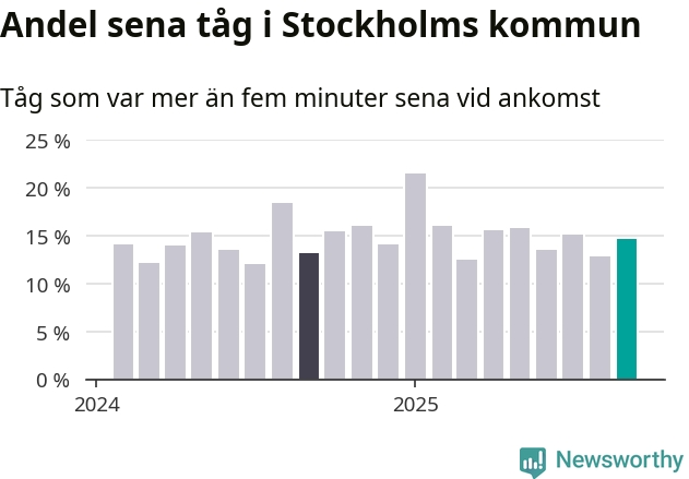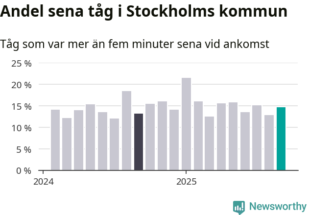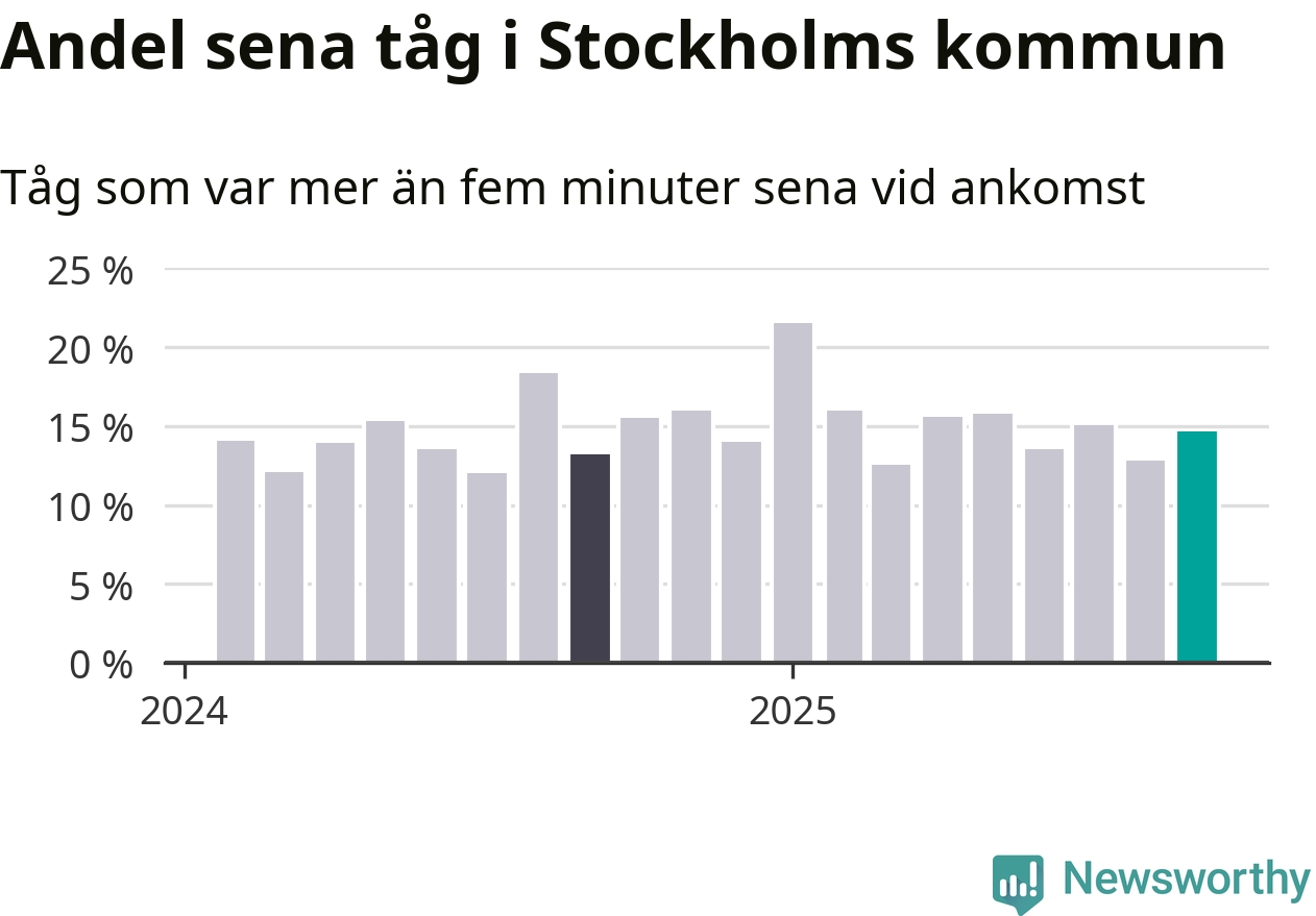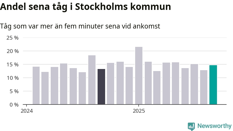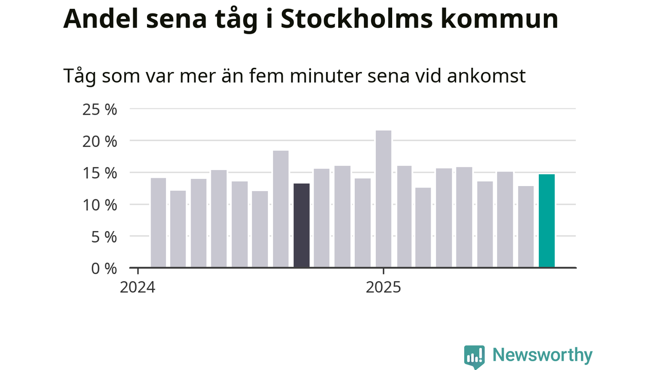 15 procent kan jämföras med 13 procent månaden innan, och 13 procent i september 2024. Siffrorna bygger på realtidsinformation om tågavgångar och ankomster från Trafikverket, som Newsworthy löpande samlar in.