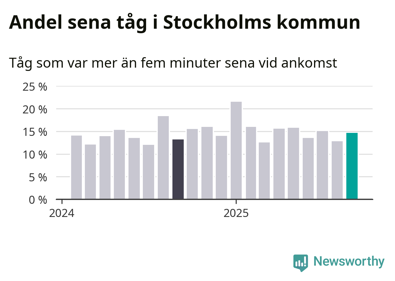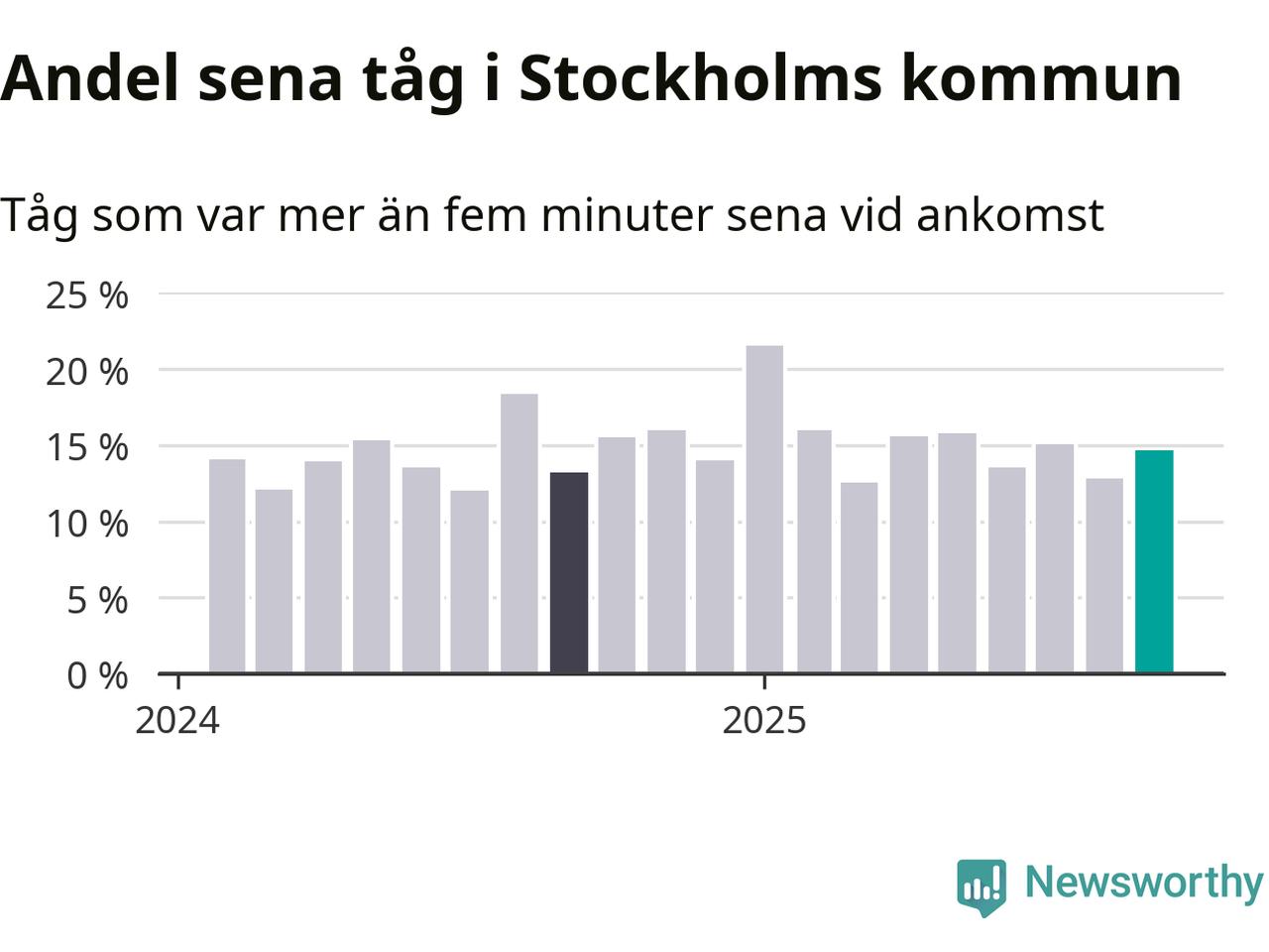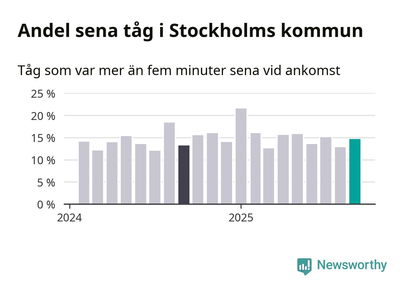 15 procent kan jämföras med 13 procent månaden innan, och 13 procent i september 2024. Siffrorna bygger på realtidsinformation om tågavgångar och ankomster från Trafikverket, som Newsworthy löpande samlar in.
