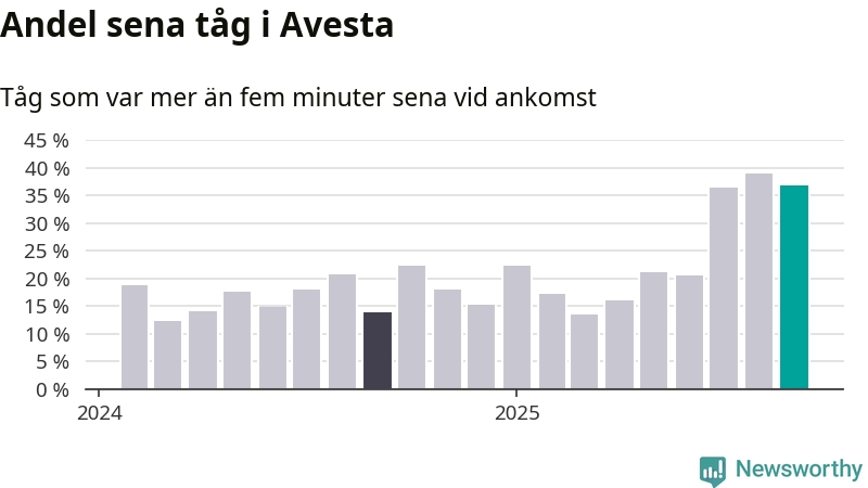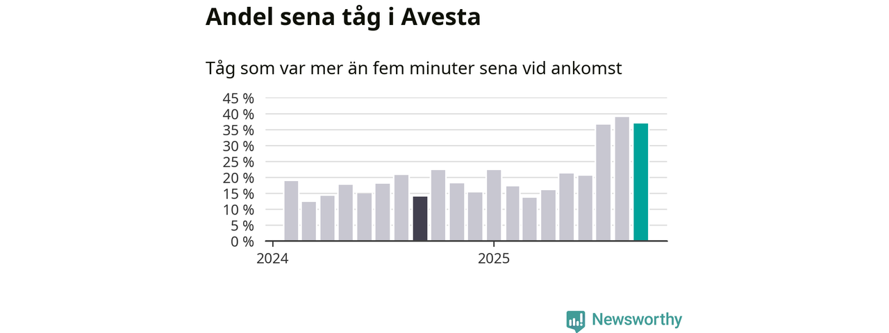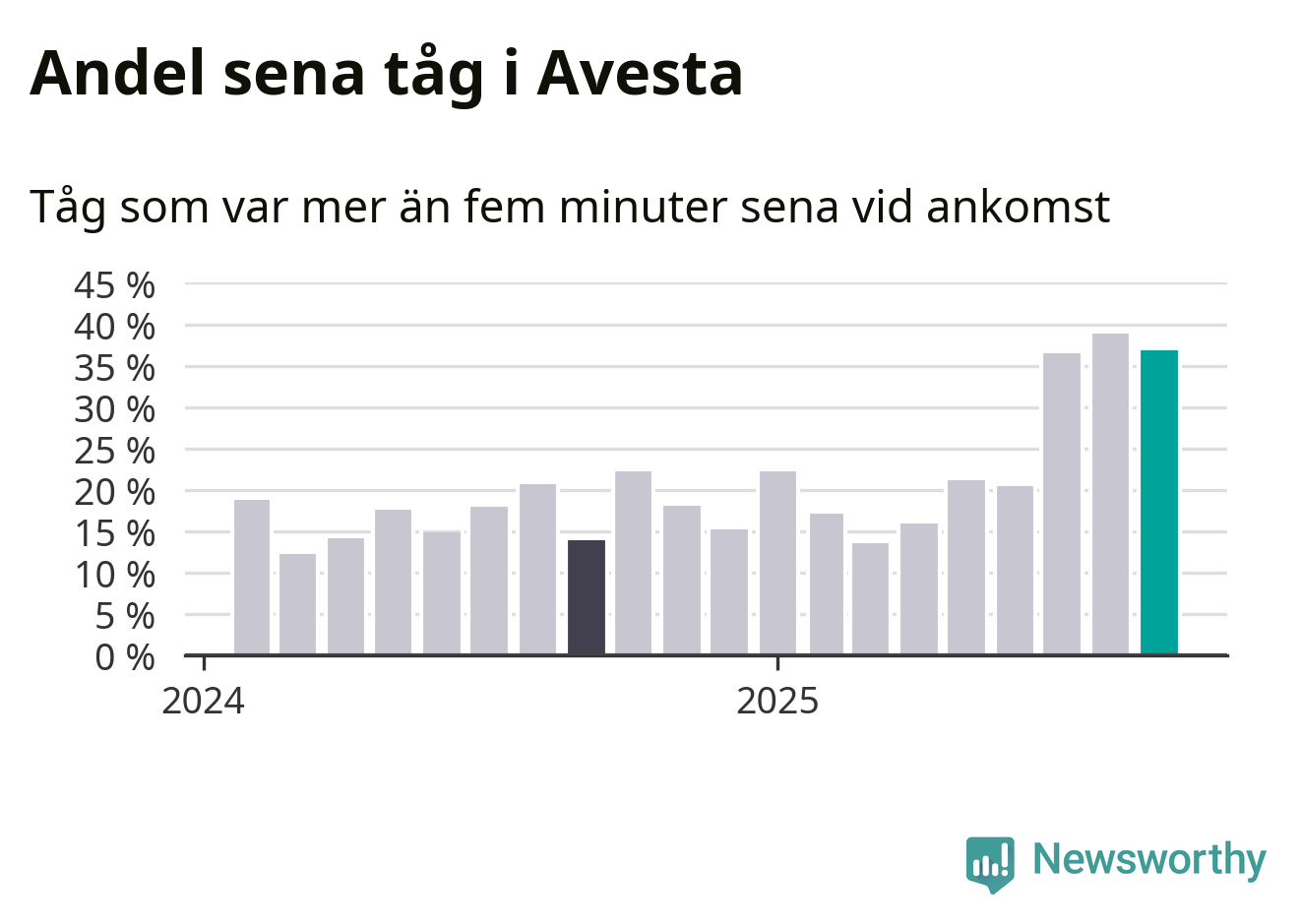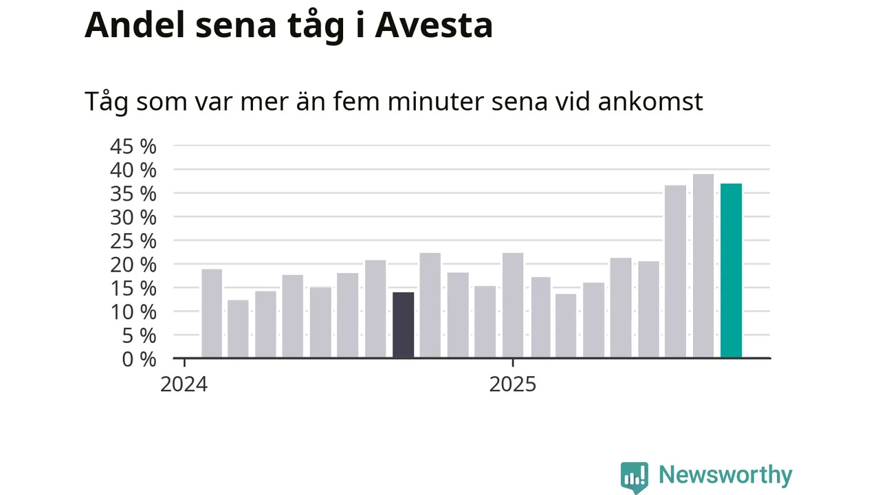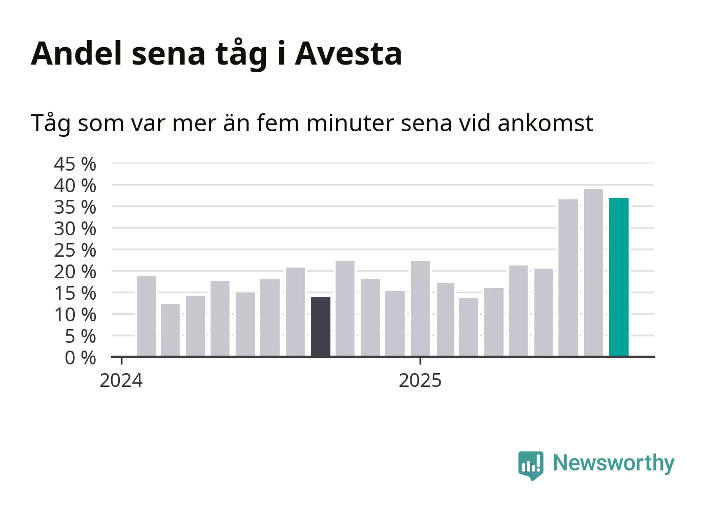 37 procent kan jämföras med 39 procent månaden innan, och 14 procent i september 2024. Siffrorna bygger på realtidsinformation om tågavgångar och ankomster från Trafikverket, som Newsworthy löpande samlar in.