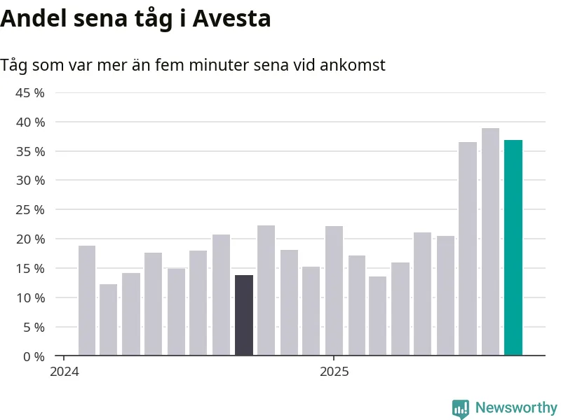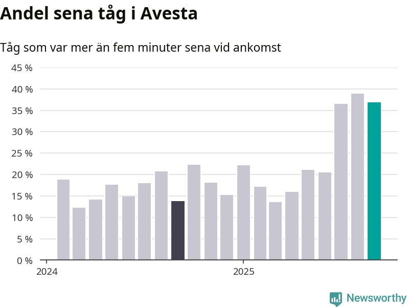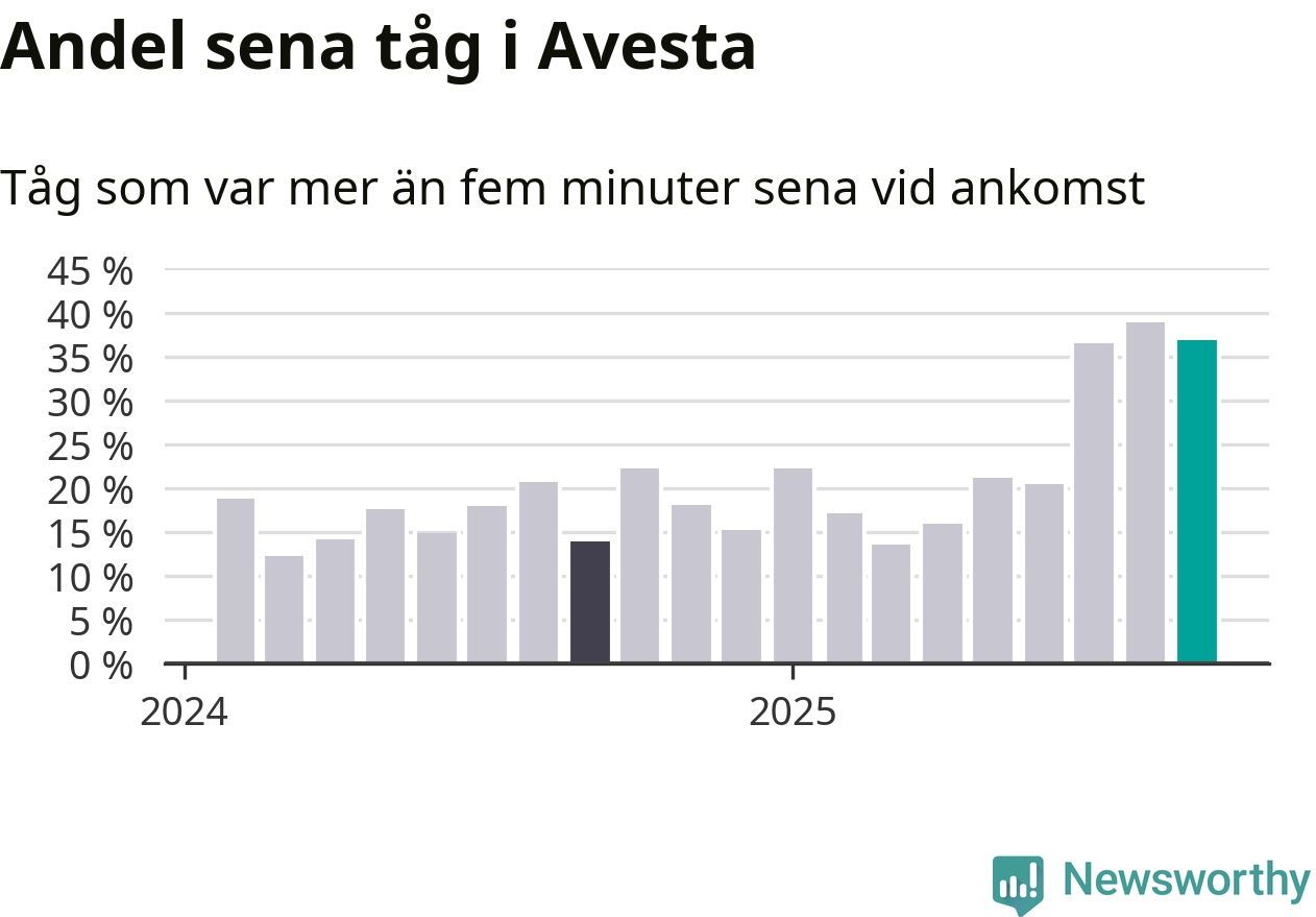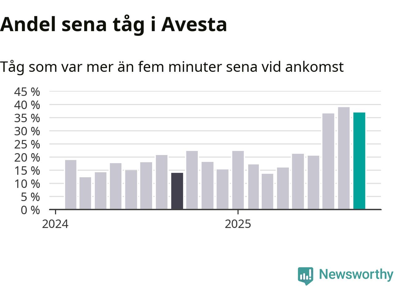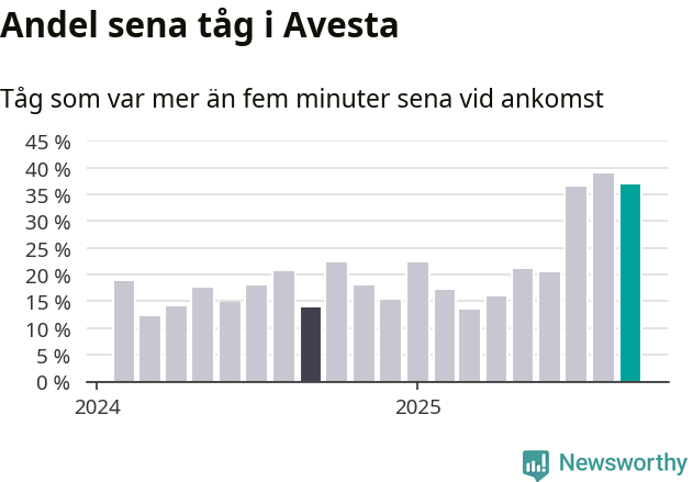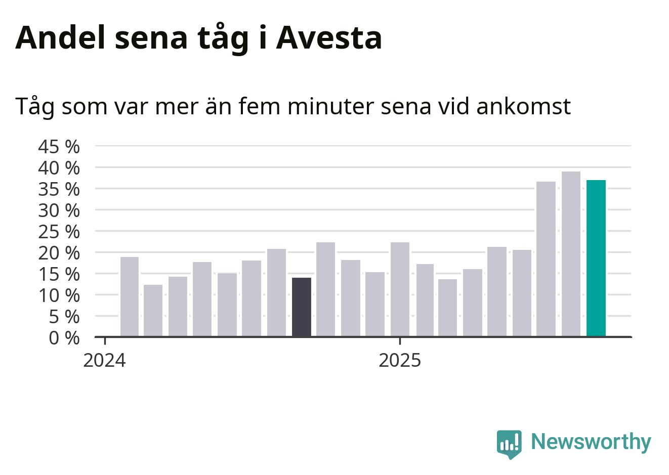 37 procent kan jämföras med 39 procent månaden innan, och 14 procent i september 2024. Siffrorna bygger på realtidsinformation om tågavgångar och ankomster från Trafikverket, som Newsworthy löpande samlar in.