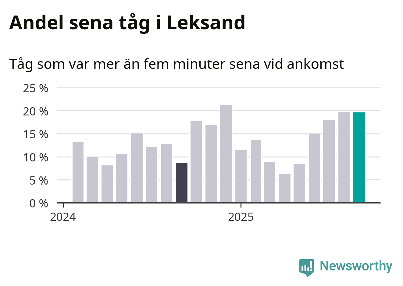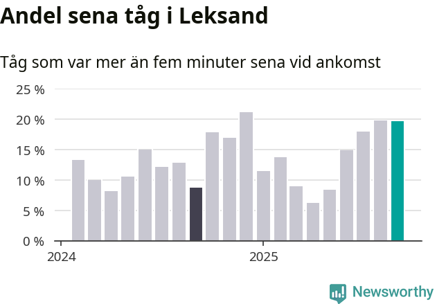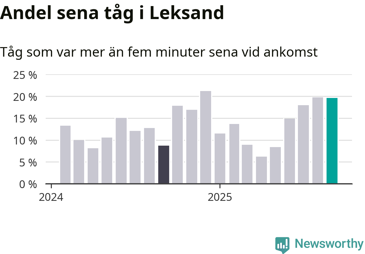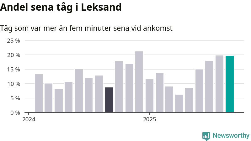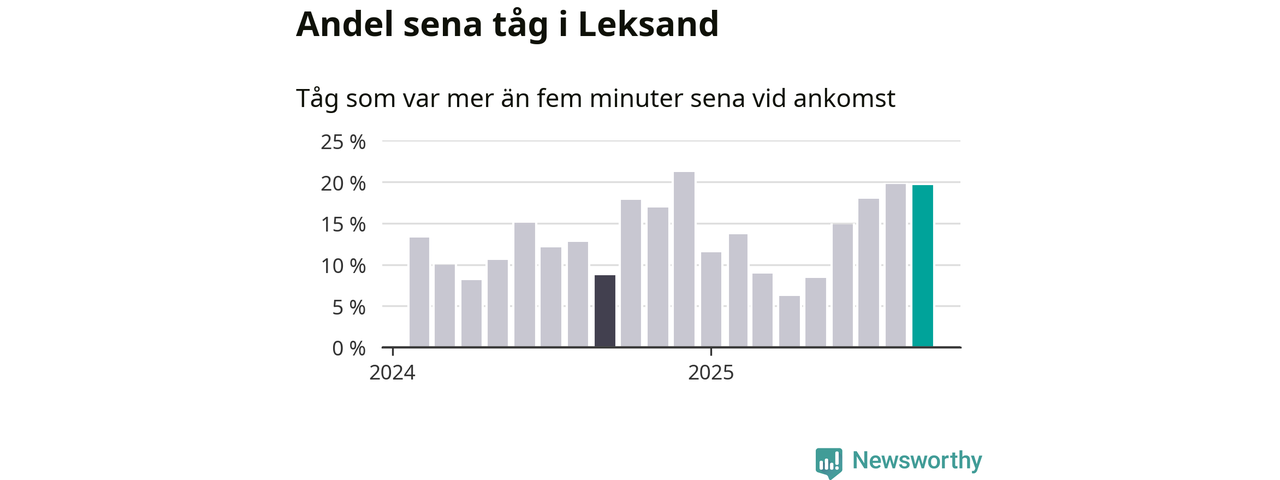 20 procent är marginellt mindre än månaden innan, och kan jämföras med nio procent i september 2024. Siffrorna bygger på realtidsinformation om tågavgångar och ankomster från Trafikverket, som Newsworthy löpande samlar in.