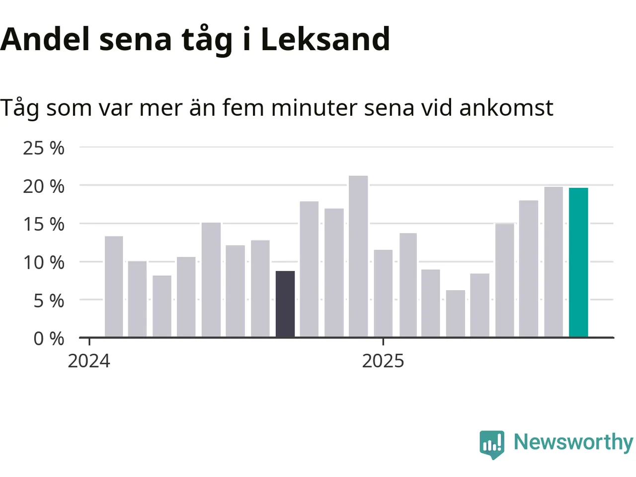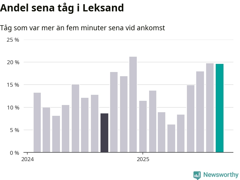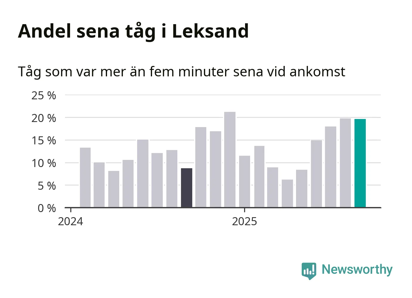 20 procent är marginellt mindre än månaden innan, och kan jämföras med nio procent i september 2024. Siffrorna bygger på realtidsinformation om tågavgångar och ankomster från Trafikverket, som Newsworthy löpande samlar in.