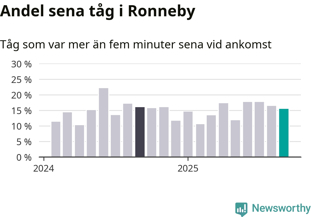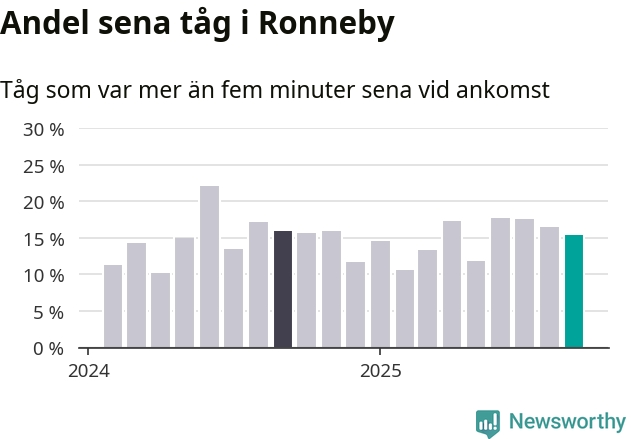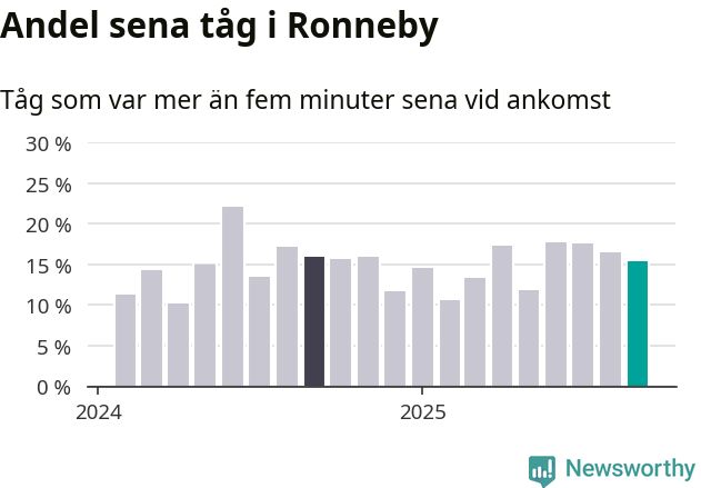 15 procent kan jämföras med 16 procent månaden innan, och 16 procent i september 2024. September är den tredje månaden i rad med minskande förseningar i Ronneby. Siffrorna bygger på realtidsinformation om tågavgångar och ankomster från Trafikverket, som Newsworthy löpande samlar in.